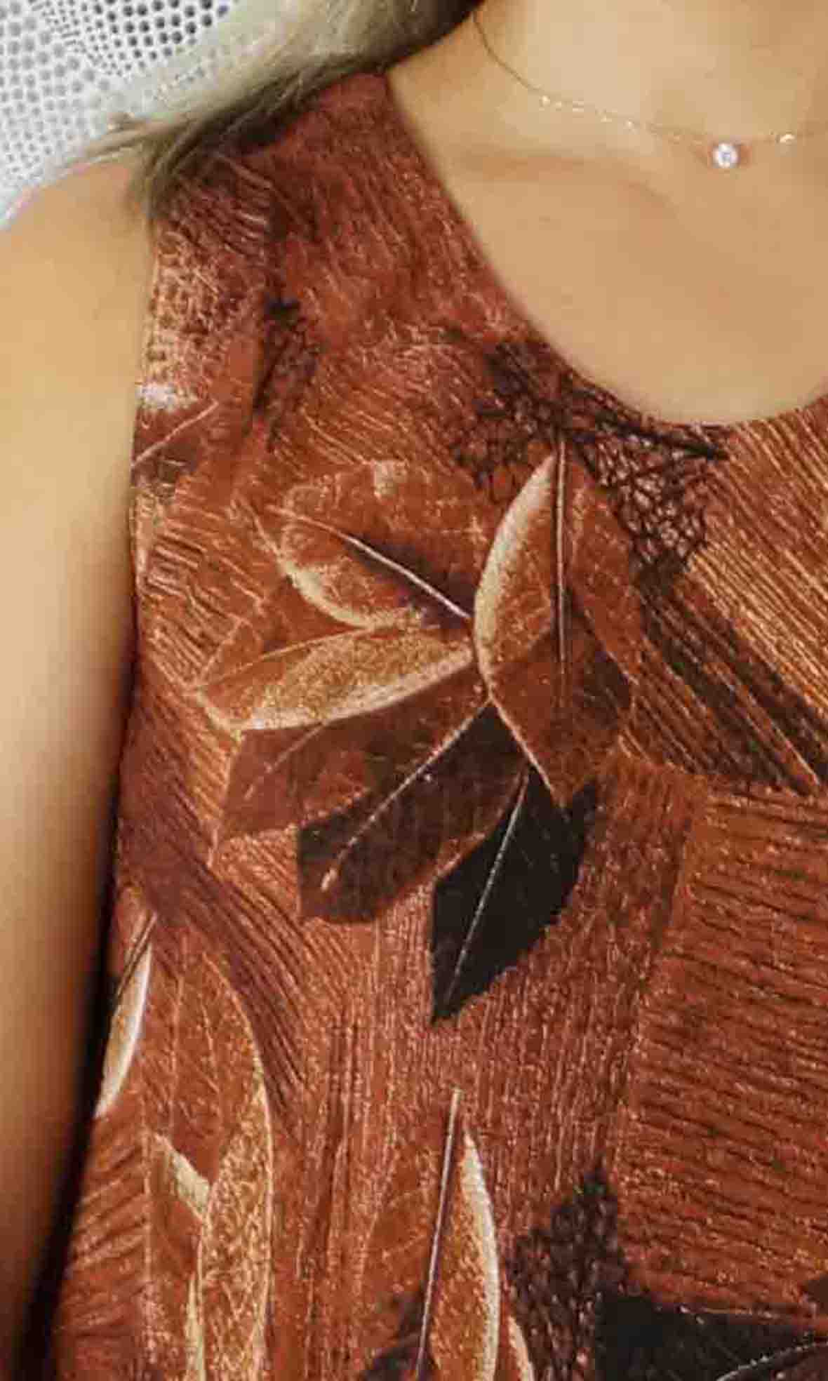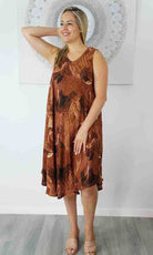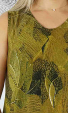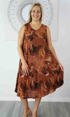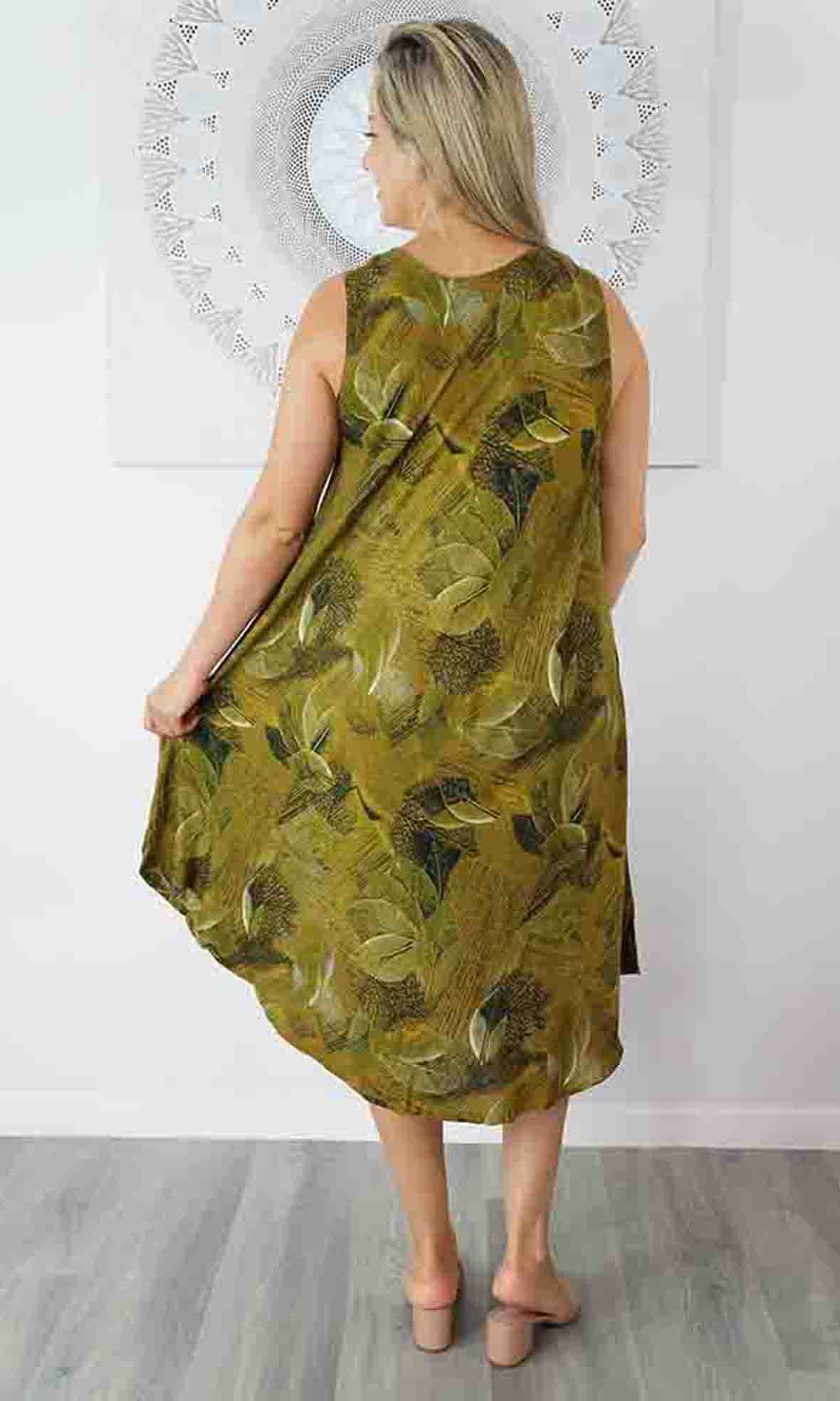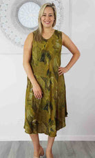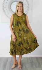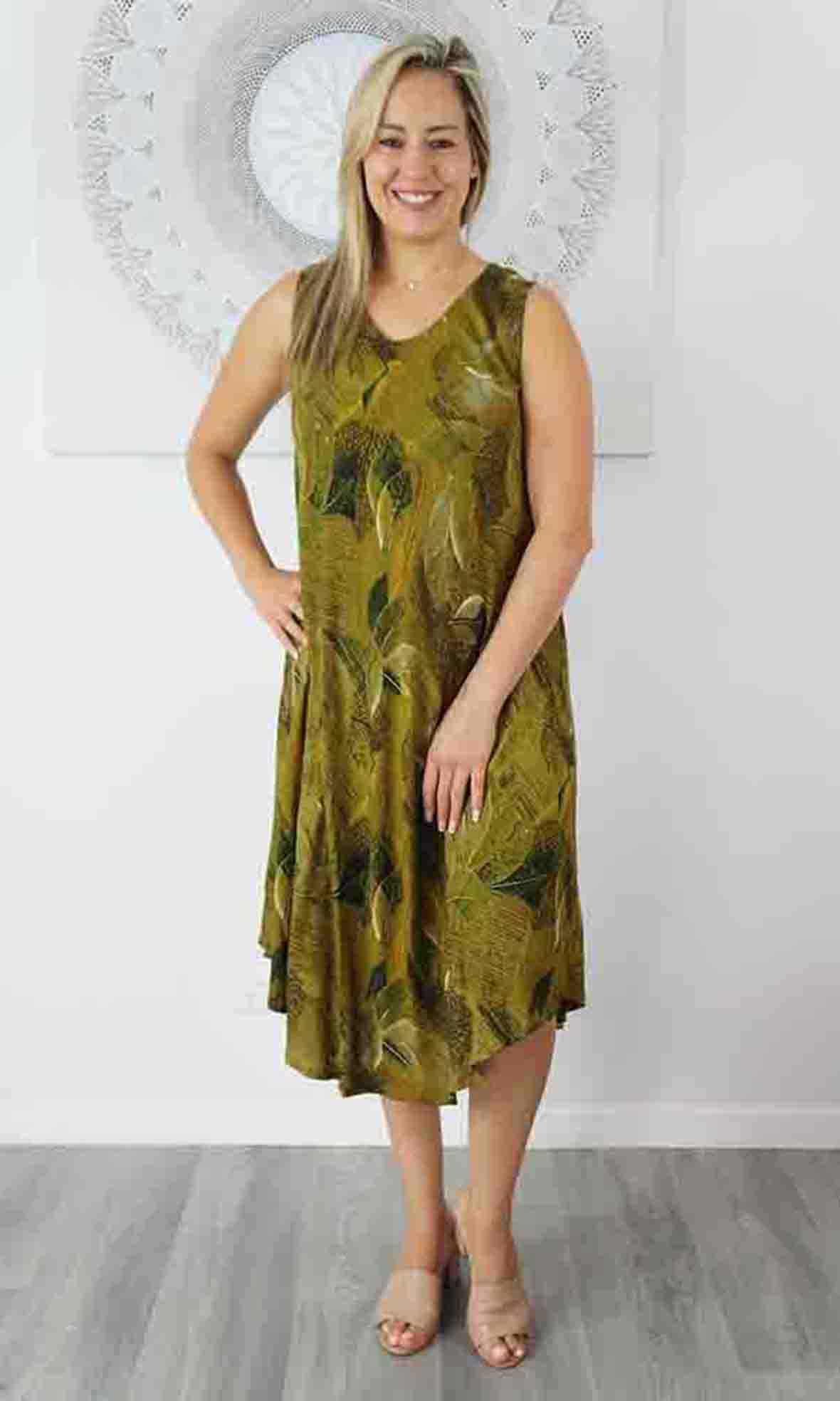 Cool and comfortable sleeveless dress in lovely pre shrunk crinkle rayon. Fabric is cut of the bias to assist the garment to fit many body shapes.