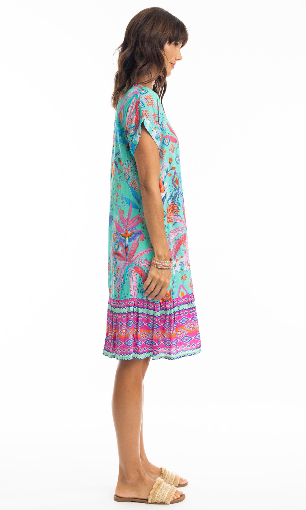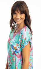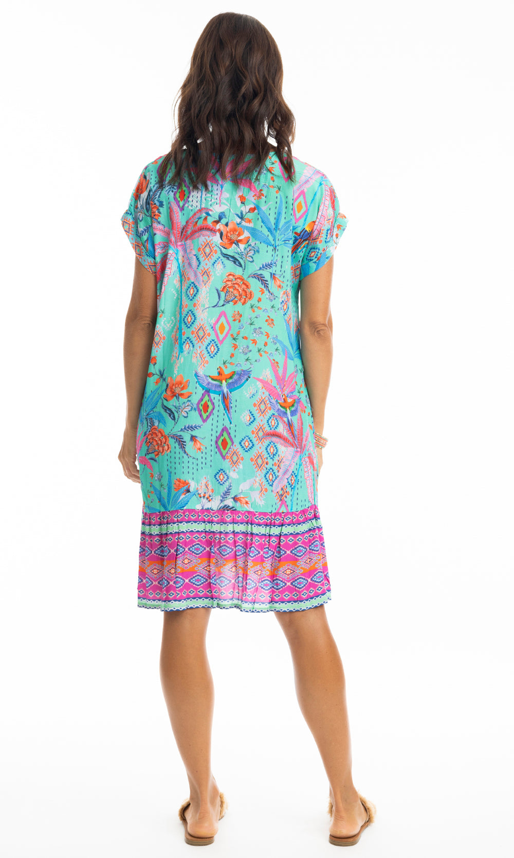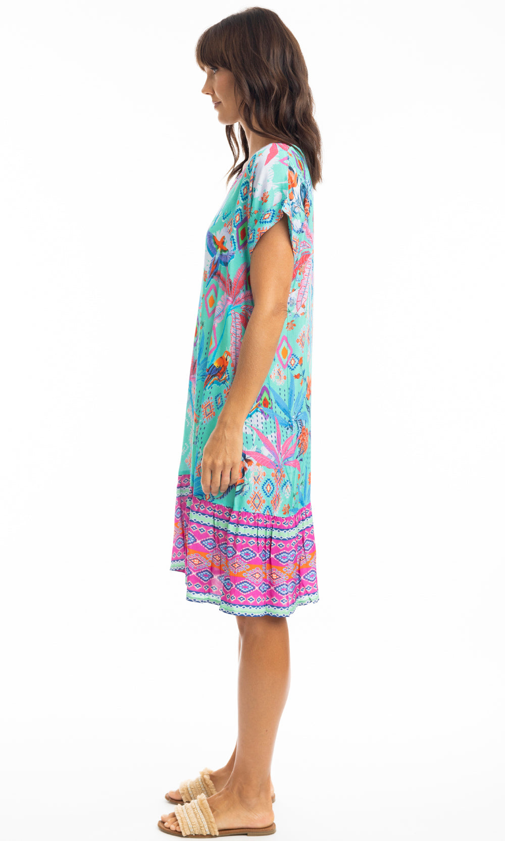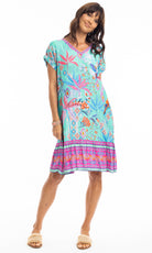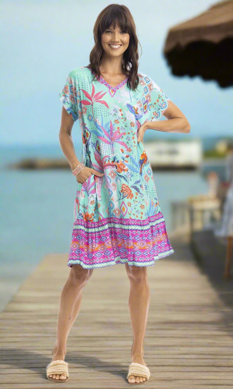 Soak up the sun in our Marina shift dress. This knee-length dress features a flattering V-neck, elegant cap sleeves, and a frilled hem. Lightweight and versatile, it's perfect for beach strolls or lounging by the pool. Style it up or down for effortless style in the sun.