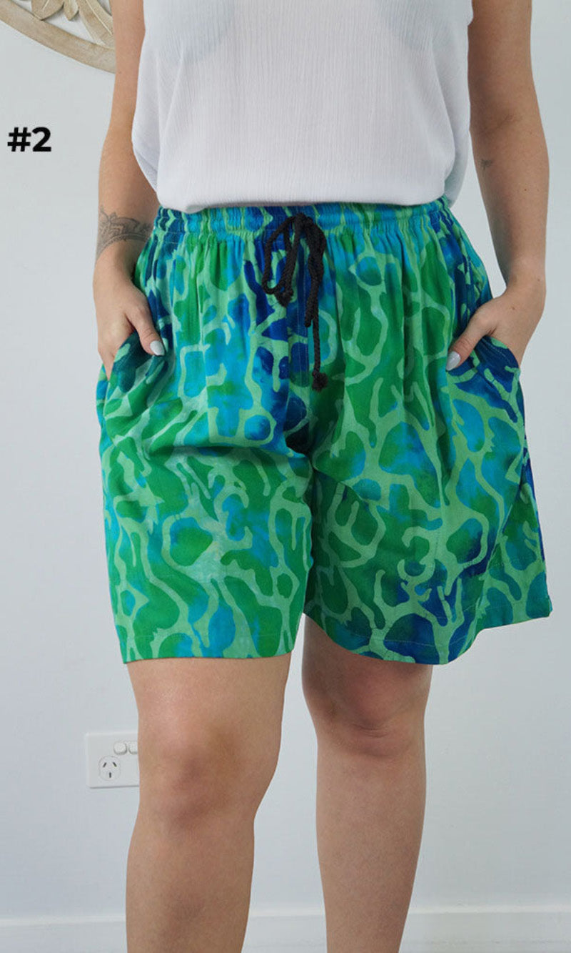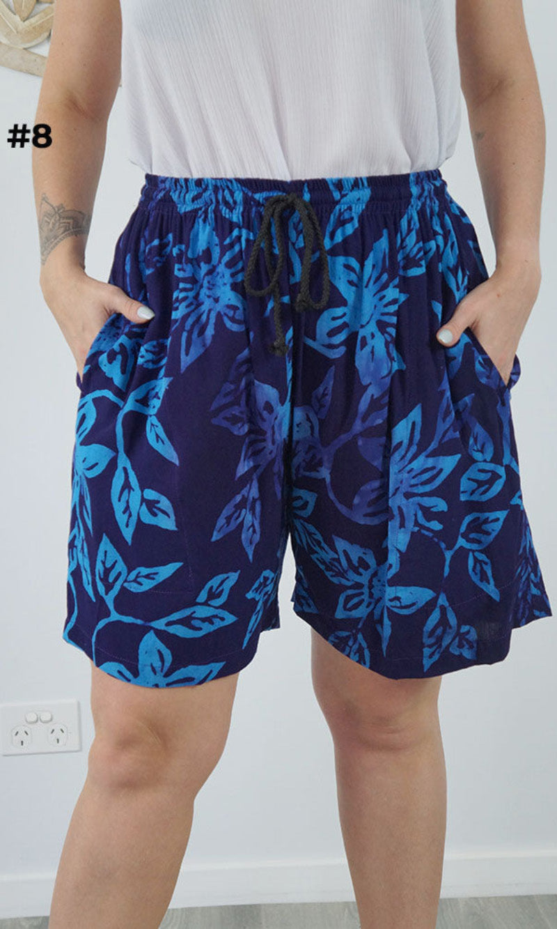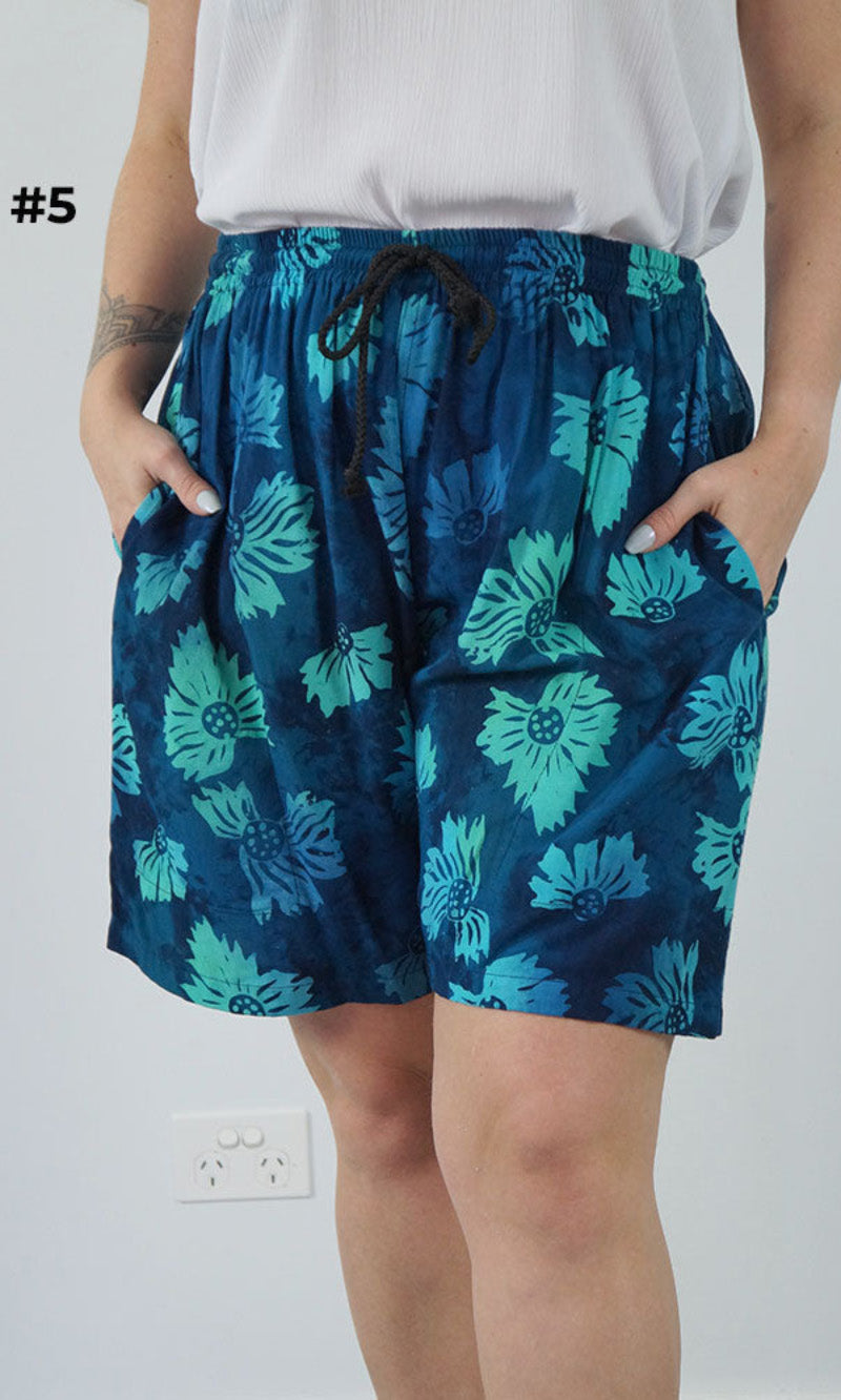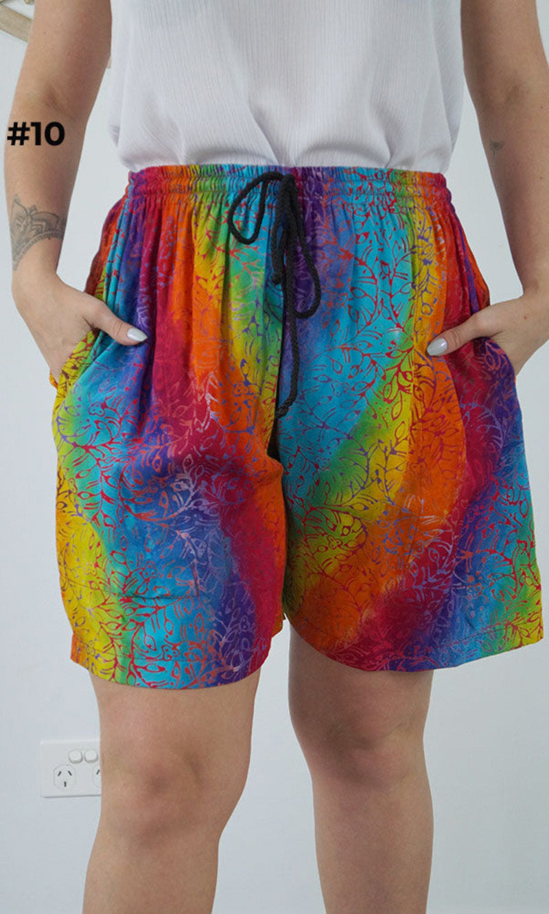 Cool and bright 100% rayon Happy Shorts. Free size to fit most sizes 8-18. Printed using traditional Batik methods.