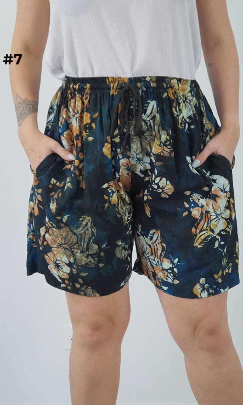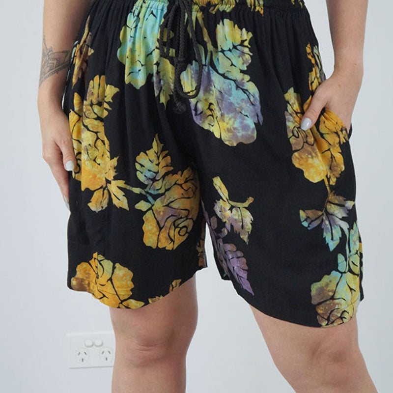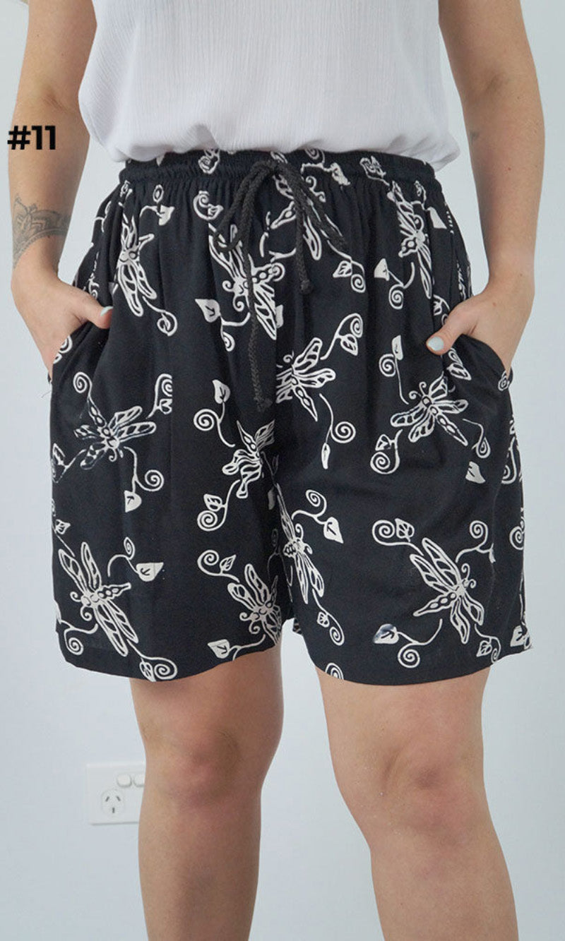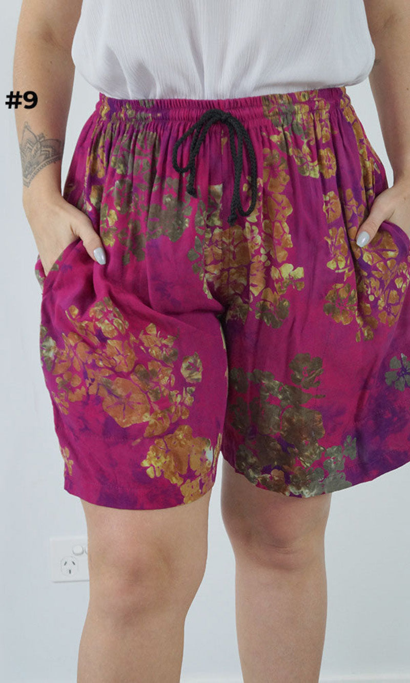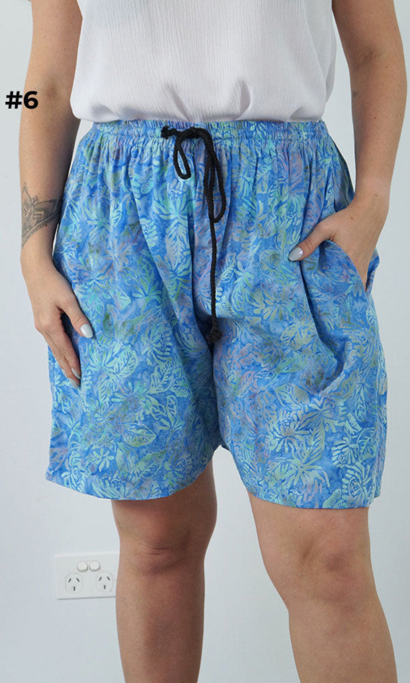 Cool and bright 100% rayon Happy Shorts. Free size to fit most sizes 8-18. Printed using traditional Batik methods.