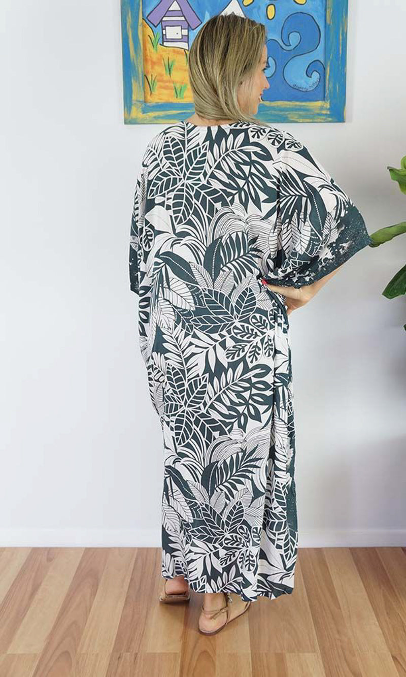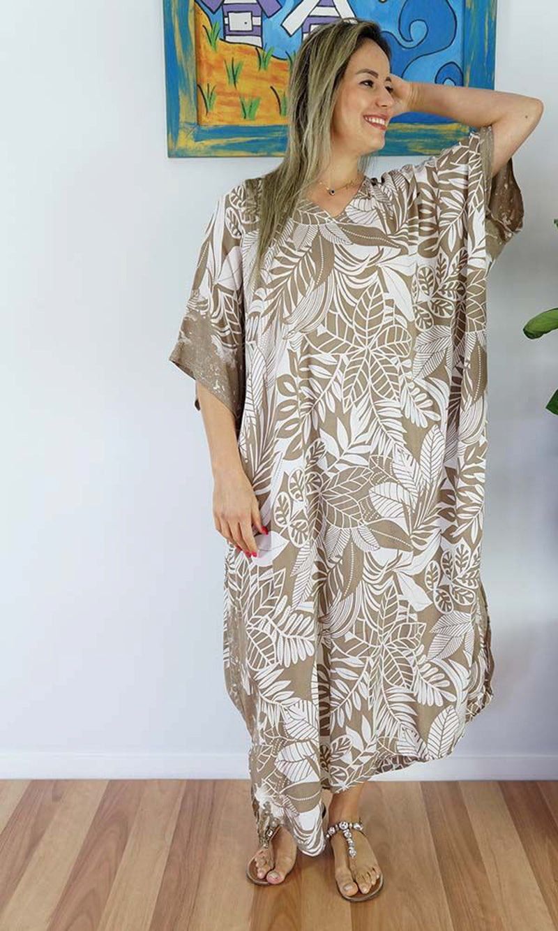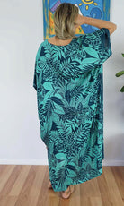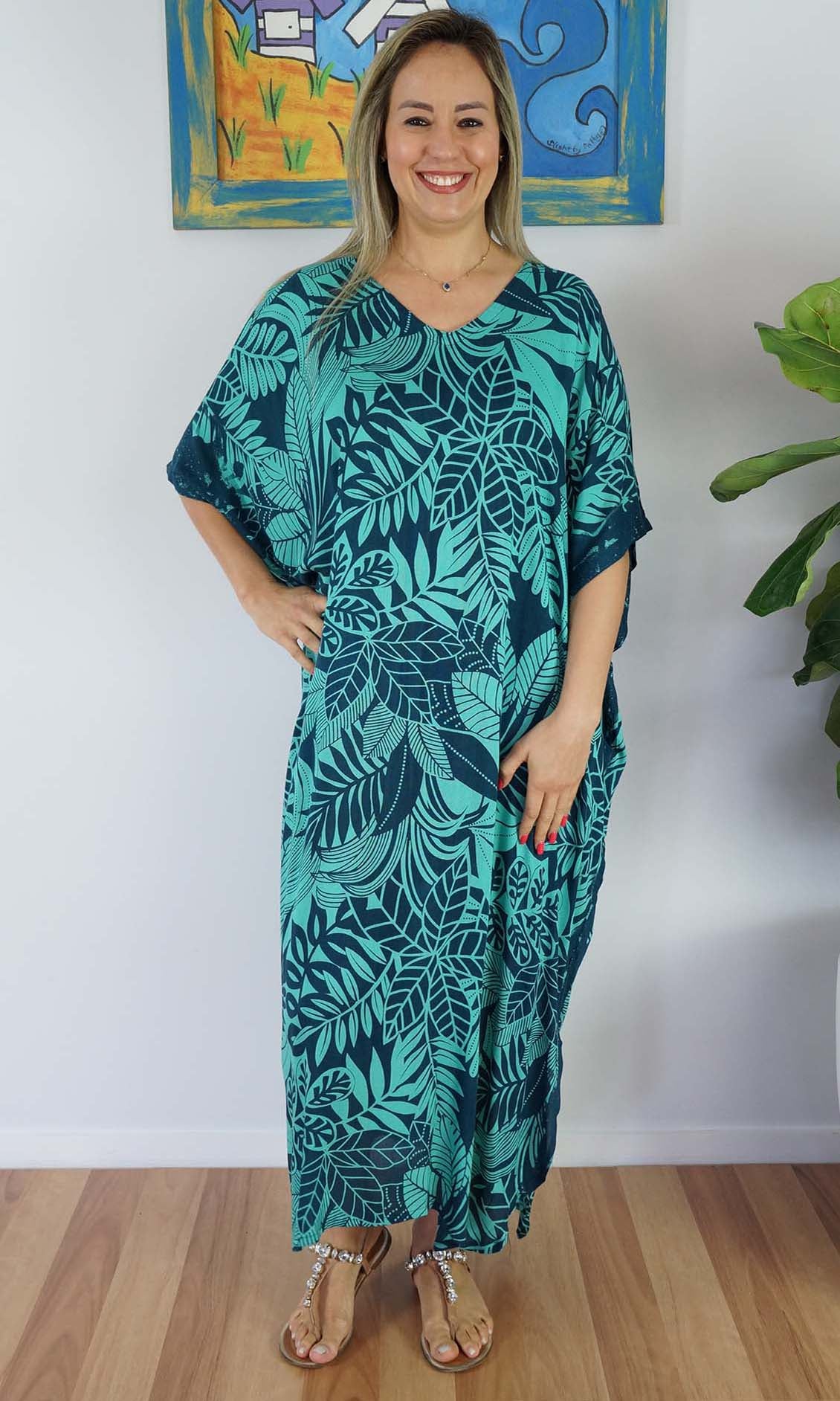This light rayon kaftan makes a wonderful gift. One size fits size 10 to 26 comfortably. Has side splits at the bottom. Finished length is approximently 125cms.