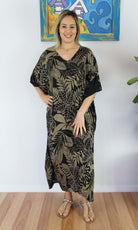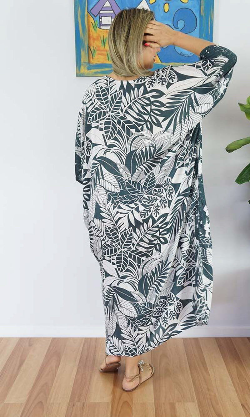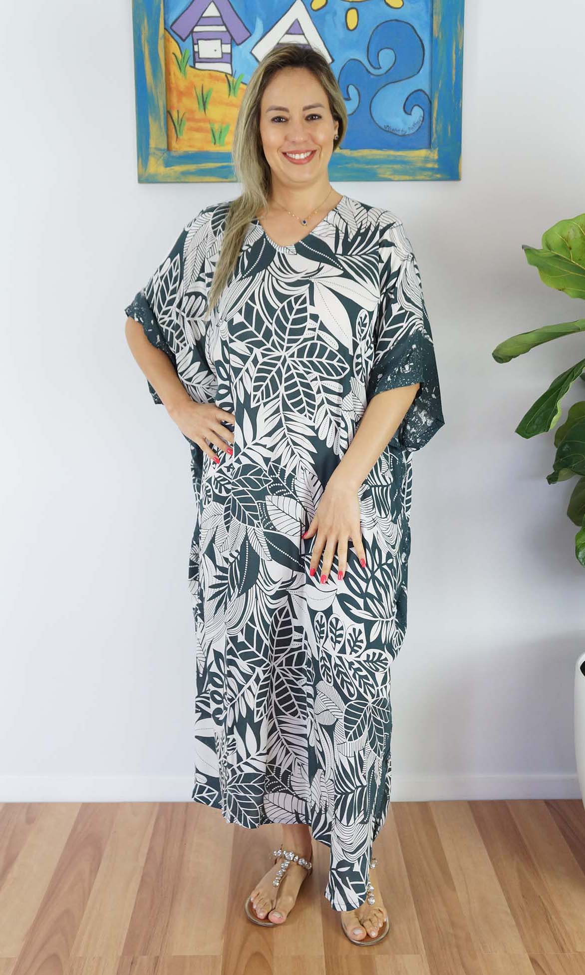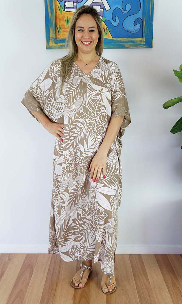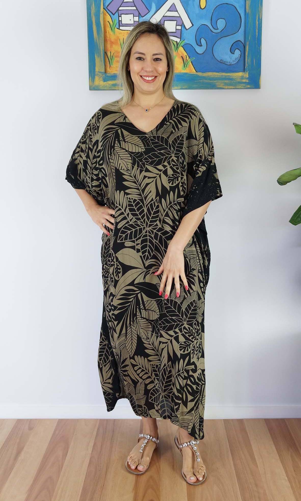 This light rayon kaftan makes a wonderful gift. One size fits size 10 to 26 comfortably. Has side splits at the bottom. Finished length is approximently 125cms.