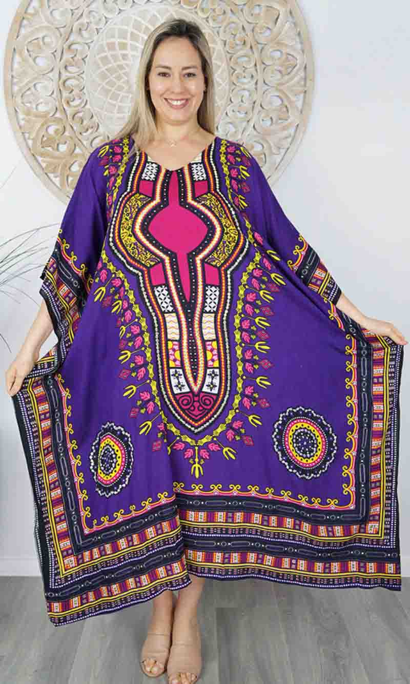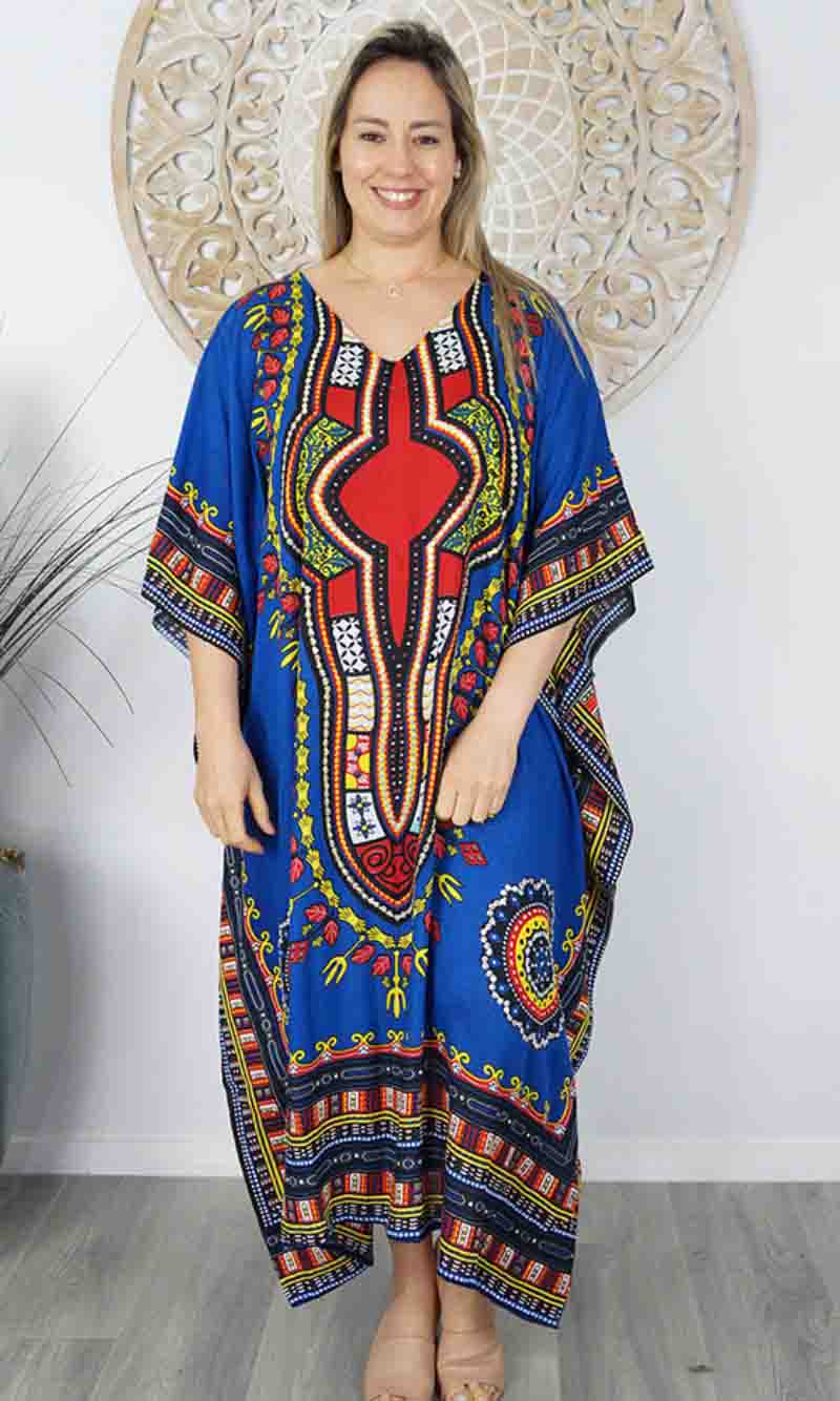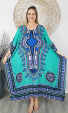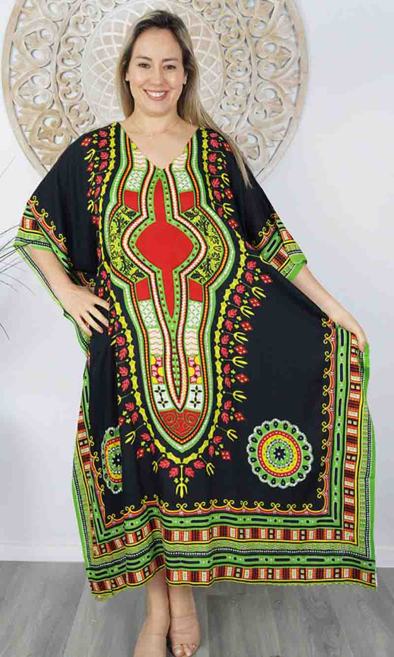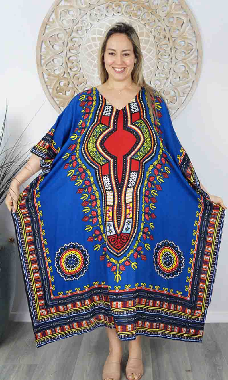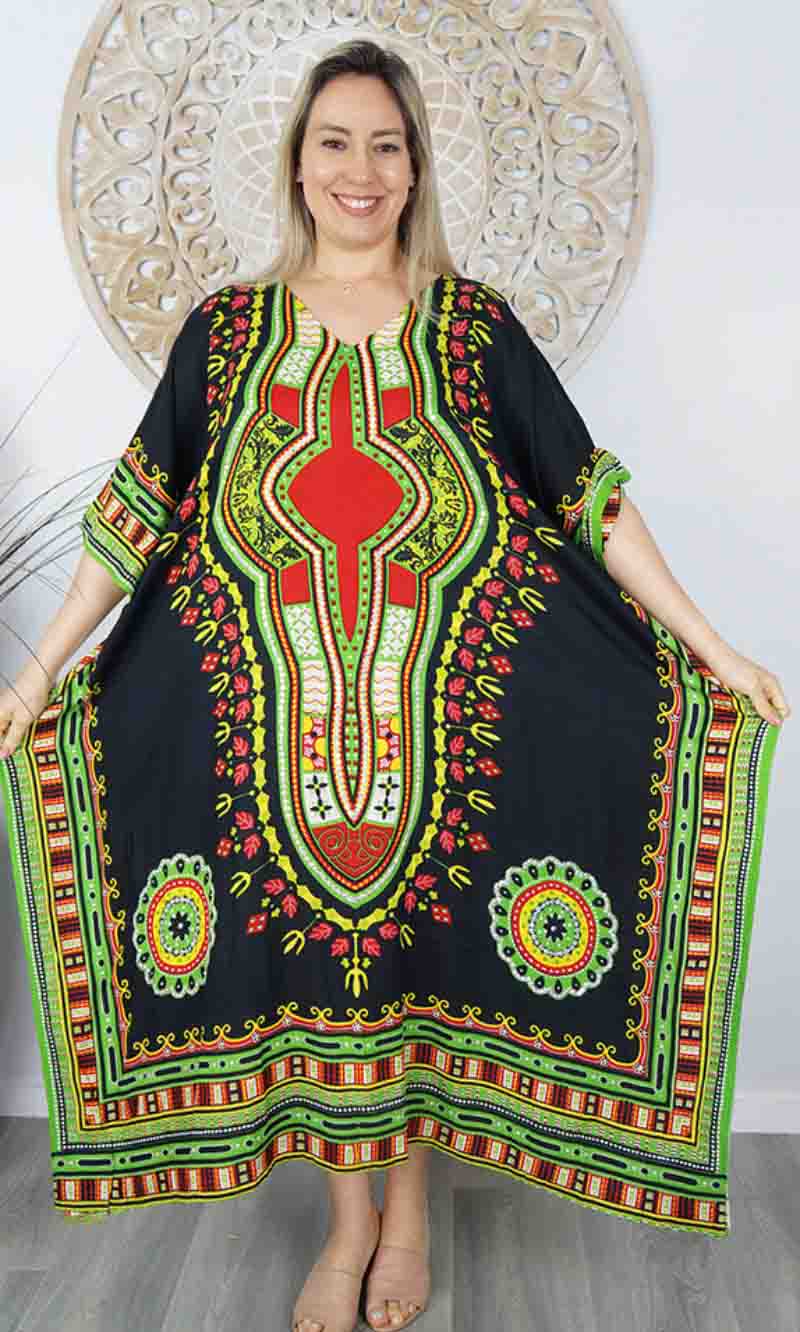 This light rayon kaftan makes a wonderful gift. One size fits size 10 to 26 comfortably. Has side splits at the bottom. The bling kaftans have sequins sewn on. Finished length is approximently 125cms.
