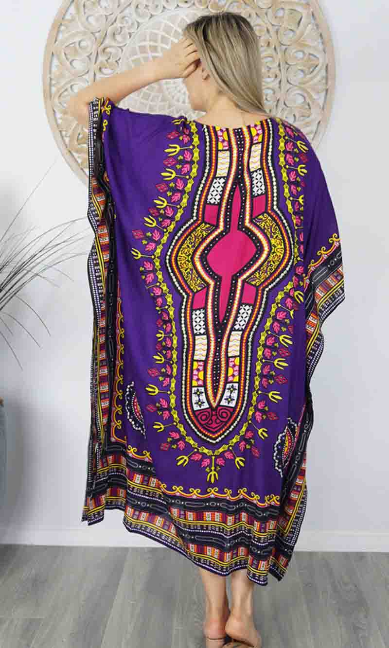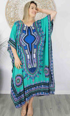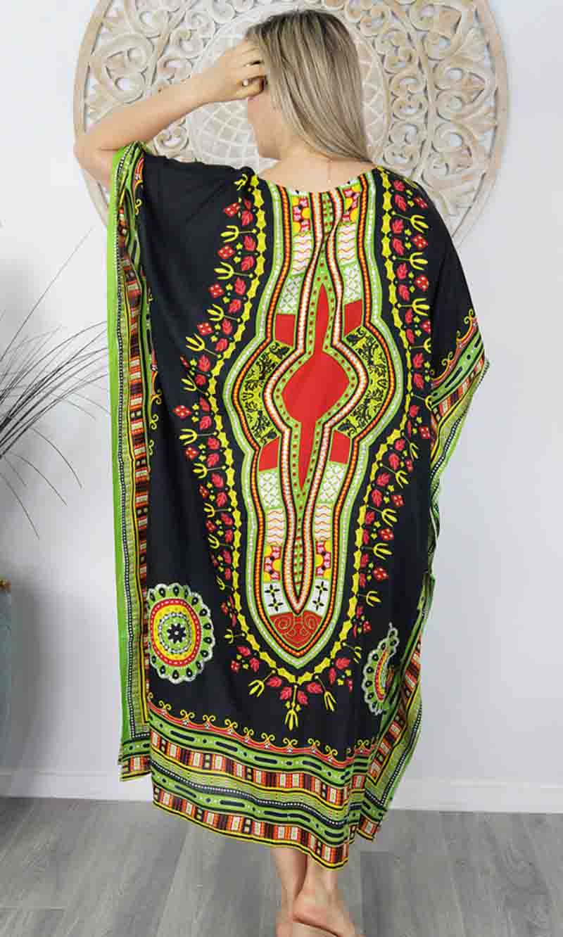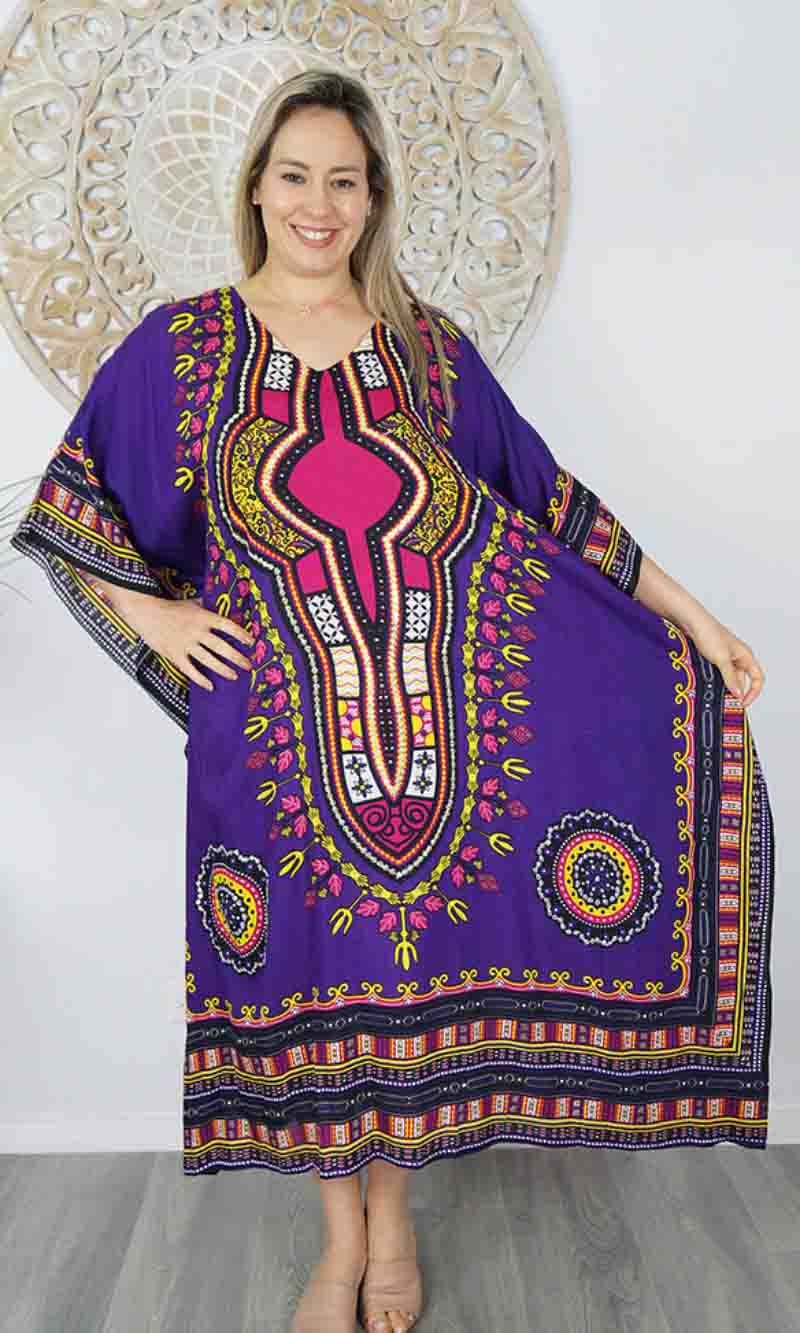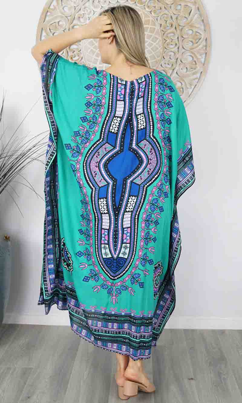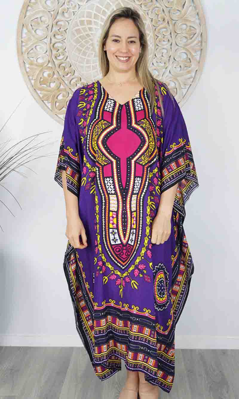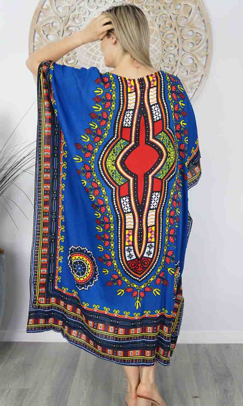 This light rayon kaftan makes a wonderful gift. One size fits size 10 to 26 comfortably. Has side splits at the bottom. The bling kaftans have sequins sewn on. Finished length is approximently 125cms.
