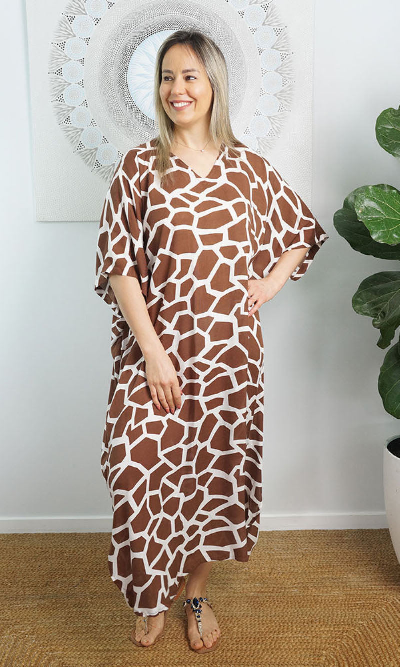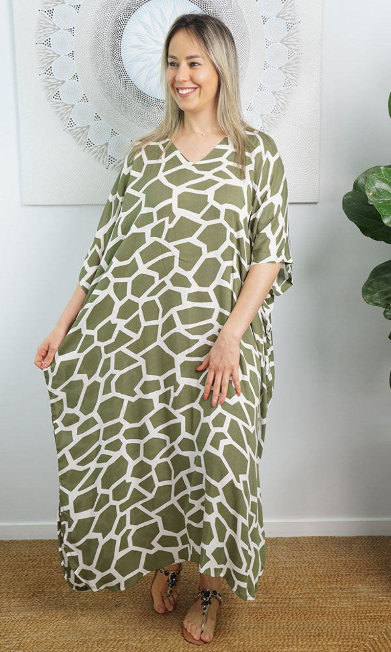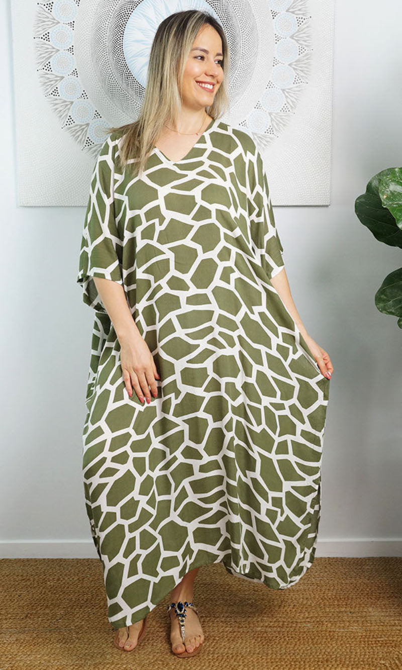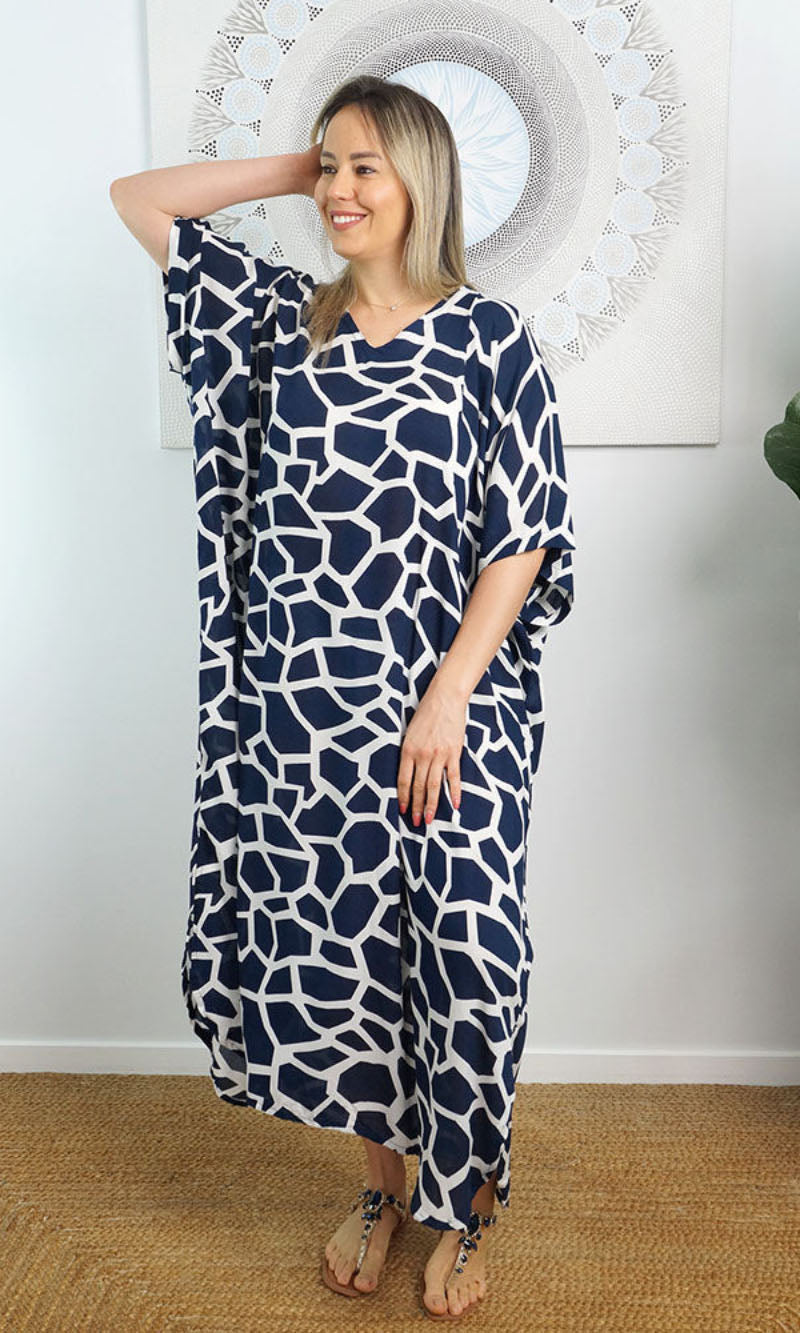 This light rayon kaftan makes a wonderful gift. One size fits size 10 to 26 comfortably. Has side splits at the bottom. The bling kaftans have sequins sewn on. Finished length is approximently 125cms.