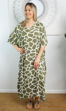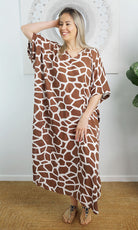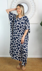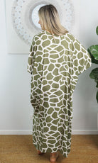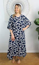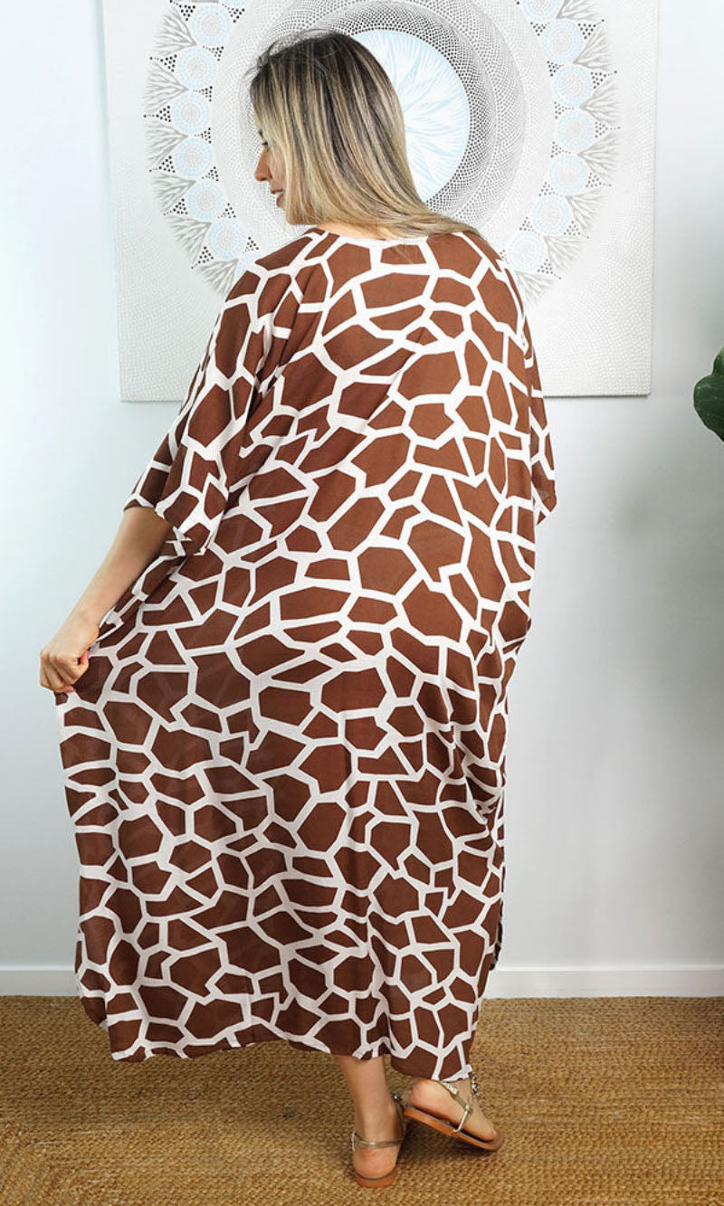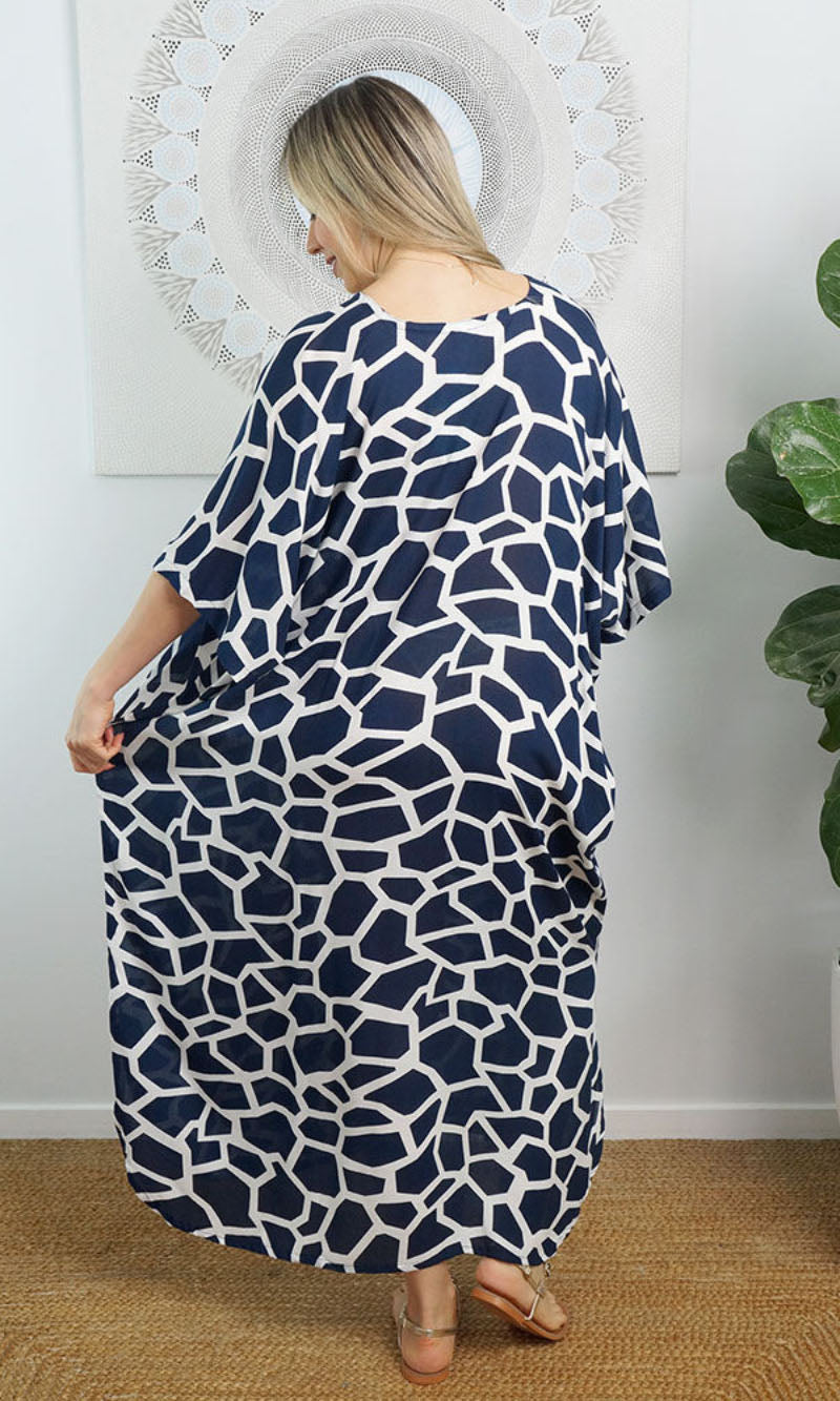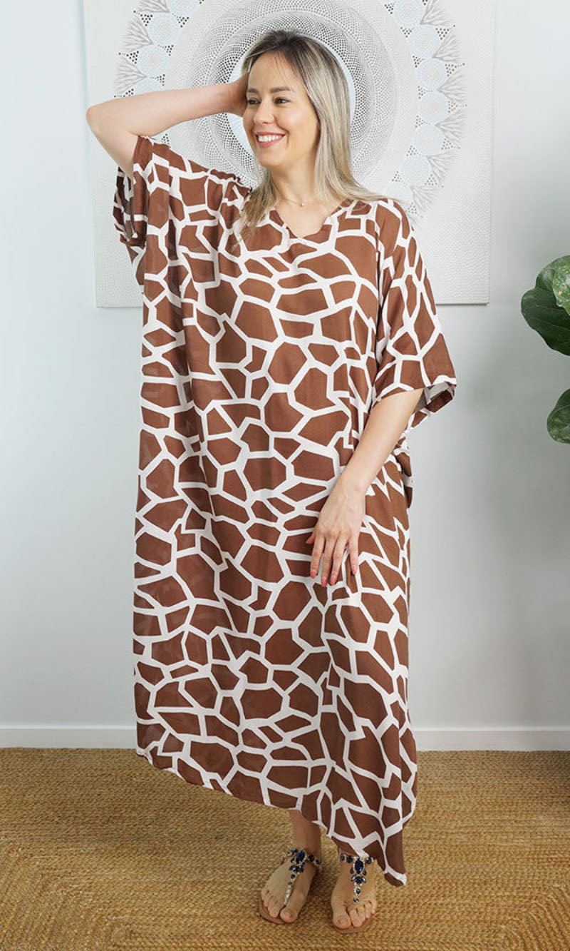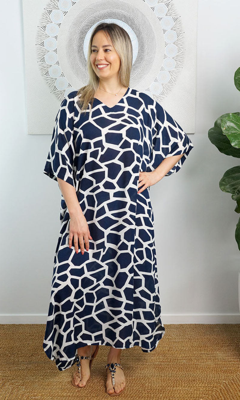 This light rayon kaftan makes a wonderful gift. One size fits size 10 to 26 comfortably. Has side splits at the bottom. The bling kaftans have sequins sewn on. Finished length is approximently 125cms.