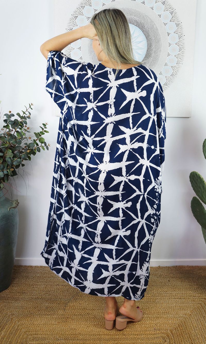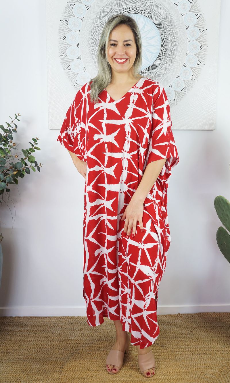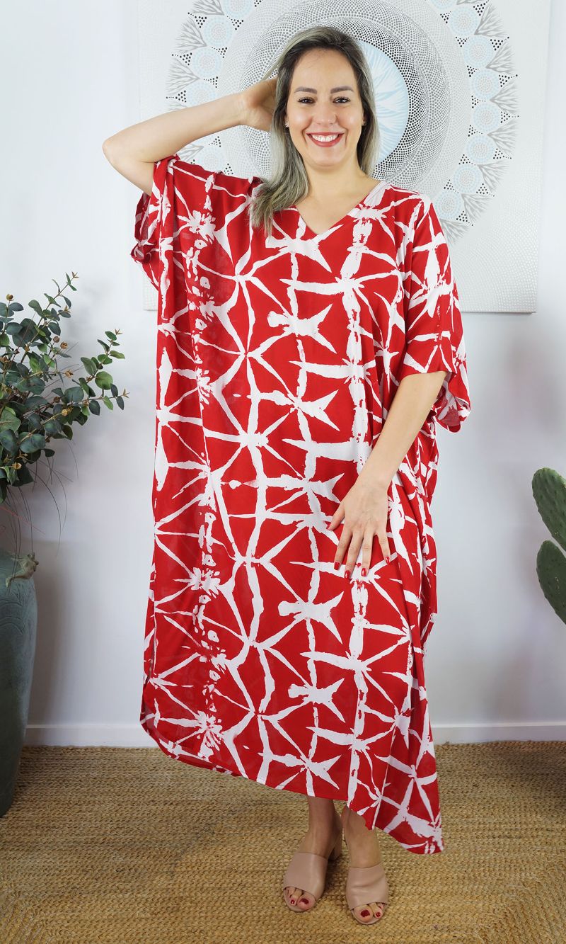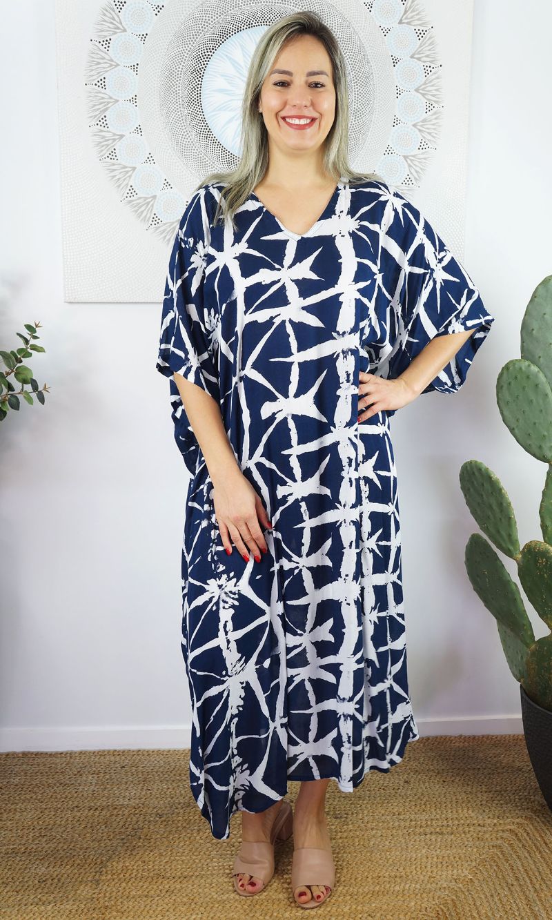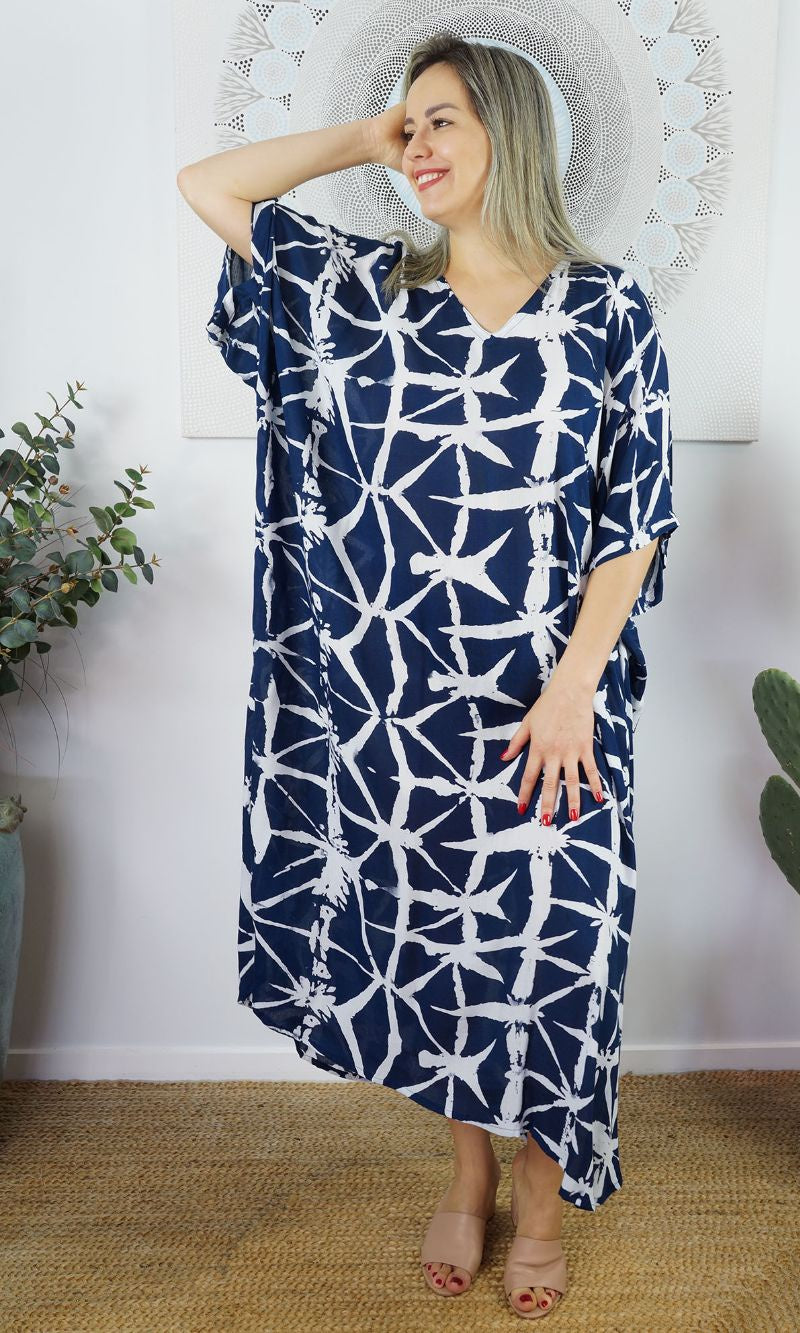 This light rayon kaftan makes a wonderful gift. One size fits size 10 to 26 comfortably. Has side splits at the bottom. The bling kaftans have sequins sewn on. Finished length is approximently 125cms.
