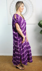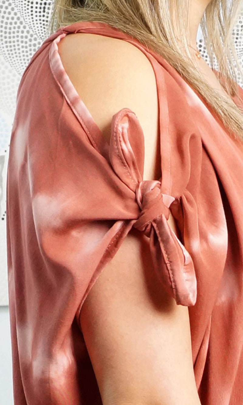 A simple but comfortable day dress This rayon garment features a v-neck line, front and back, cut out elbow length sleeves with tie.