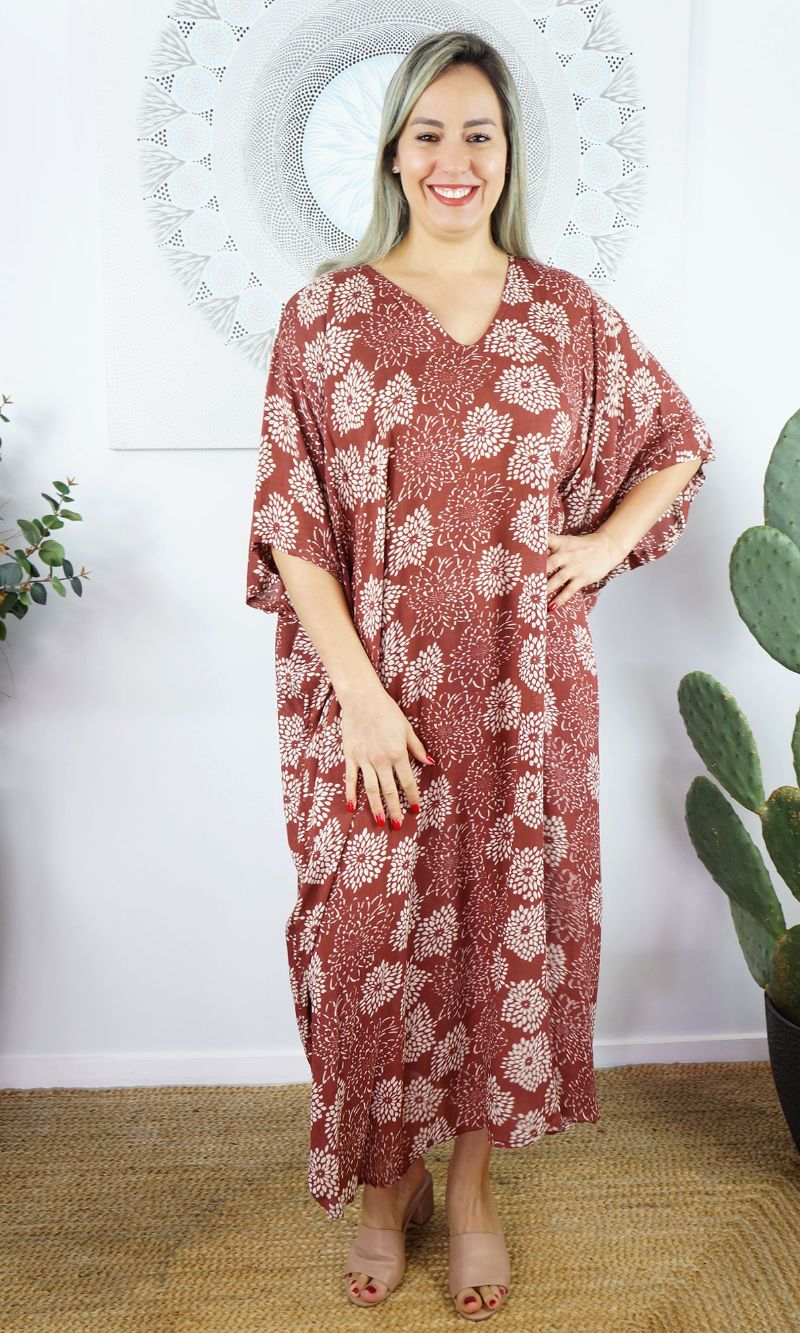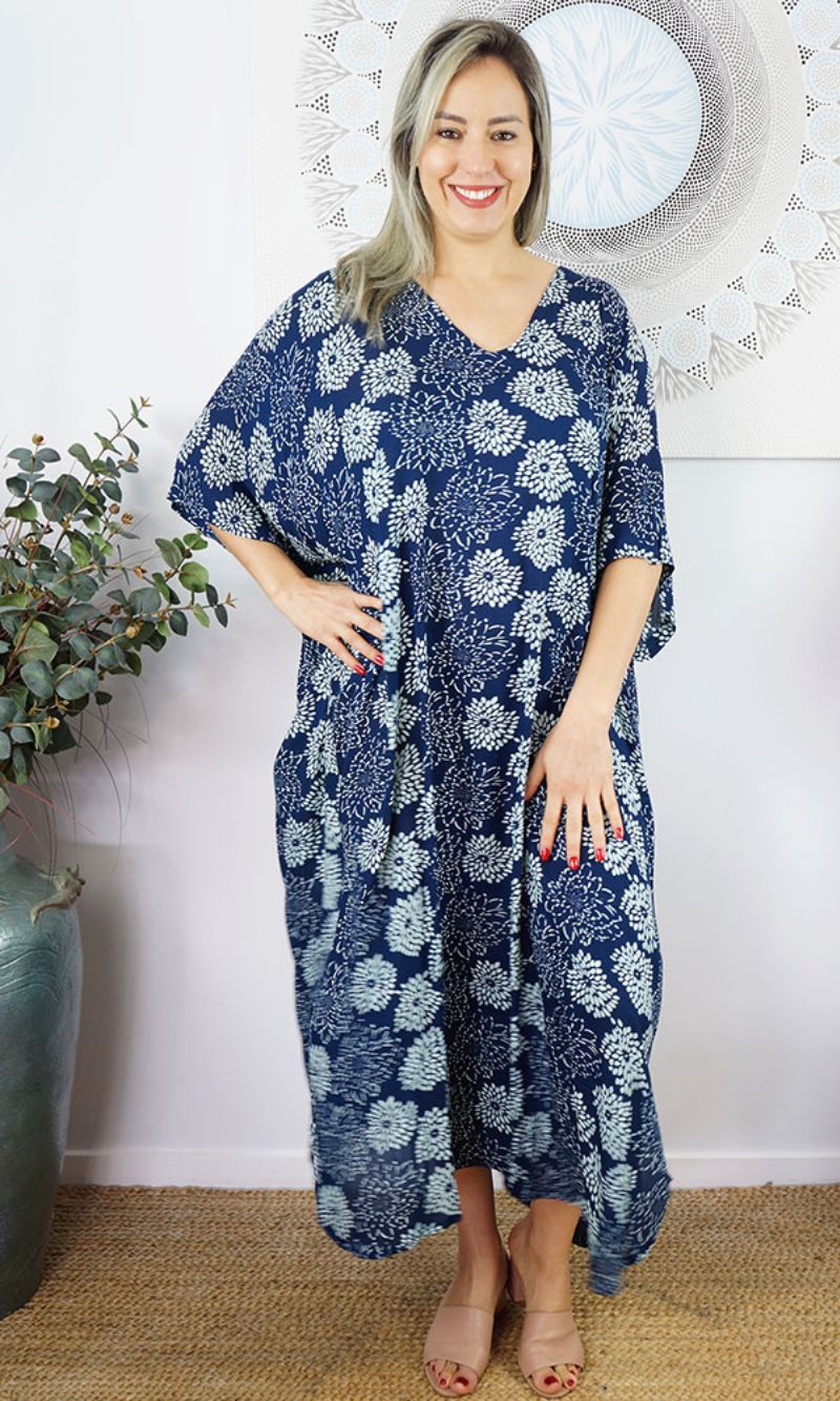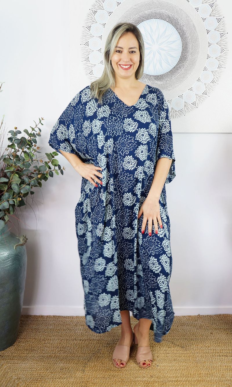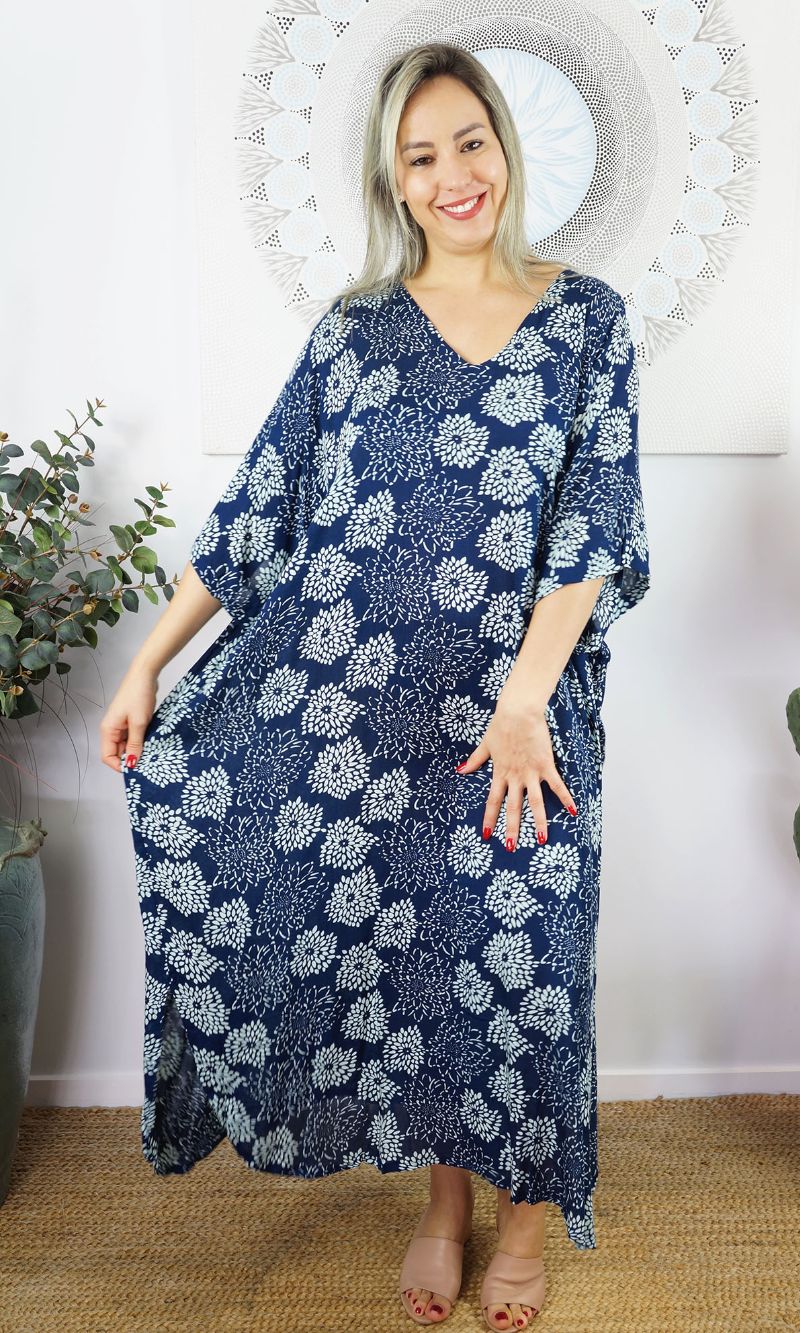 This light rayon kaftan makes a wonderful gift. One size fits size 10 to 26 comfortably. Has side splits at the bottom. The bling kaftans have sequins sewn on. Finished length is approximently 125cms.