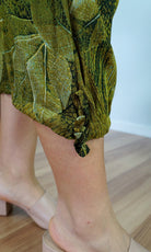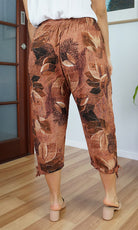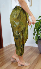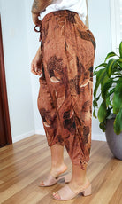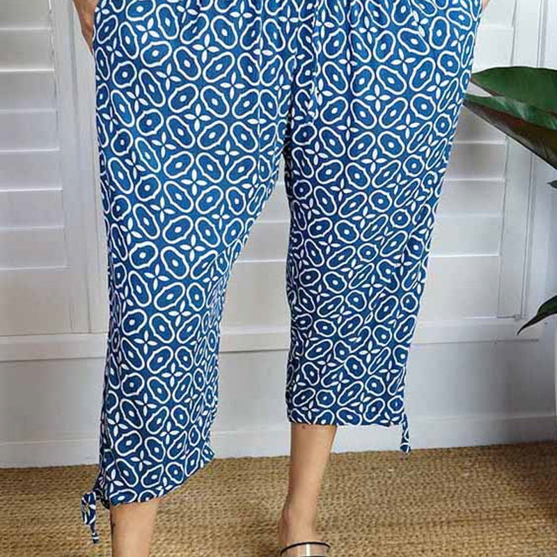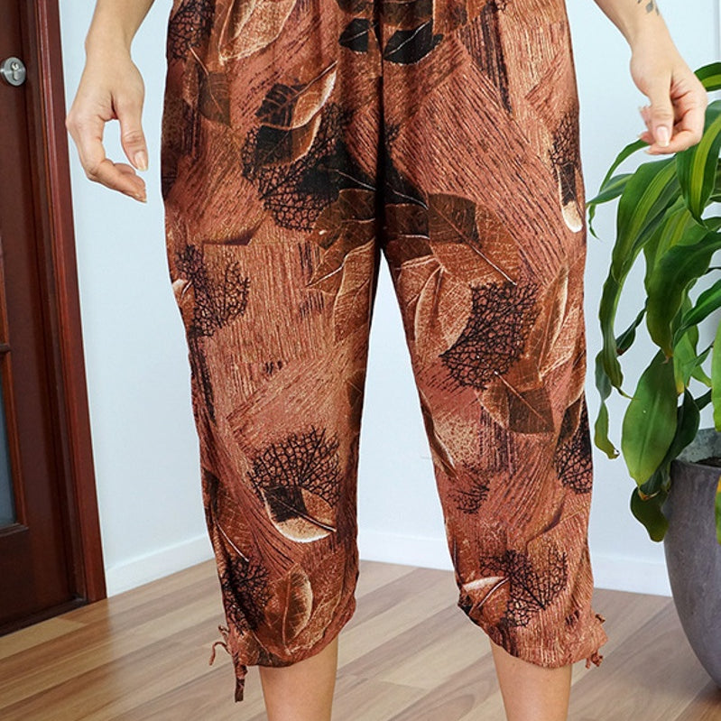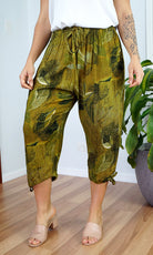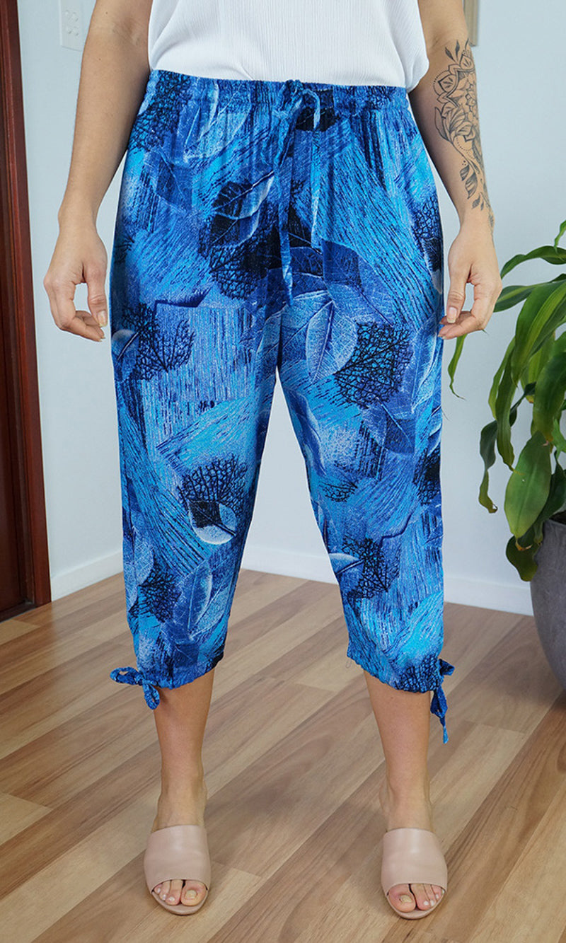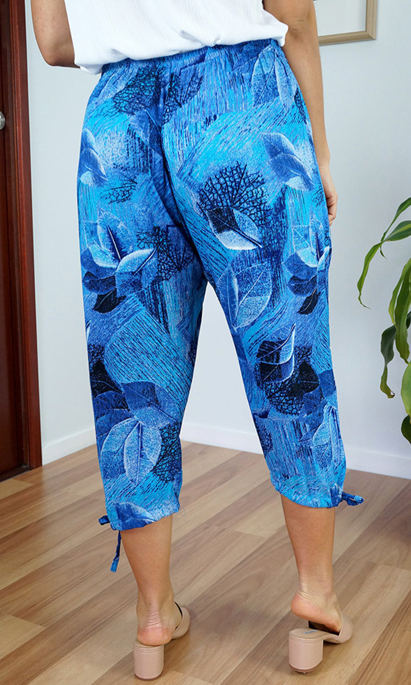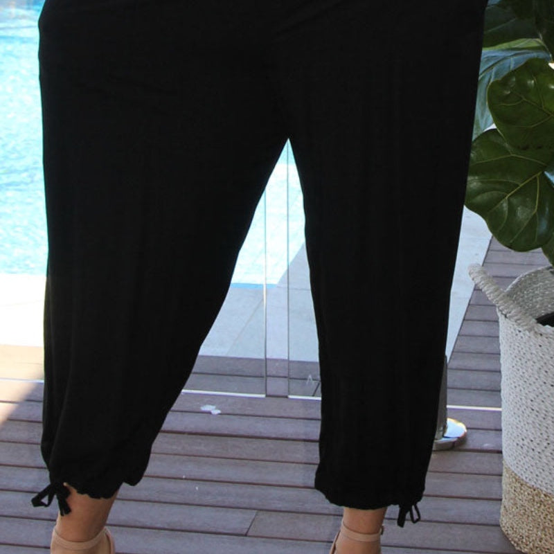The 3/4 Plain pant, made from a comfortable crinkle rayon has elastic and drawstring around the bottom of the leg and around the waist which makes a great fit.