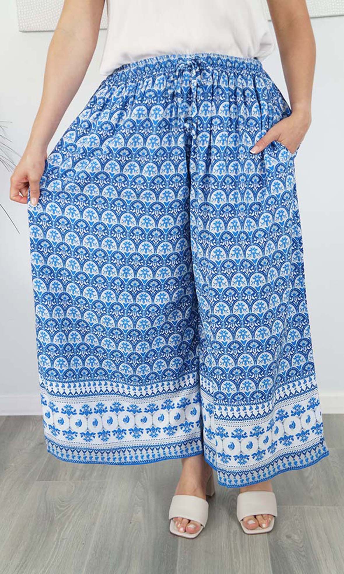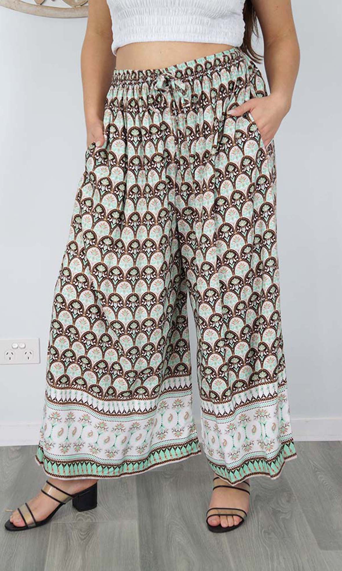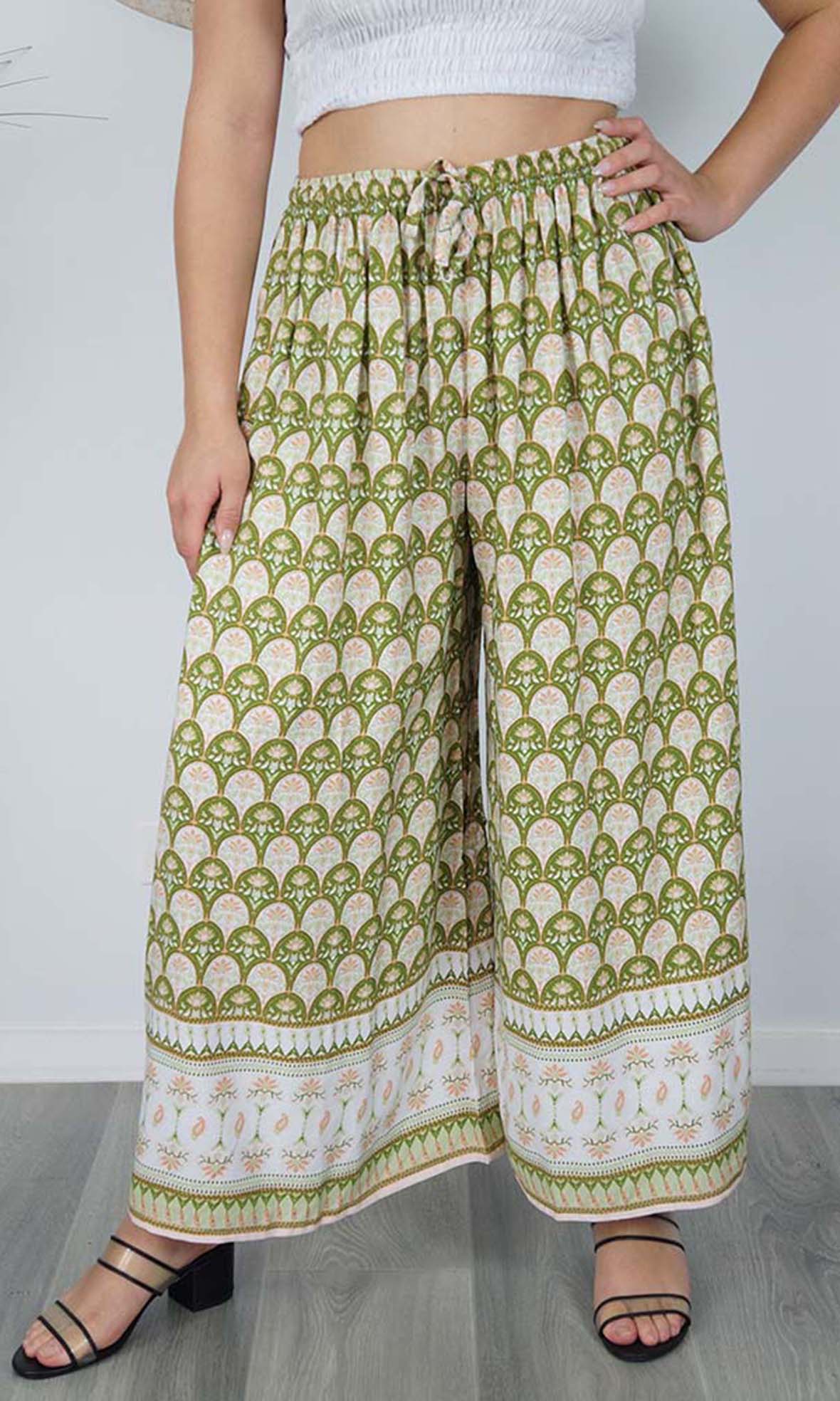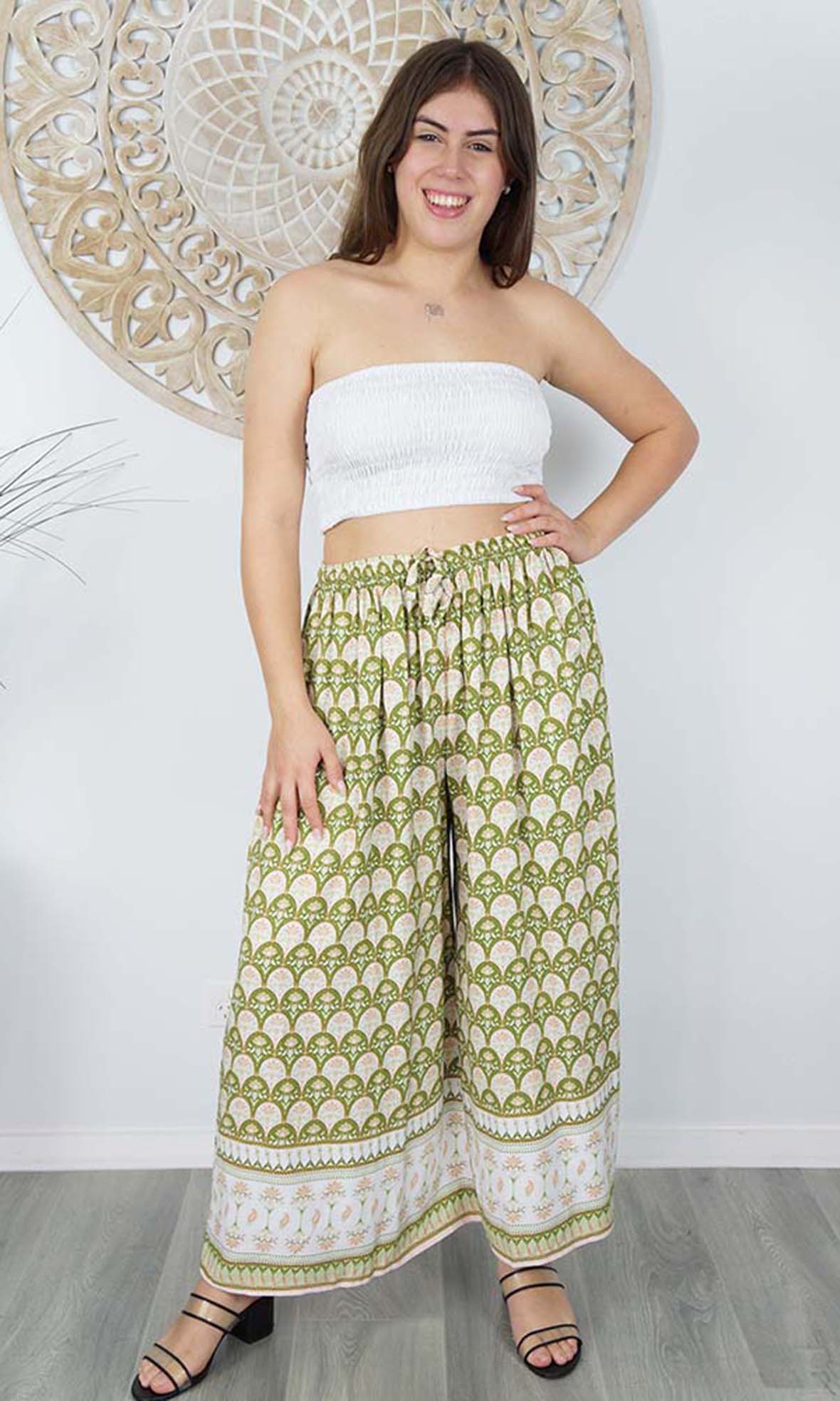 The Cha Cha pant is 100% rayon and one size to fit 10-18. With extra wide flowing legs and elastic waist, this has got to be the most comfortable pant yet.
