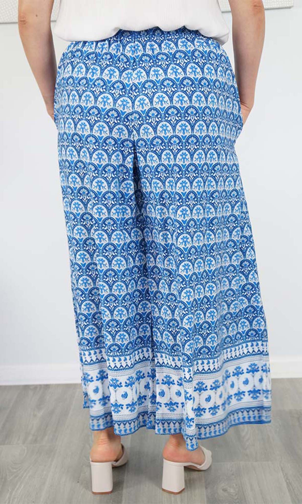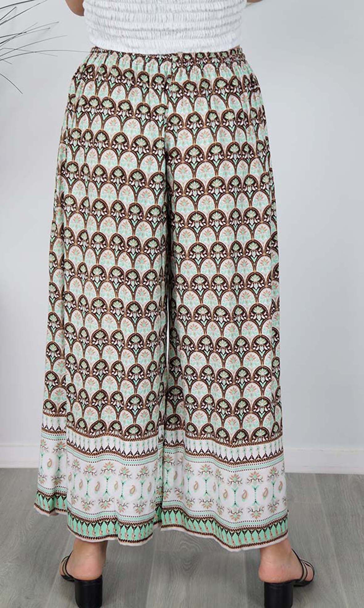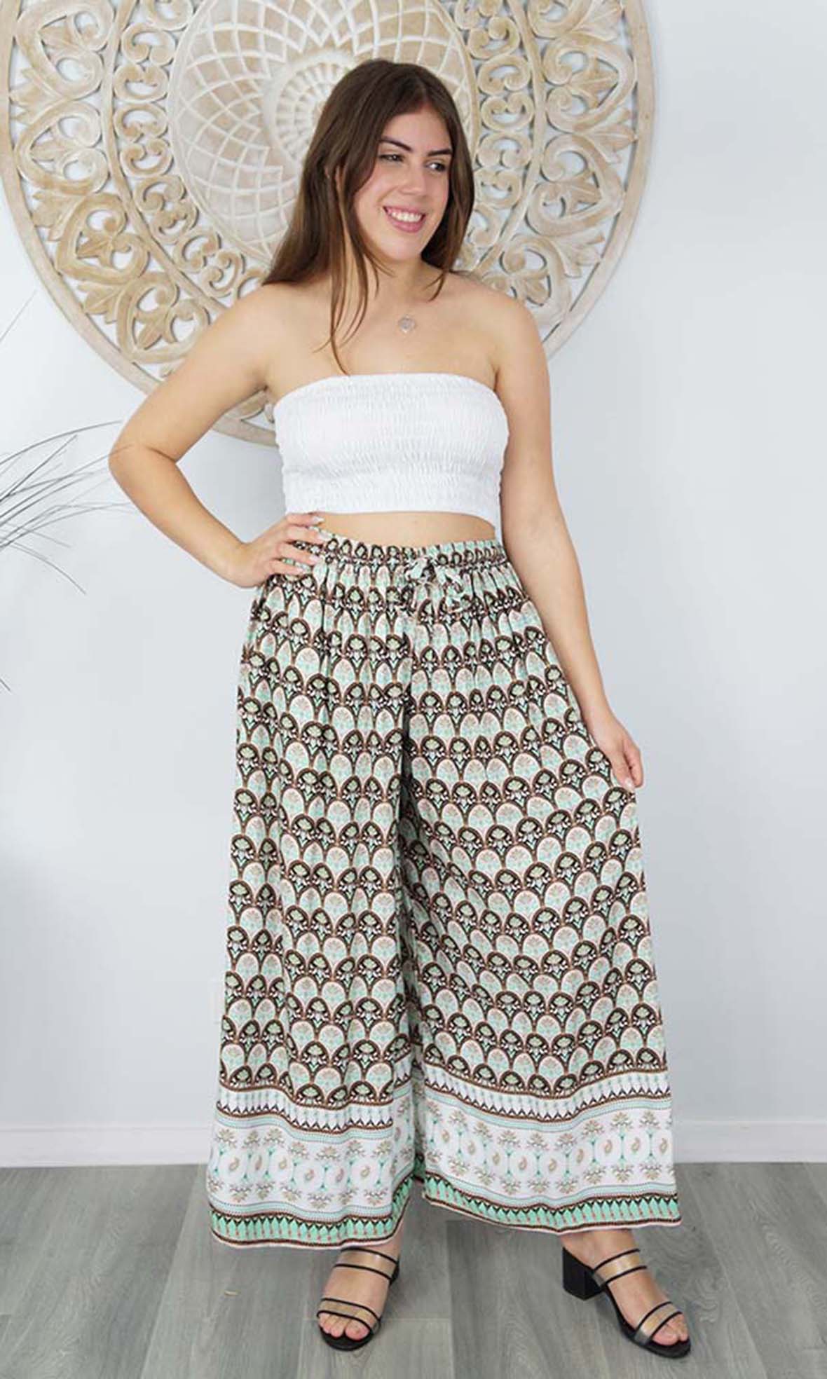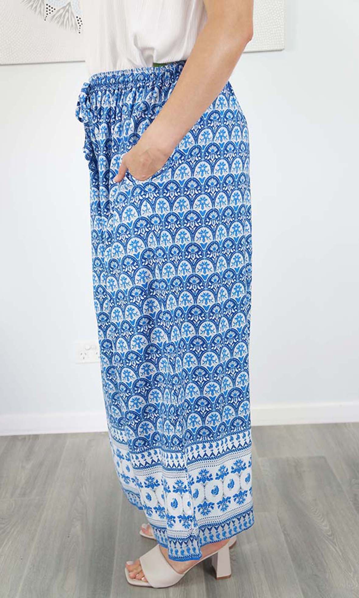 The Cha Cha pant is 100% rayon and one size to fit 10-18. With extra wide flowing legs and elastic waist, this has got to be the most comfortable pant yet.