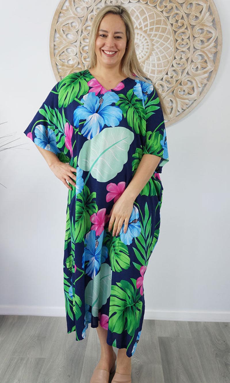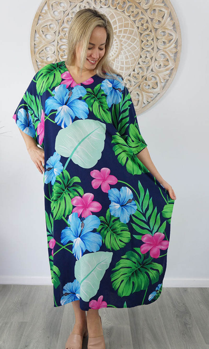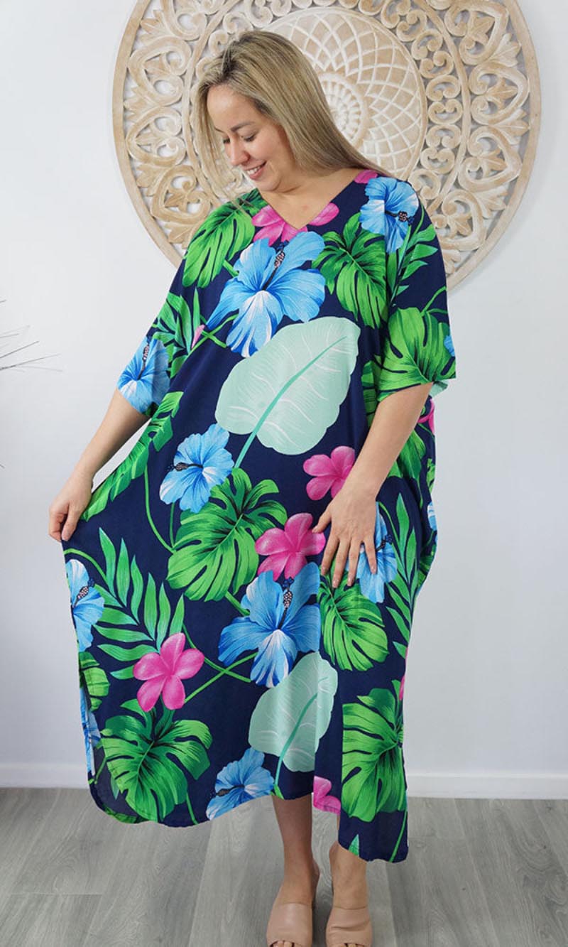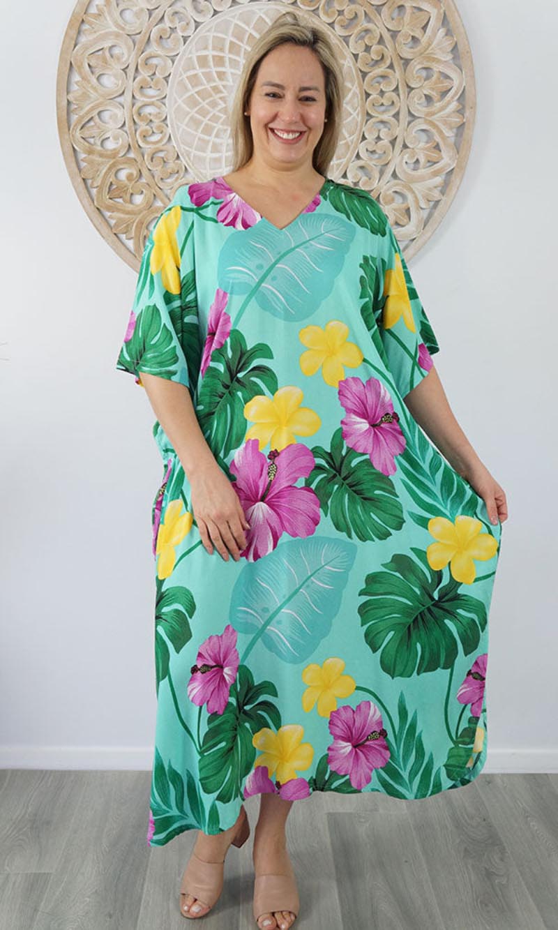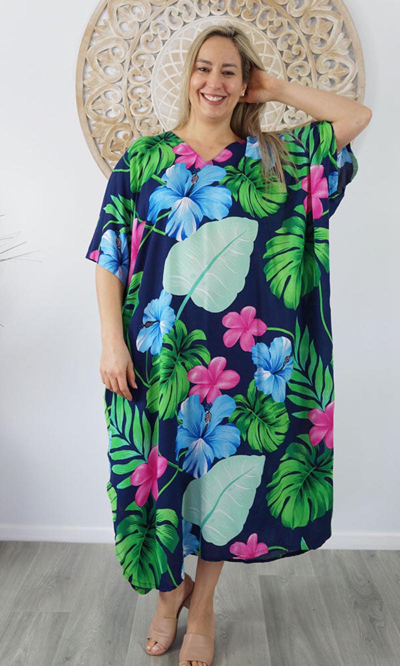 Our kaftans range from rich solid colors to funky patterns. A simple v-neck in the front, side splits on the bottom and a free size from 10-26, this product fits everyone (seriously, these fit everyone).