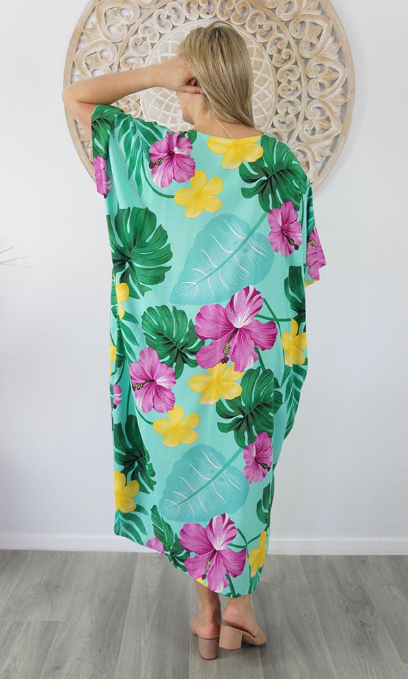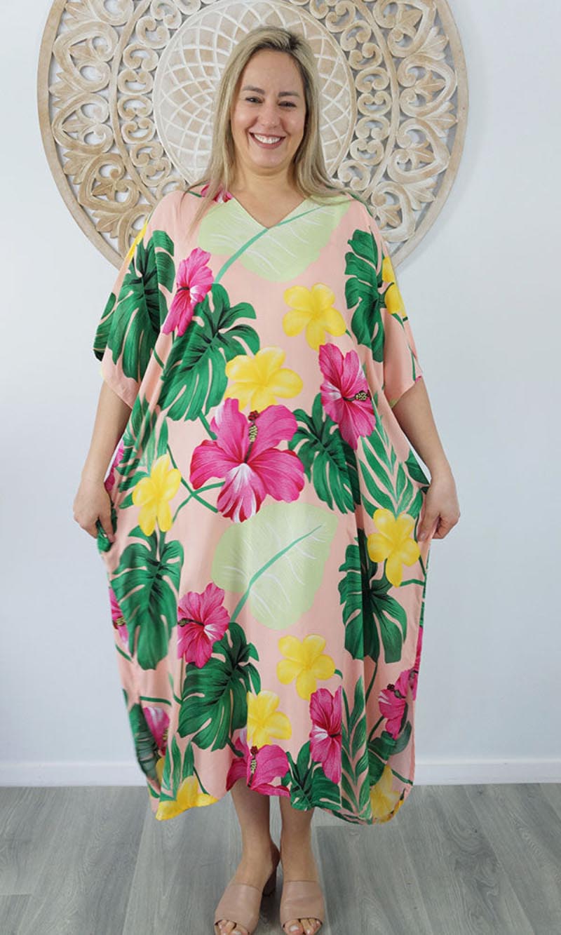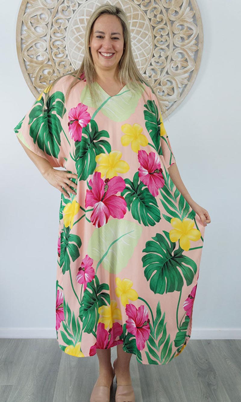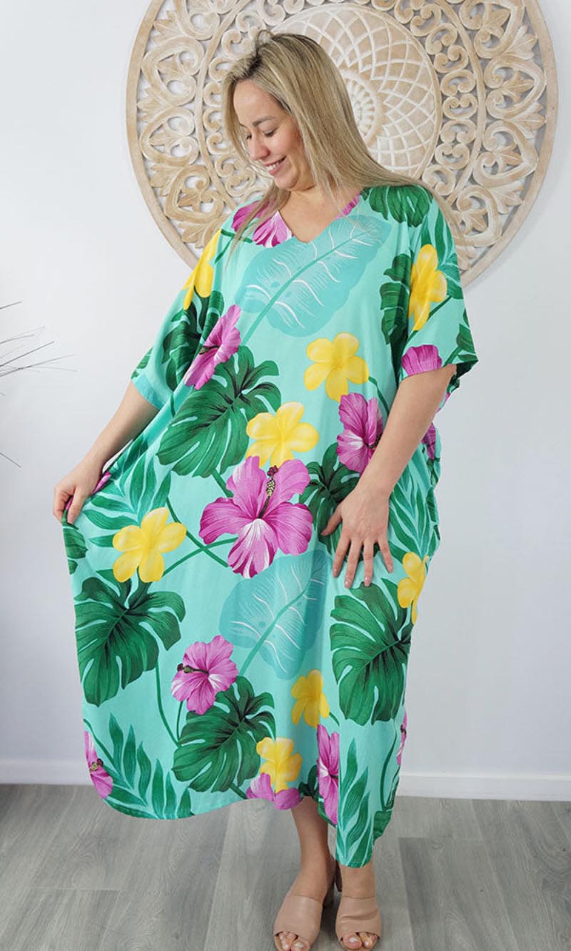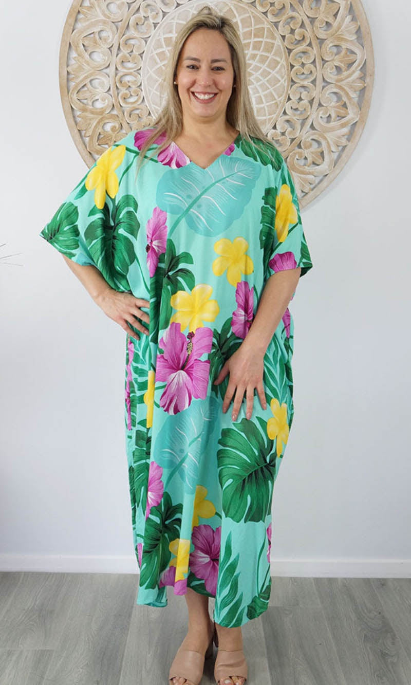 Our kaftans range from rich solid colors to funky patterns. A simple v-neck in the front, side splits on the bottom and a free size from 10-26, this product fits everyone (seriously, these fit everyone).