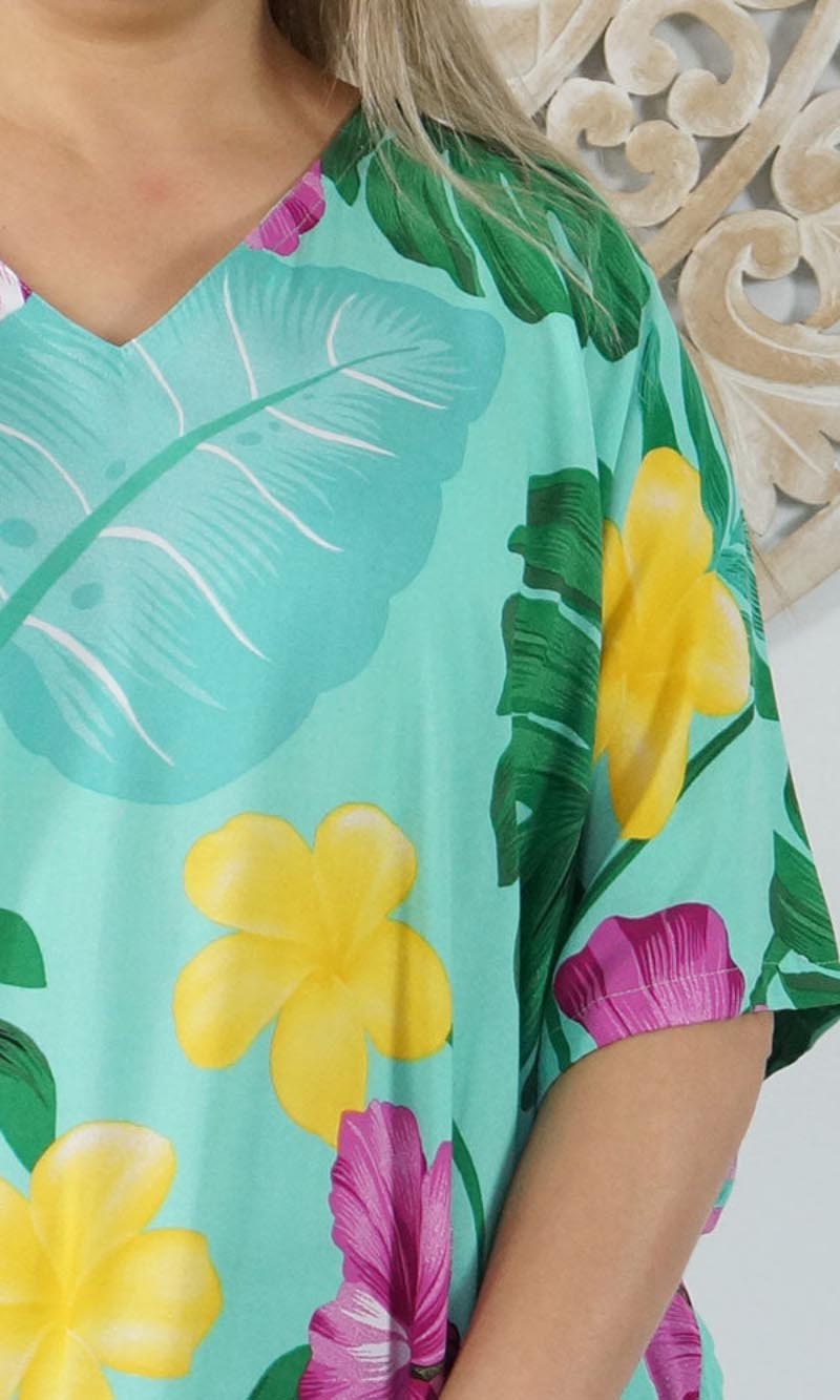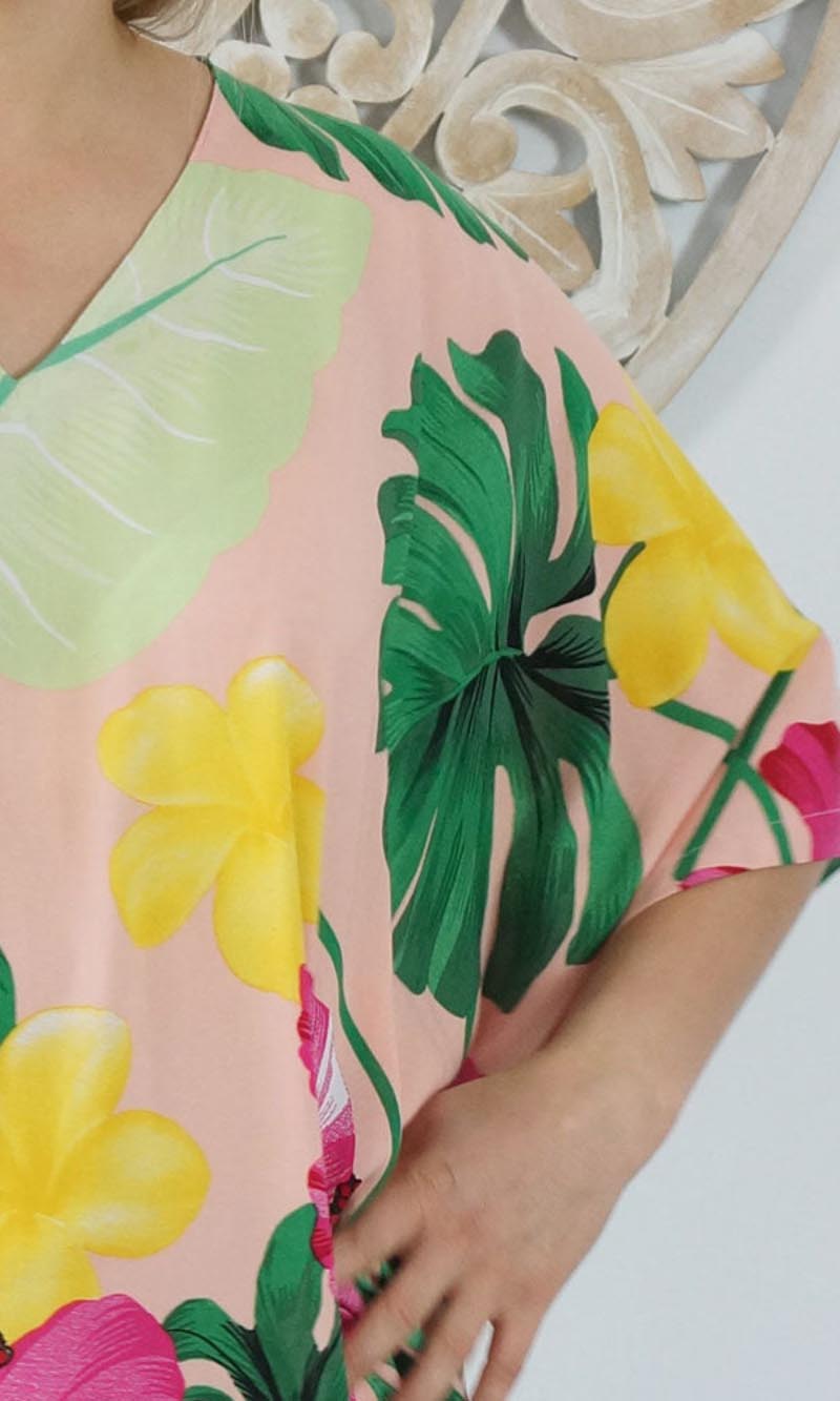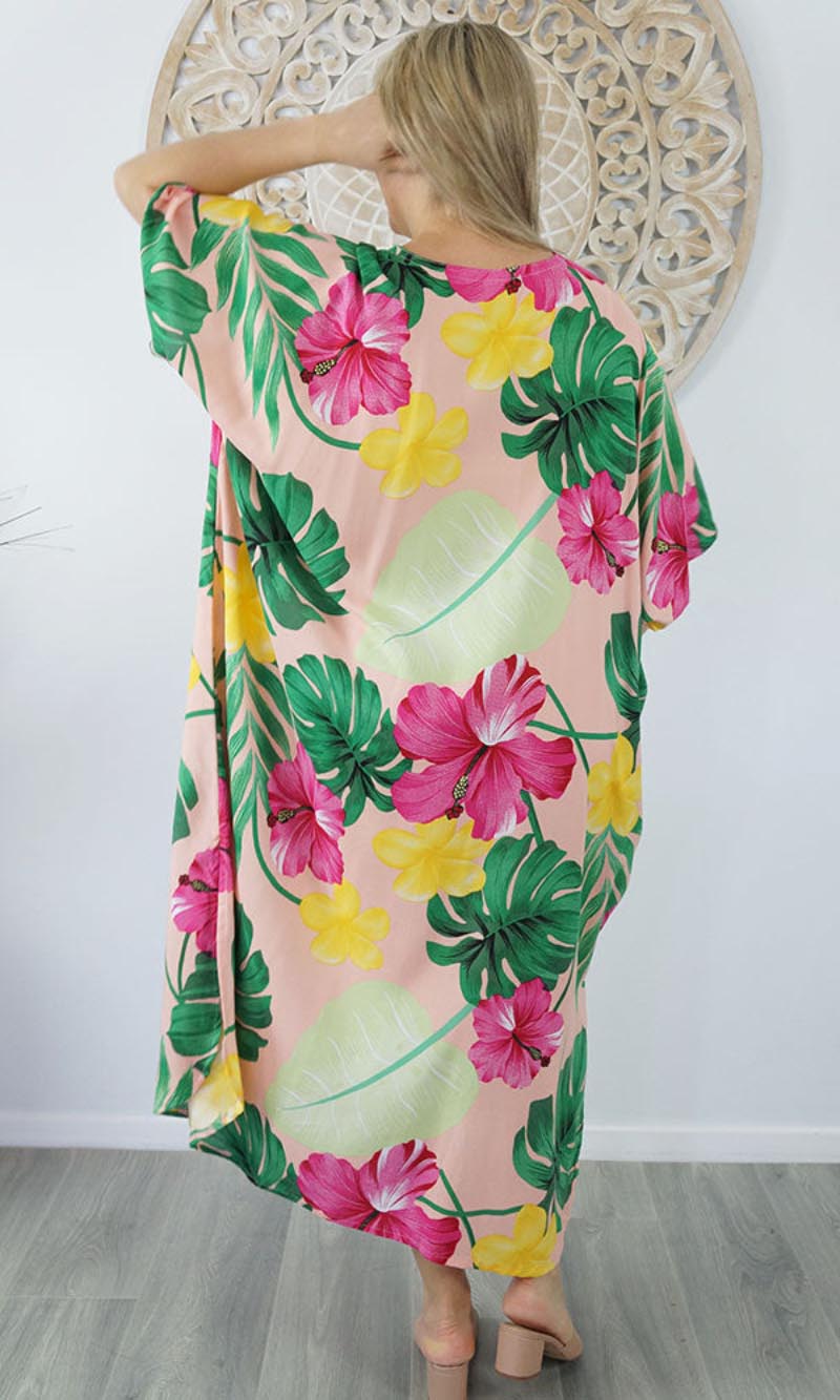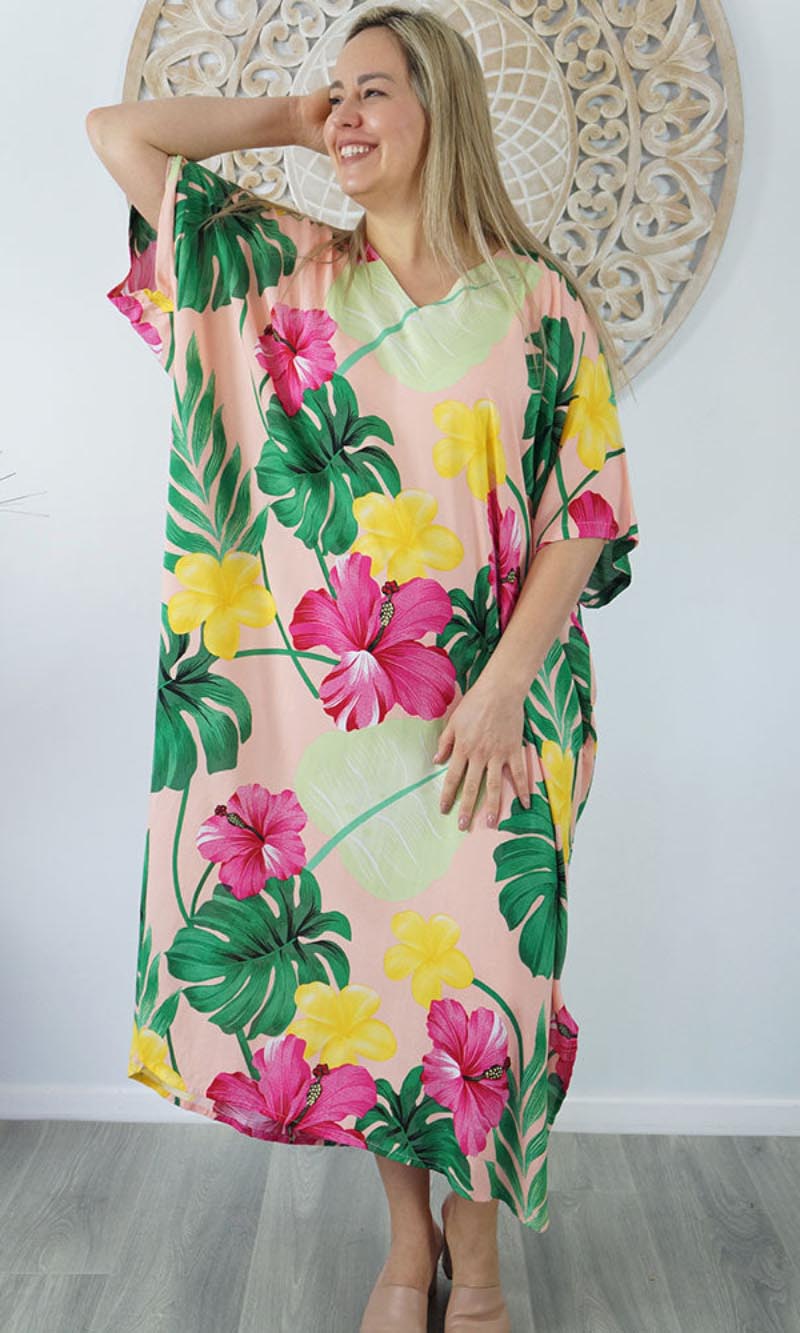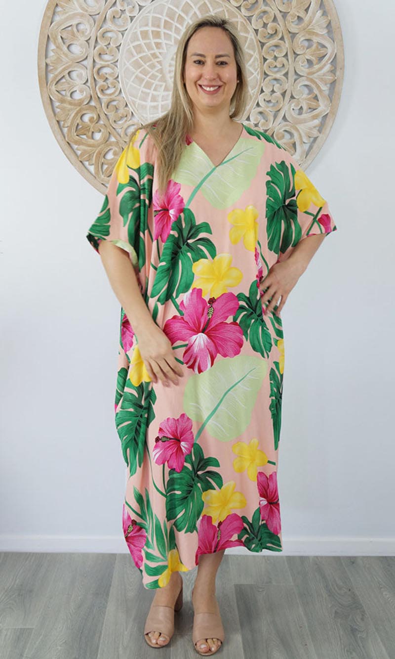 Our kaftans range from rich solid colors to funky patterns. A simple v-neck in the front, side splits on the bottom and a free size from 10-26, this product fits everyone (seriously, these fit everyone).