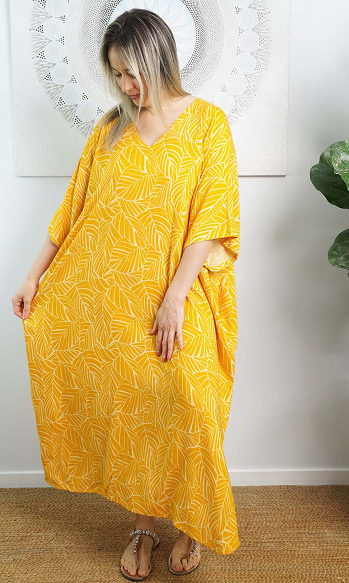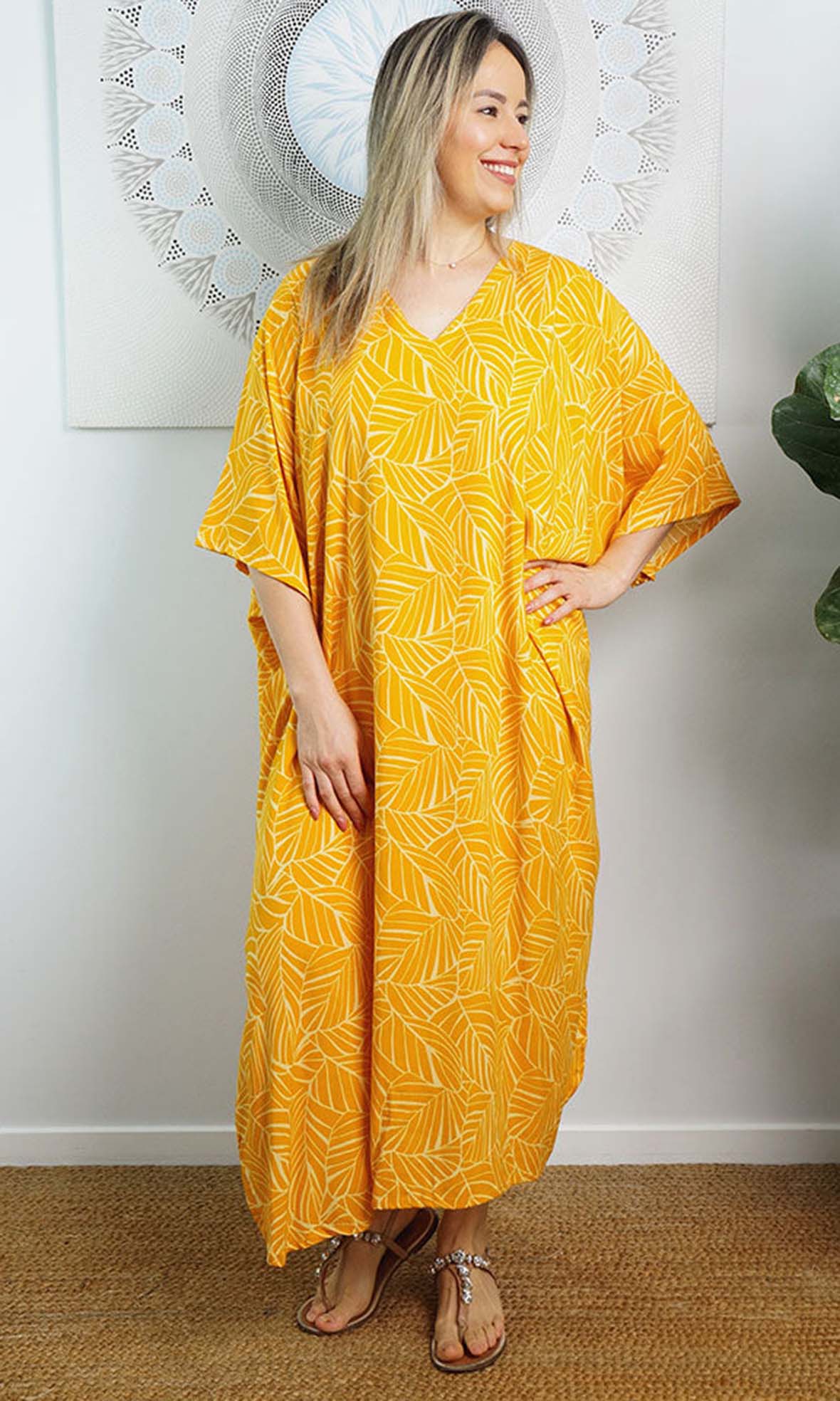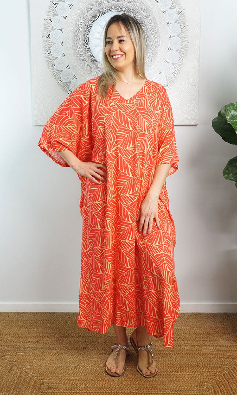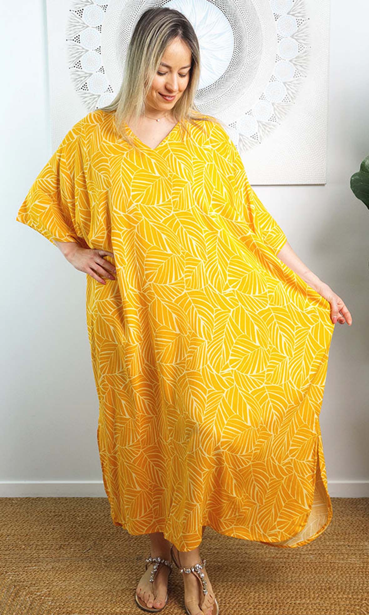 Our kaftans range from rich solid colors to funky patterns. A simple v-neck in the front, side splits on the bottom and a free size from 10-26, this product fits everyone (seriously, these fit everyone).
