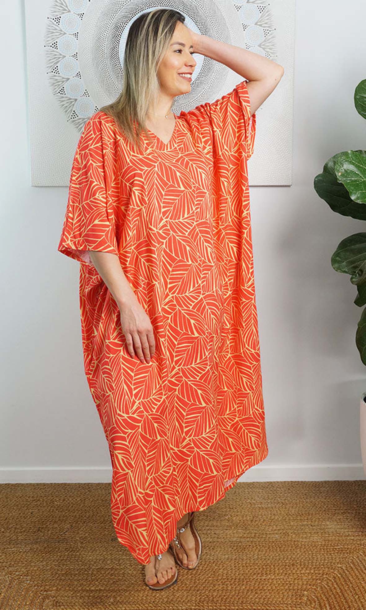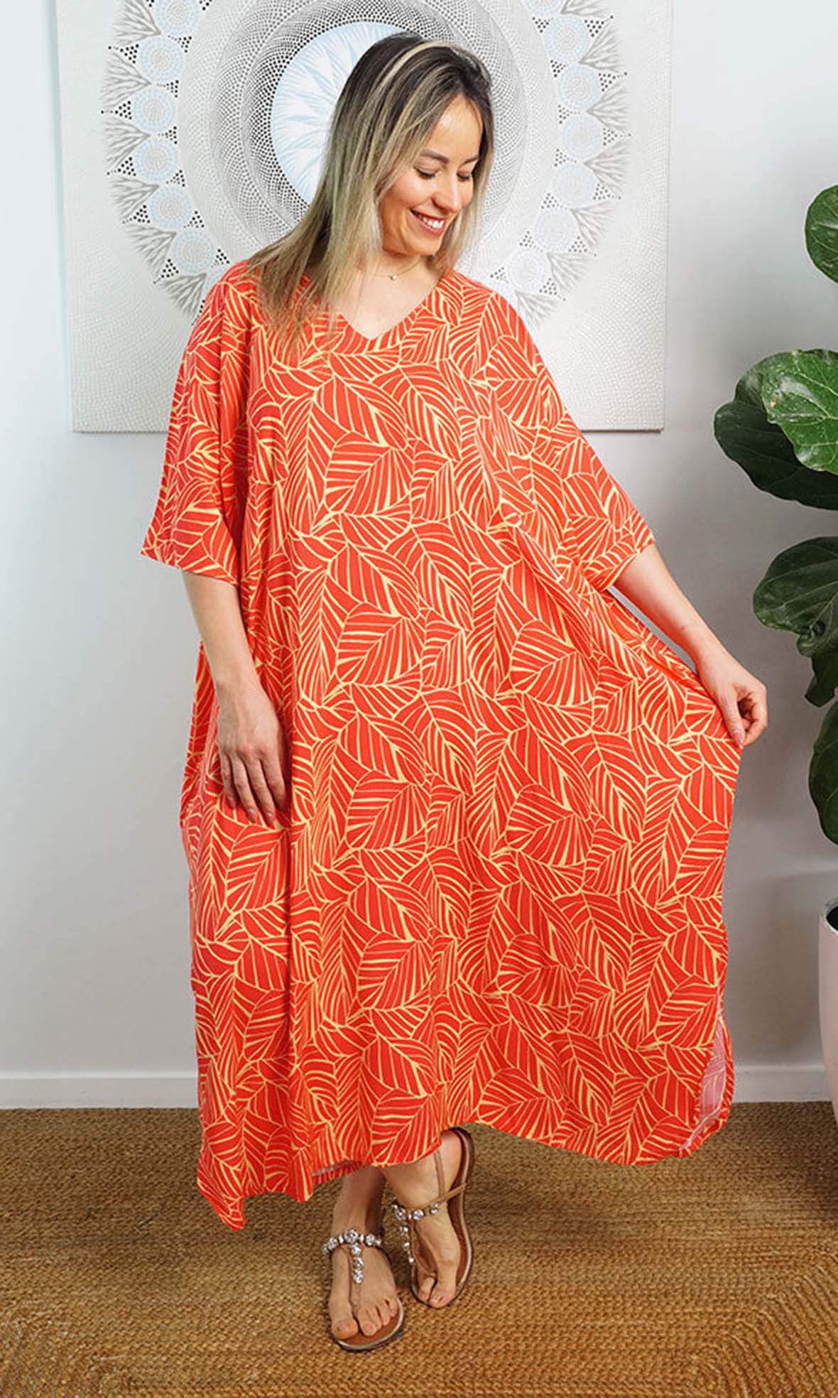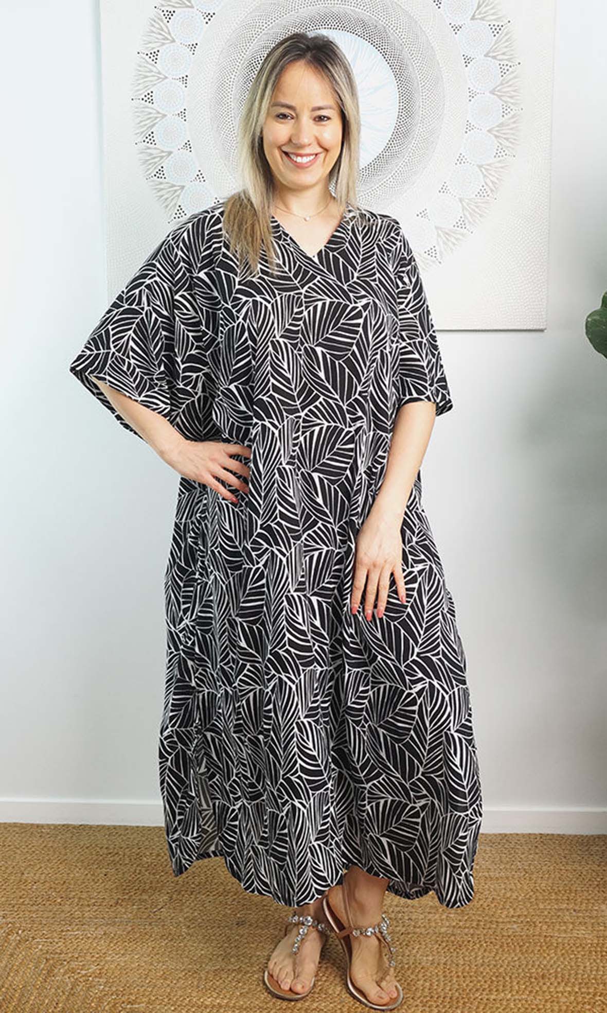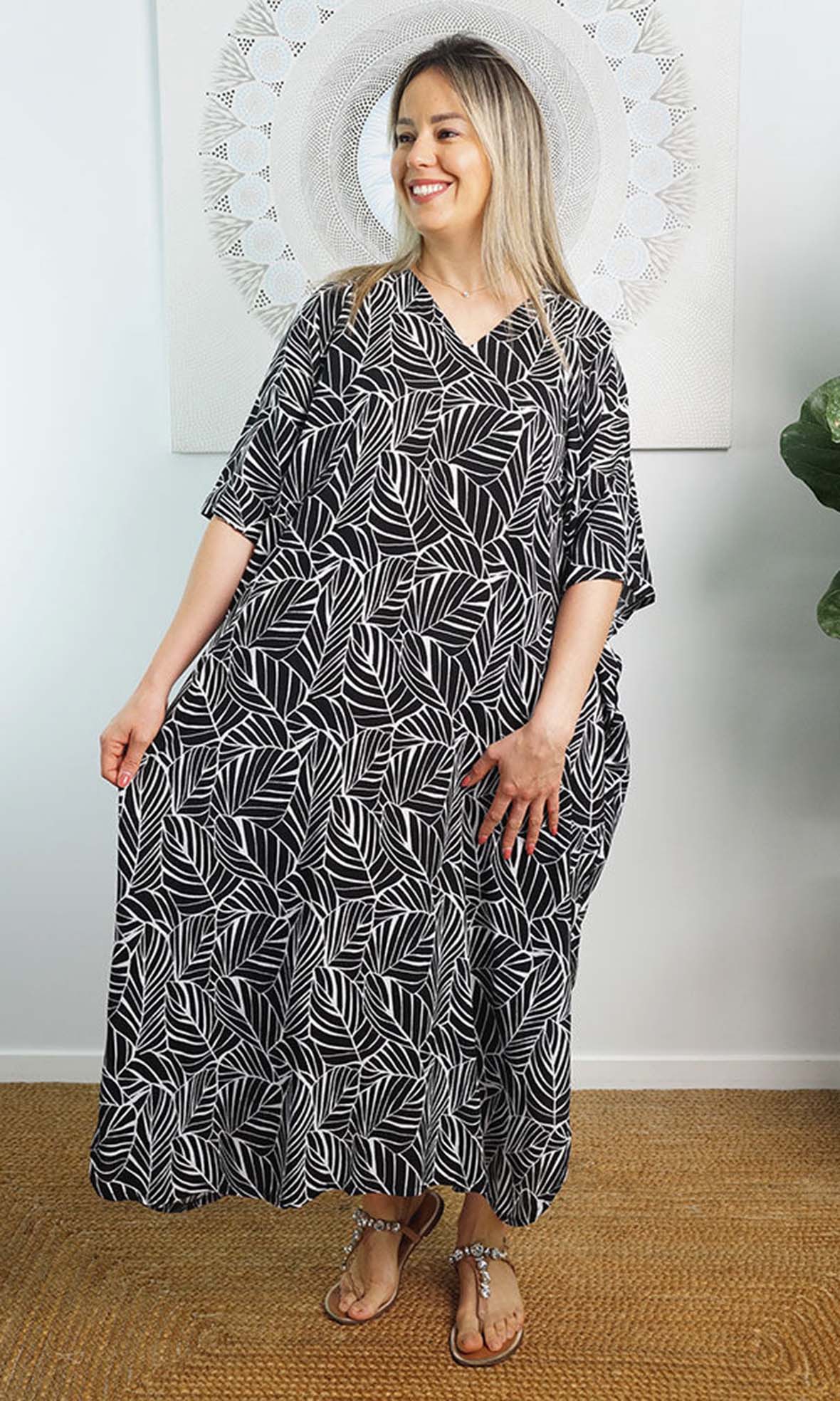 Our kaftans range from rich solid colors to funky patterns. A simple v-neck in the front, side splits on the bottom and a free size from 10-26, this product fits everyone (seriously, these fit everyone).