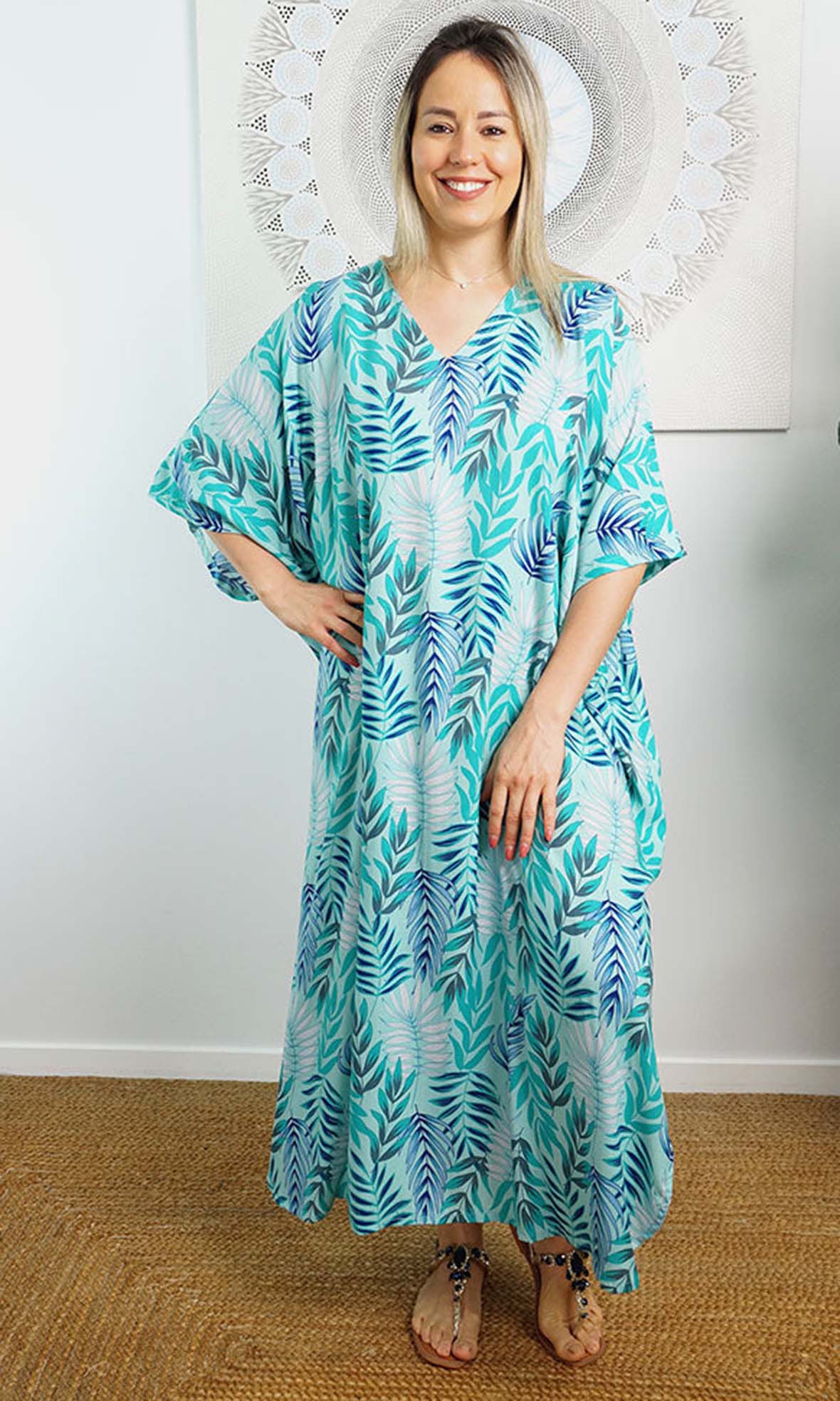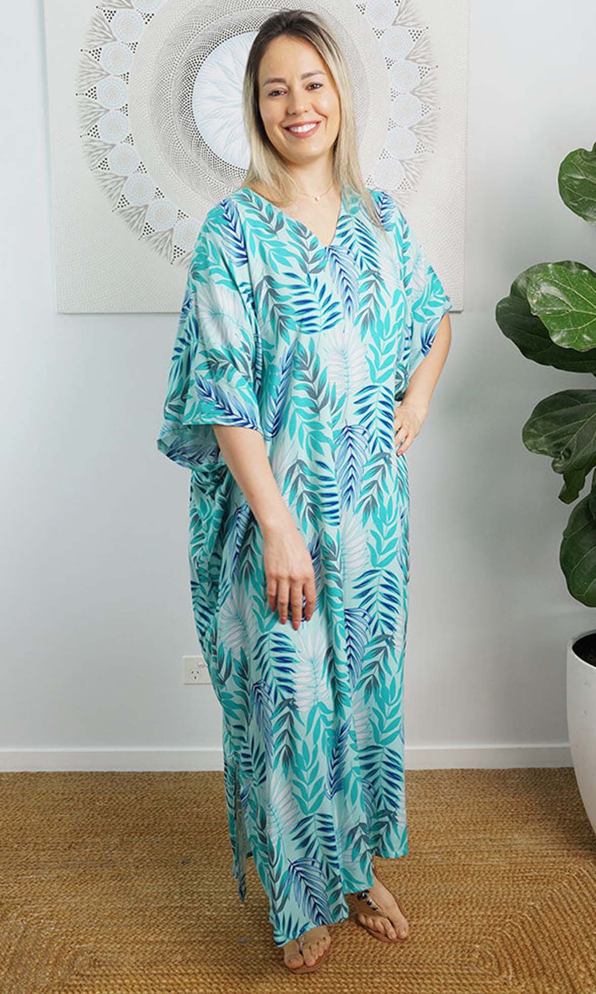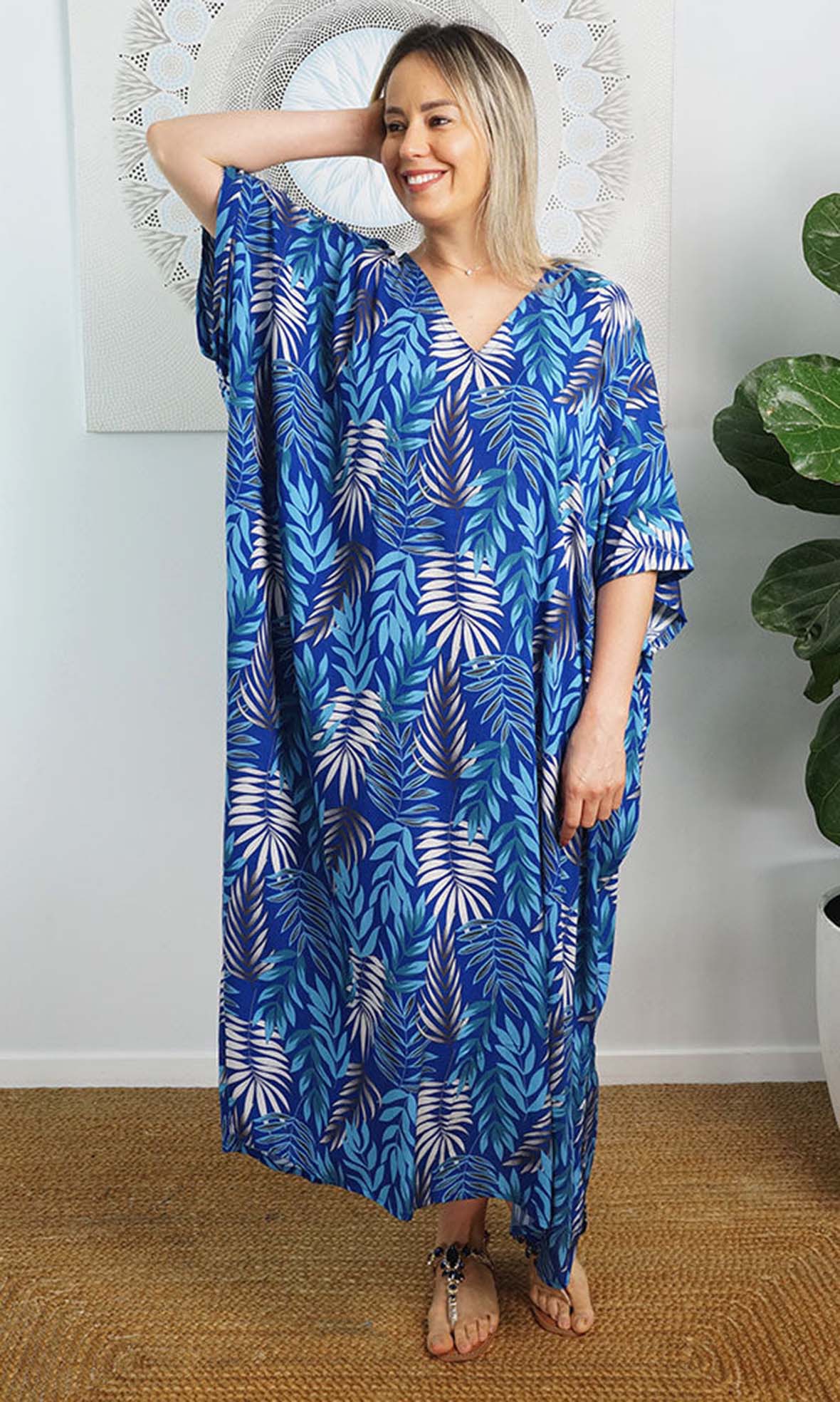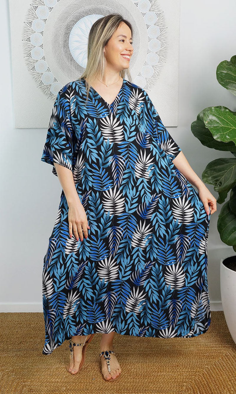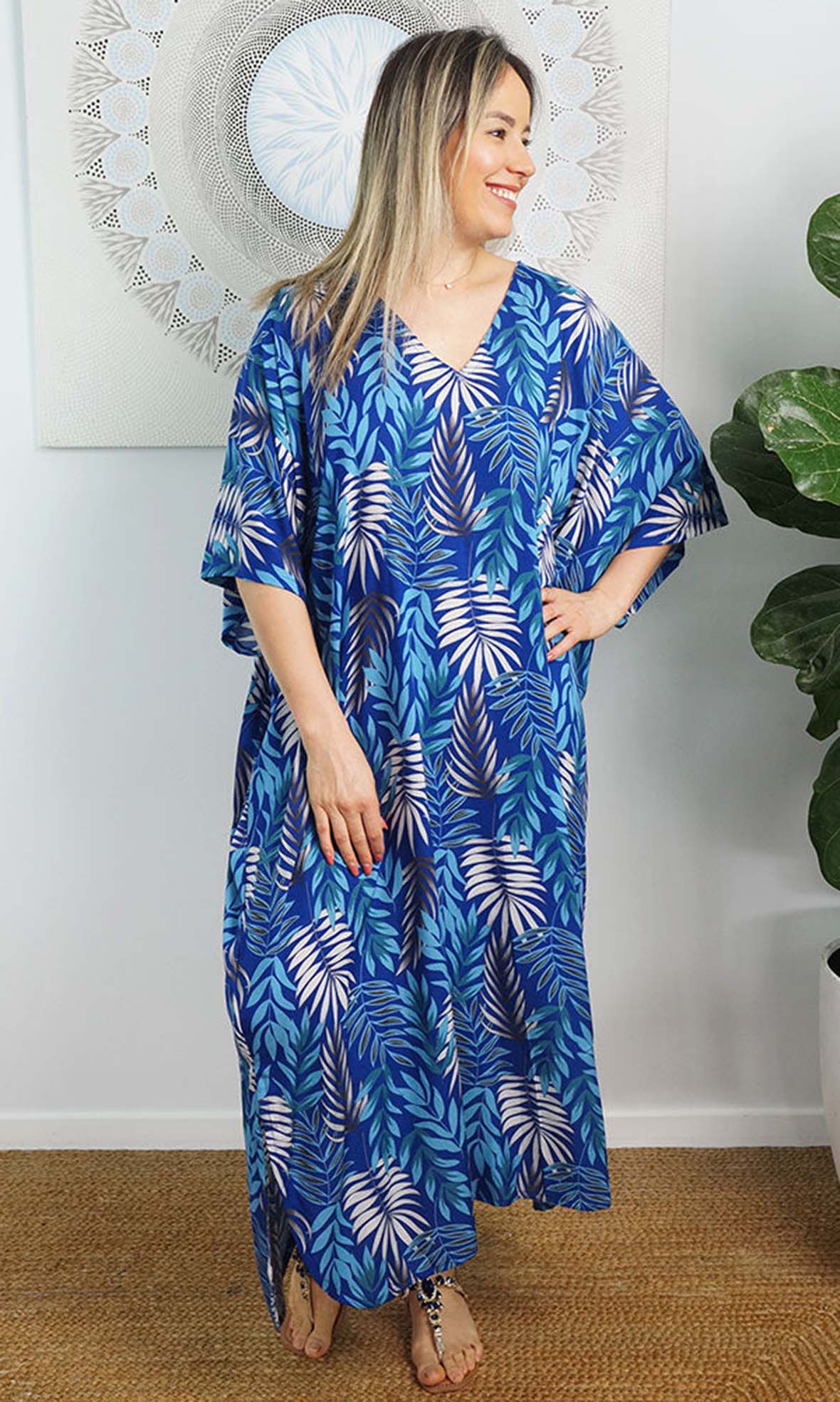 Our kaftans range from rich solid colors to funky patterns. A simple v-neck in the front, side splits on the bottom and a free size from 10-26, this product fits everyone (seriously, these fit everyone).