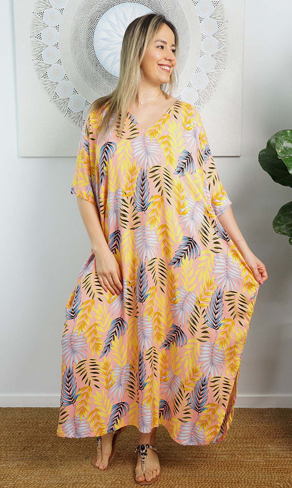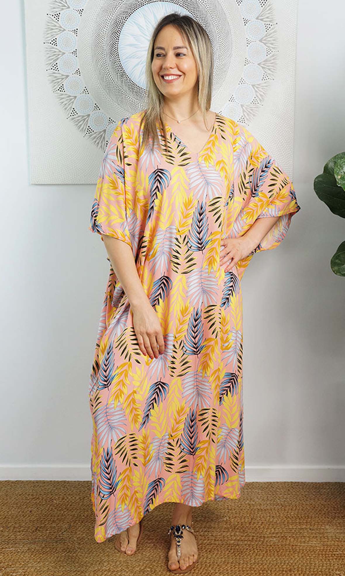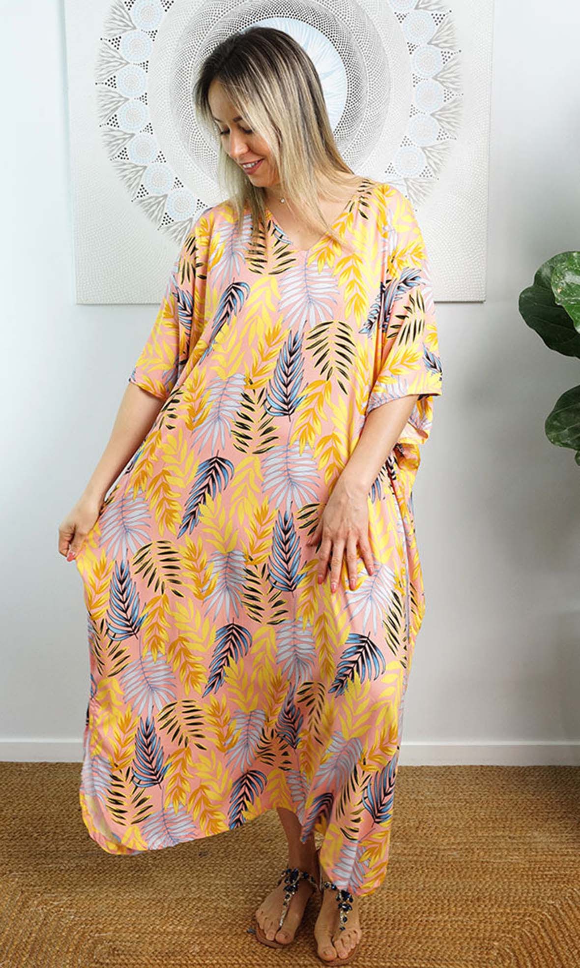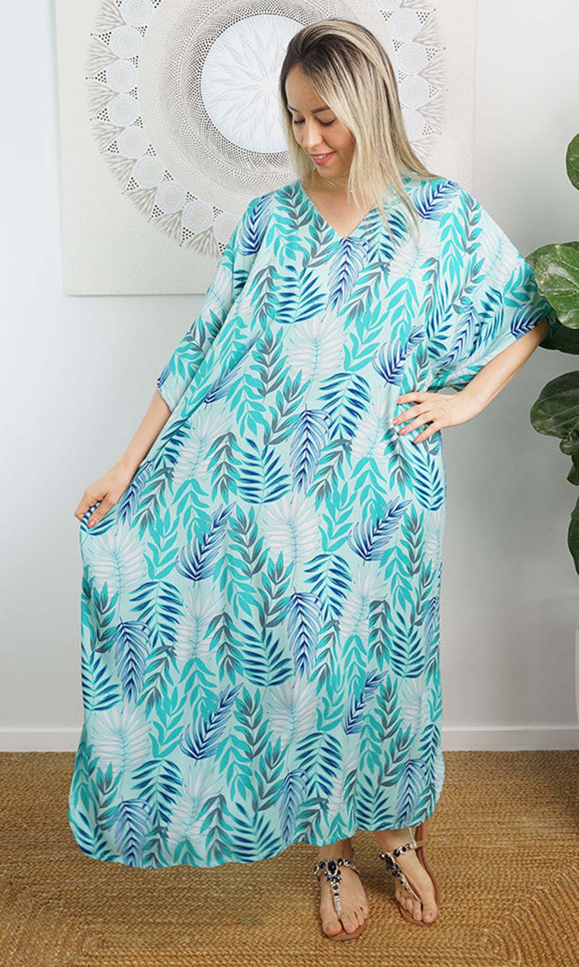 Our kaftans range from rich solid colors to funky patterns. A simple v-neck in the front, side splits on the bottom and a free size from 10-26, this product fits everyone (seriously, these fit everyone).