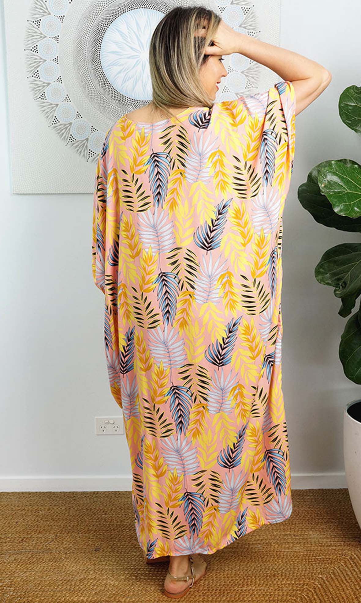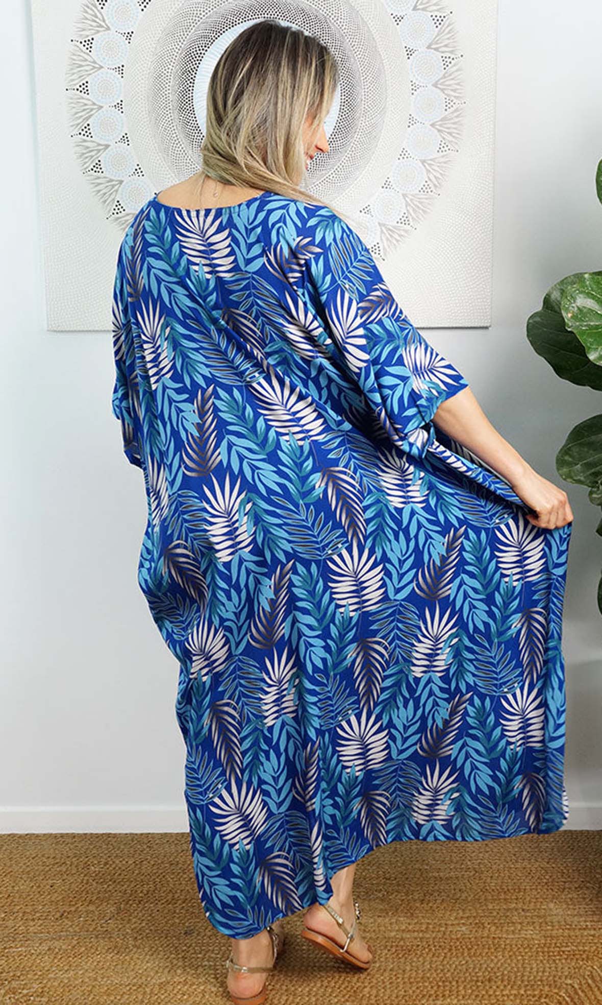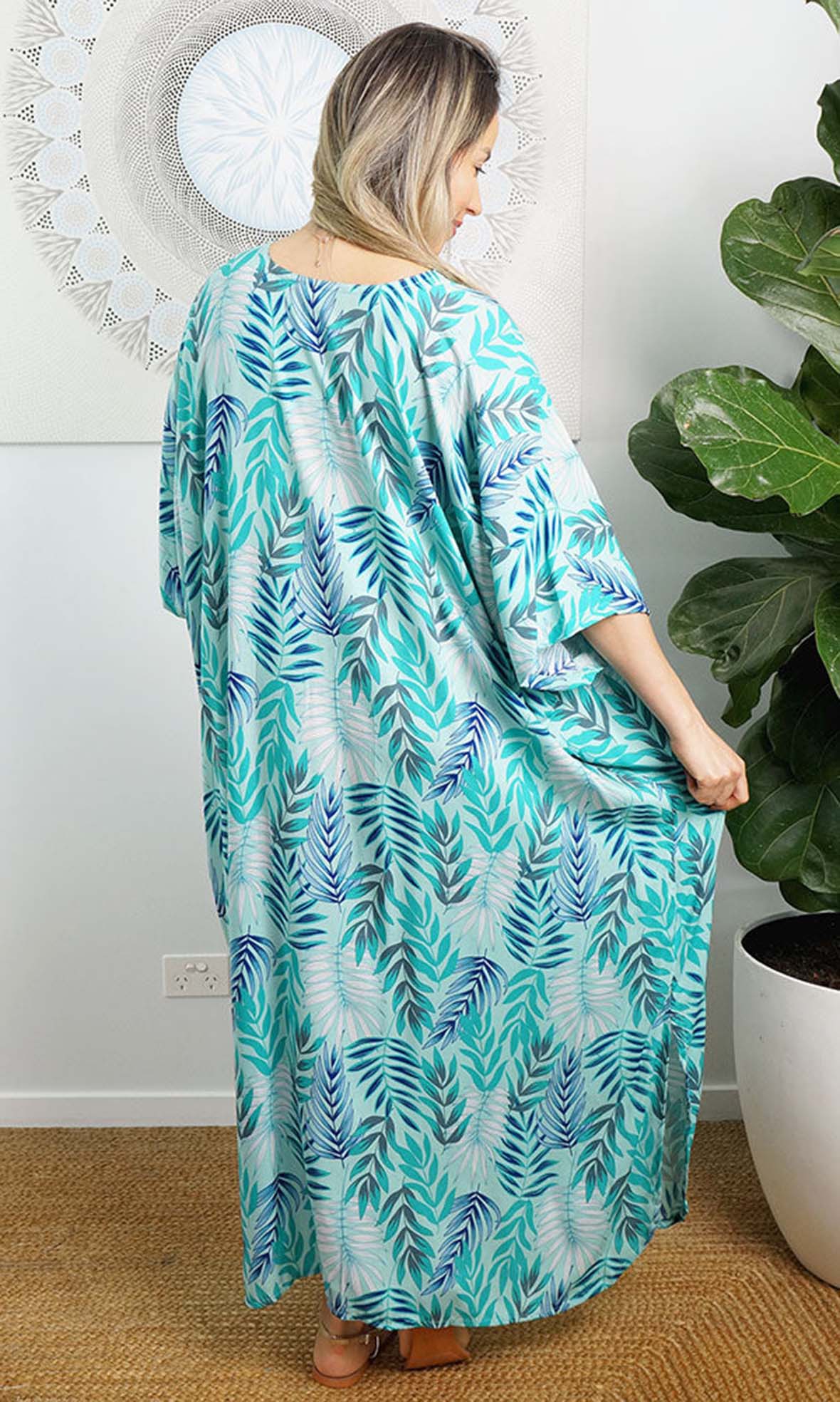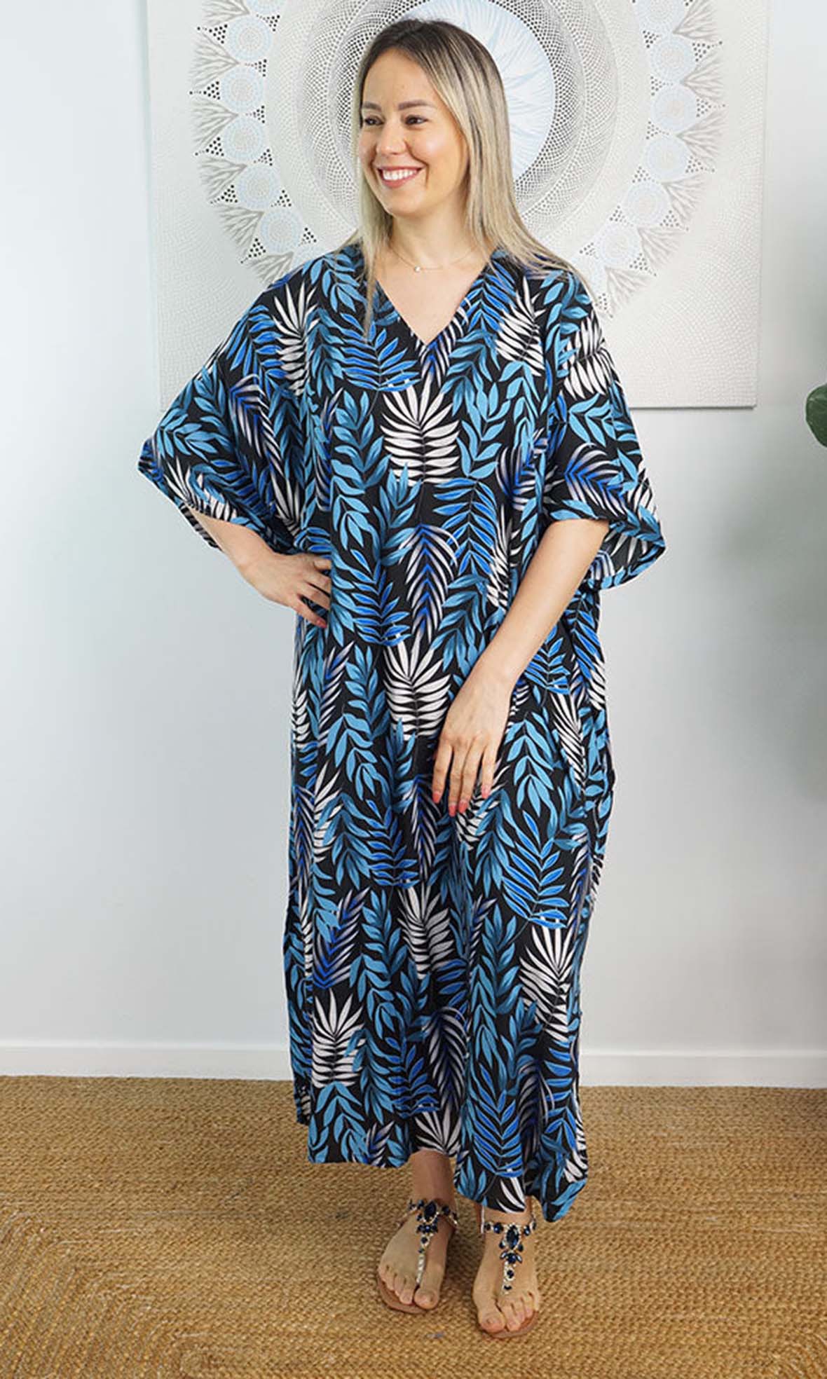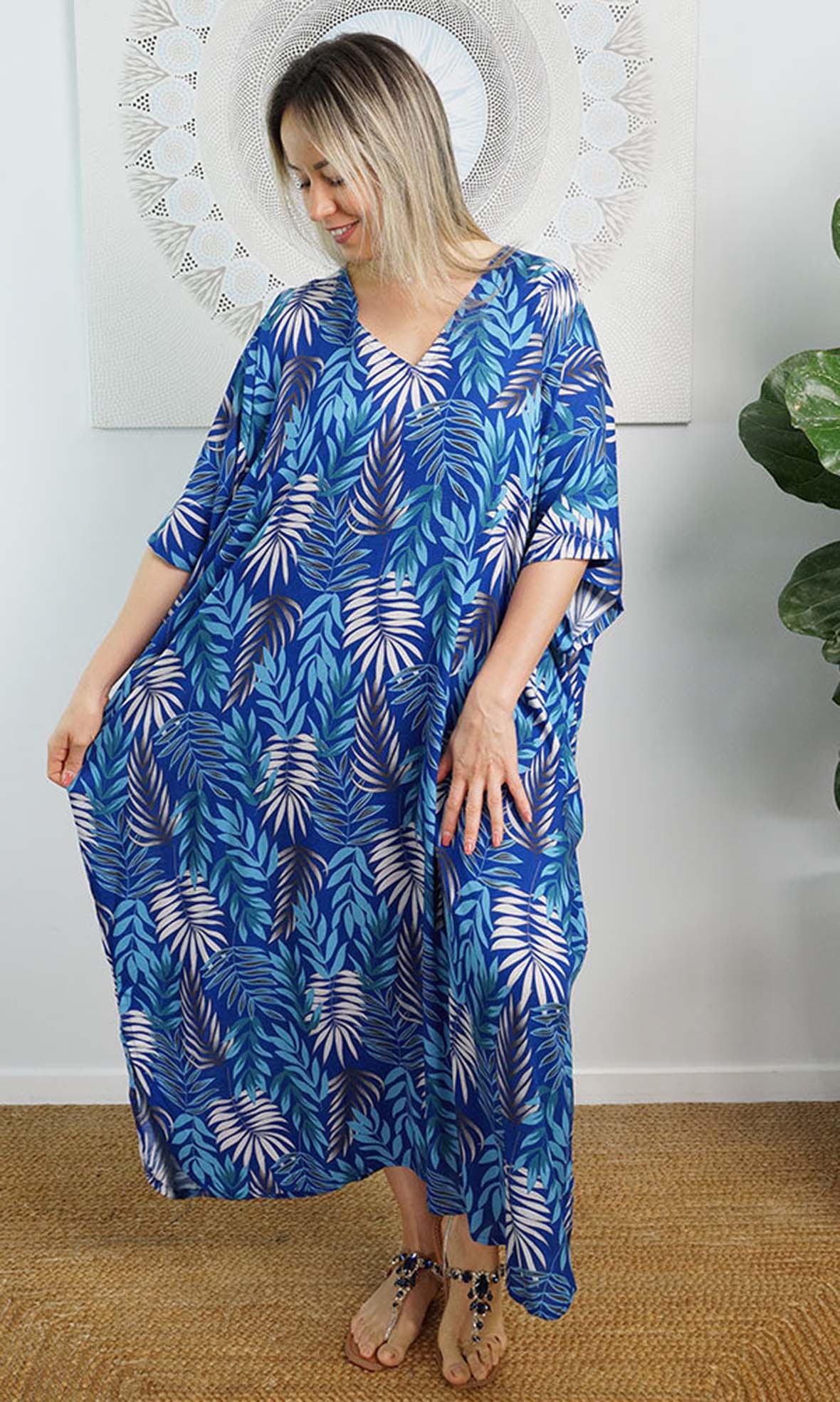 Our kaftans range from rich solid colors to funky patterns. A simple v-neck in the front, side splits on the bottom and a free size from 10-26, this product fits everyone (seriously, these fit everyone).