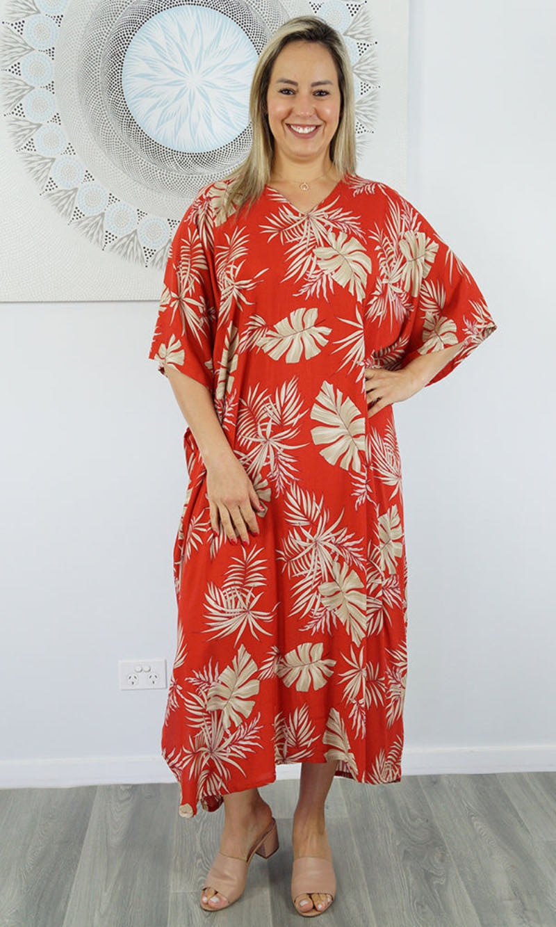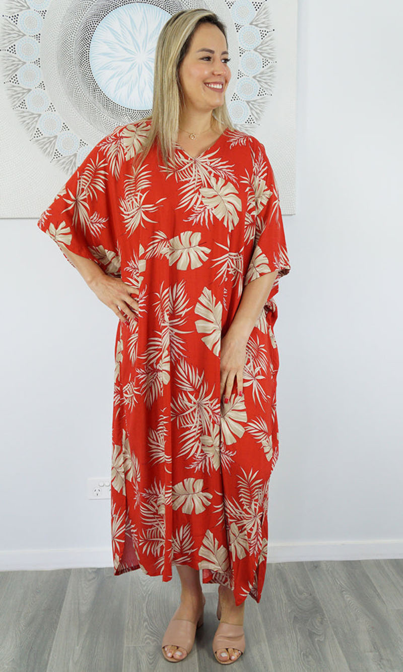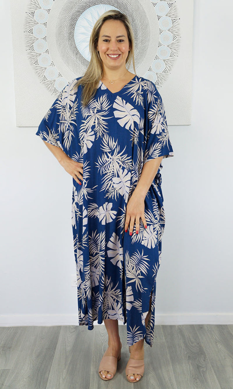 Our kaftans range from rich solid colors to funky patterns. A simple v-neck in the front, side splits on the bottom and a free size from 10-26, this product fits everyone (seriously, these fit everyone).