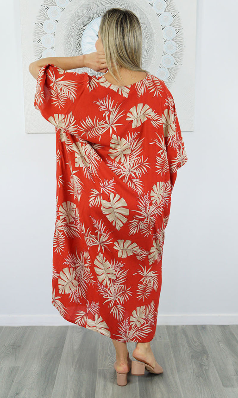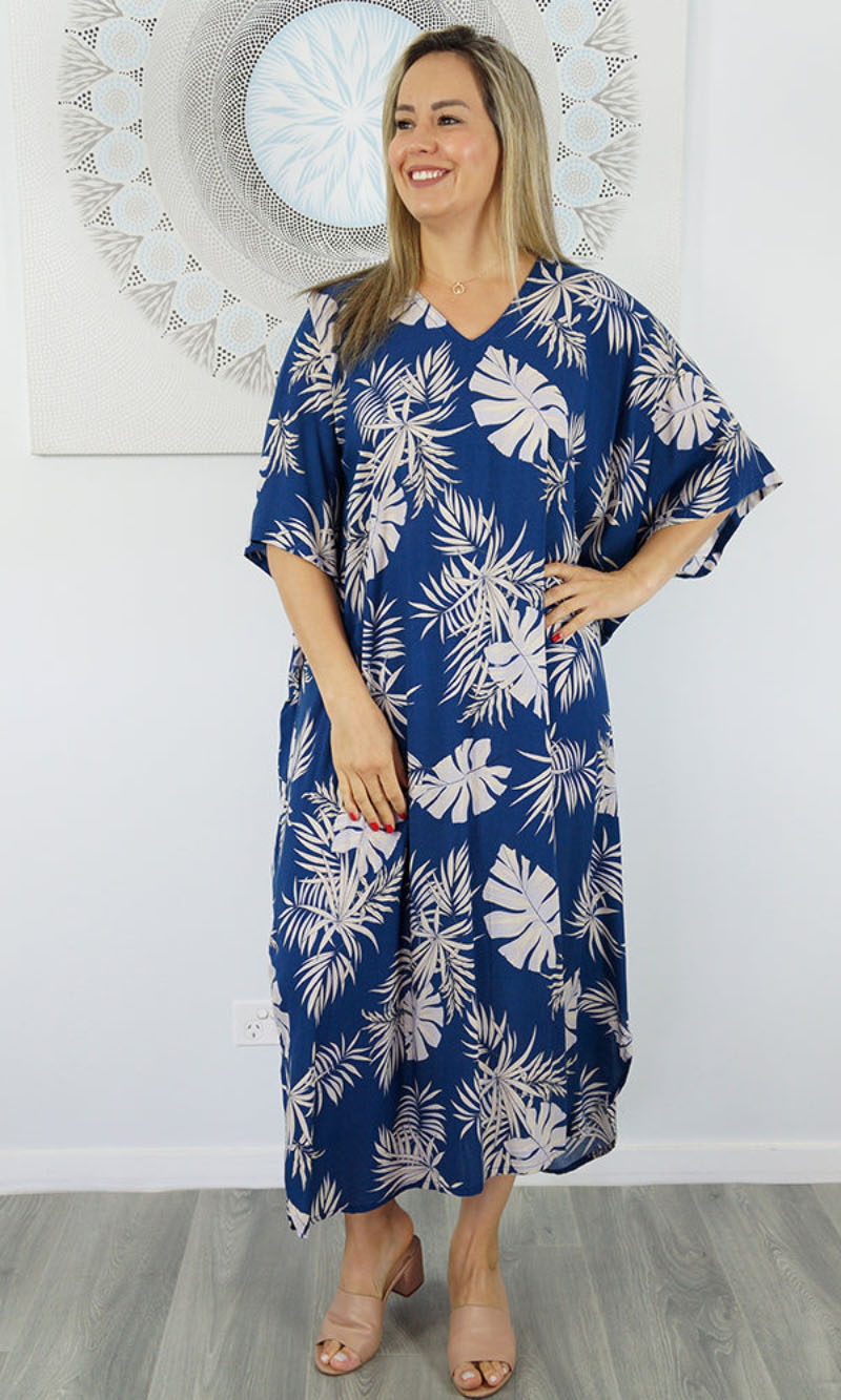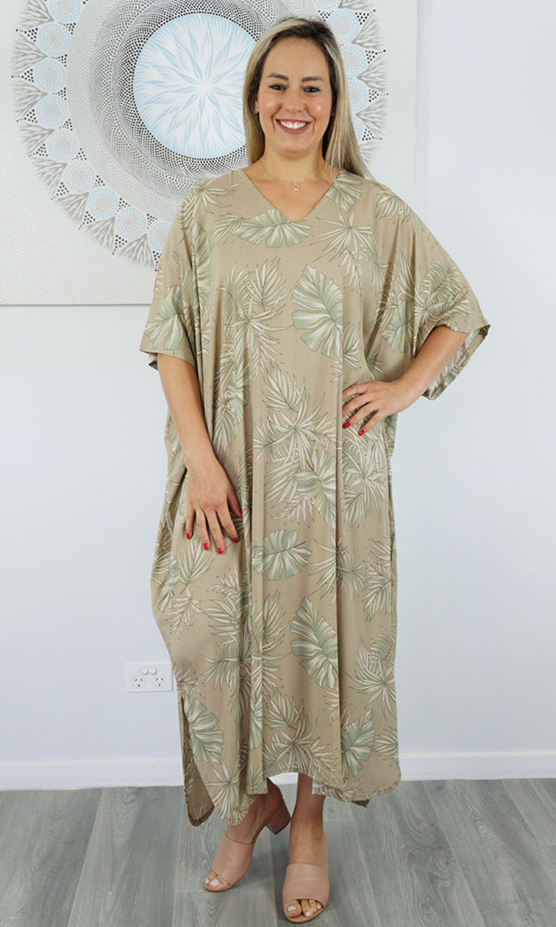 Our kaftans range from rich solid colors to funky patterns. A simple v-neck in the front, side splits on the bottom and a free size from 10-26, this product fits everyone (seriously, these fit everyone).
