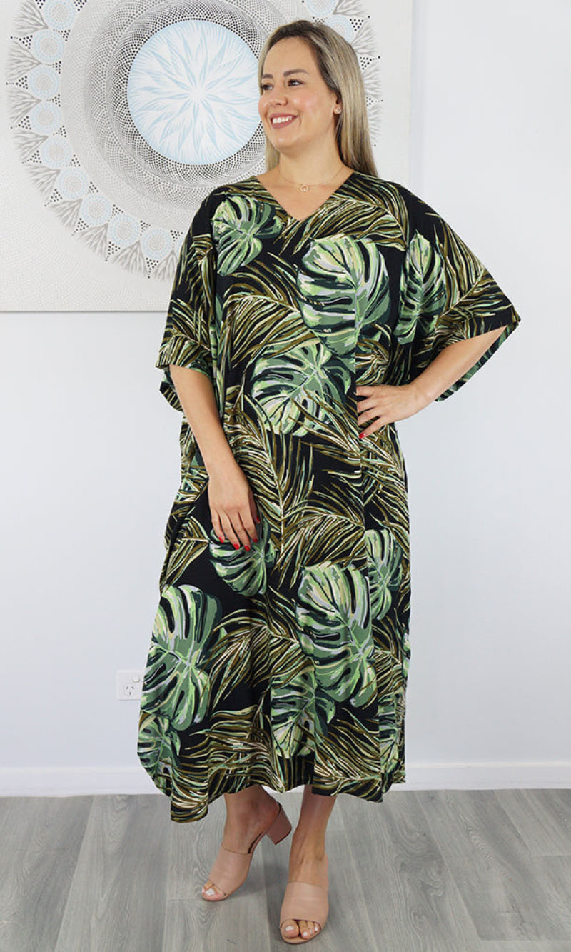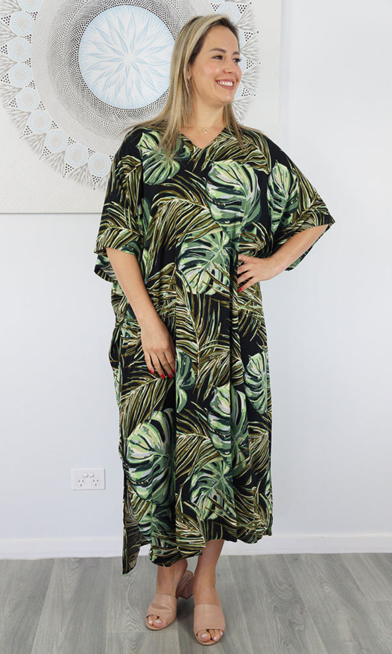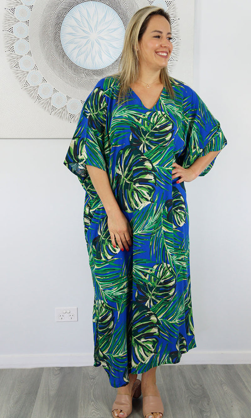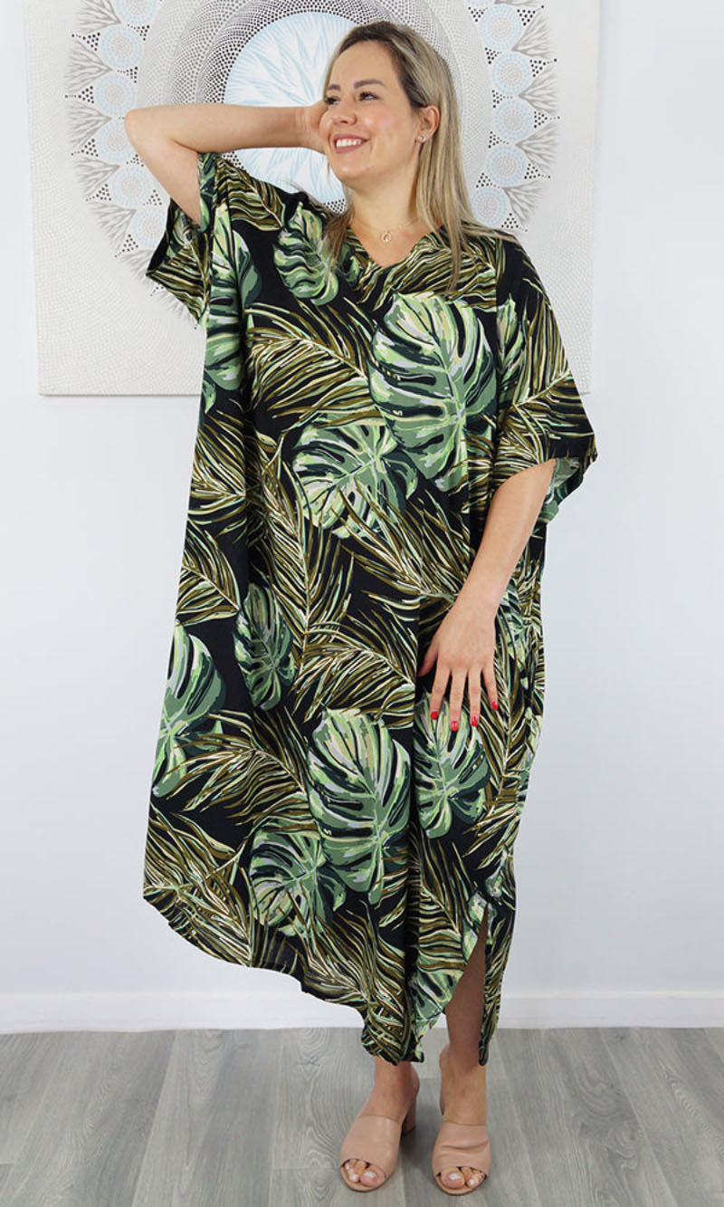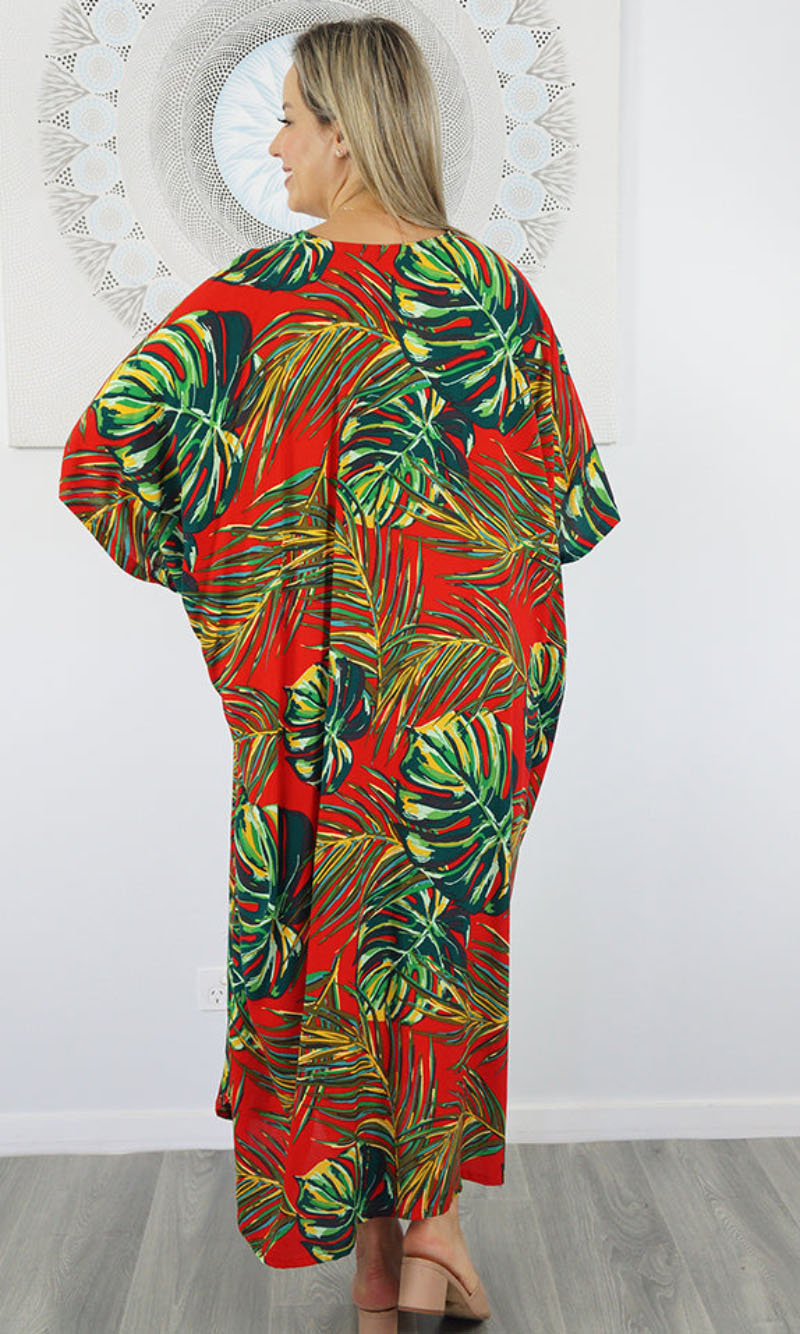 Our kaftans range from rich solid colors to funky patterns. A simple v-neck in the front, side splits on the bottom and a free size from 10-26, this product fits everyone (seriously, these fit everyone).
