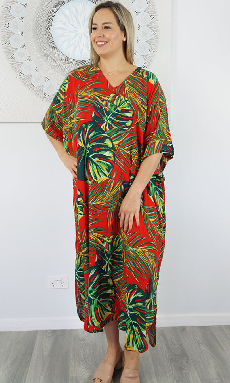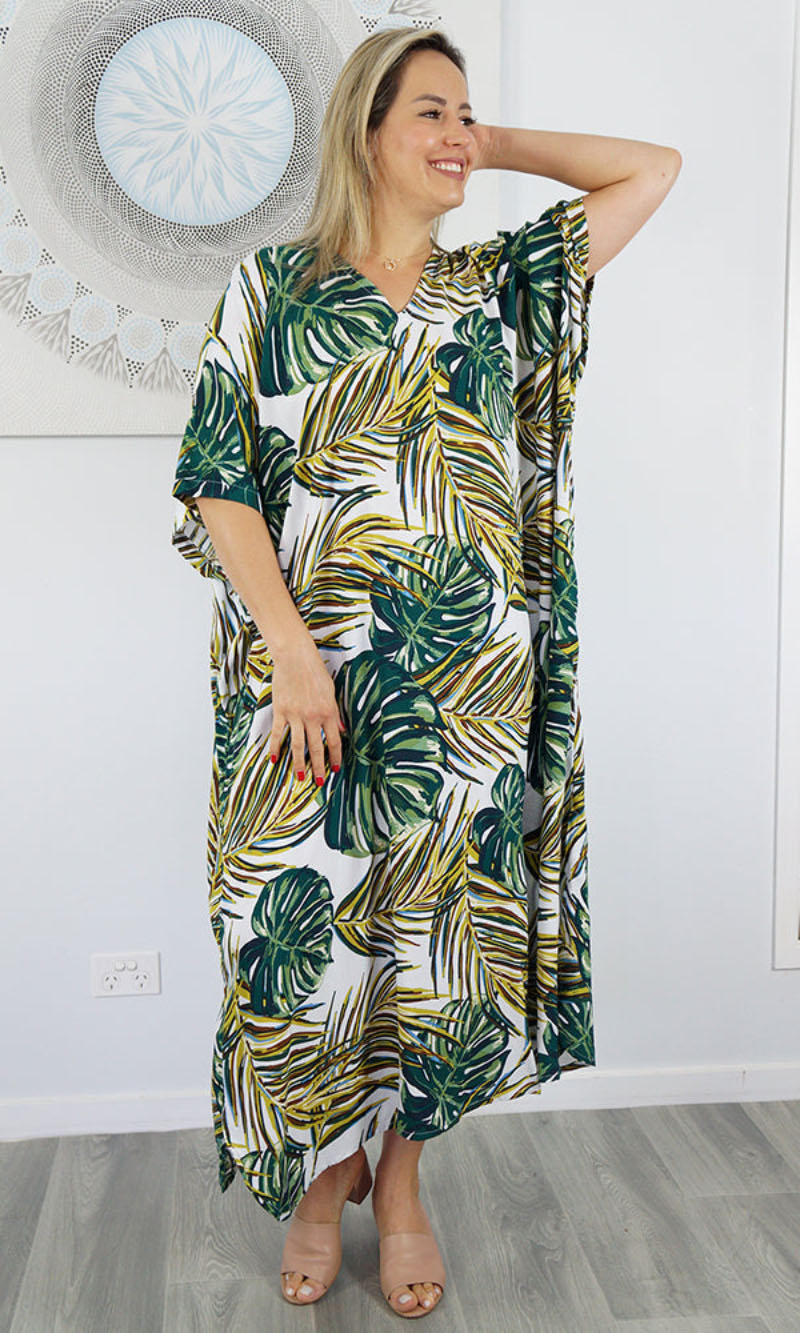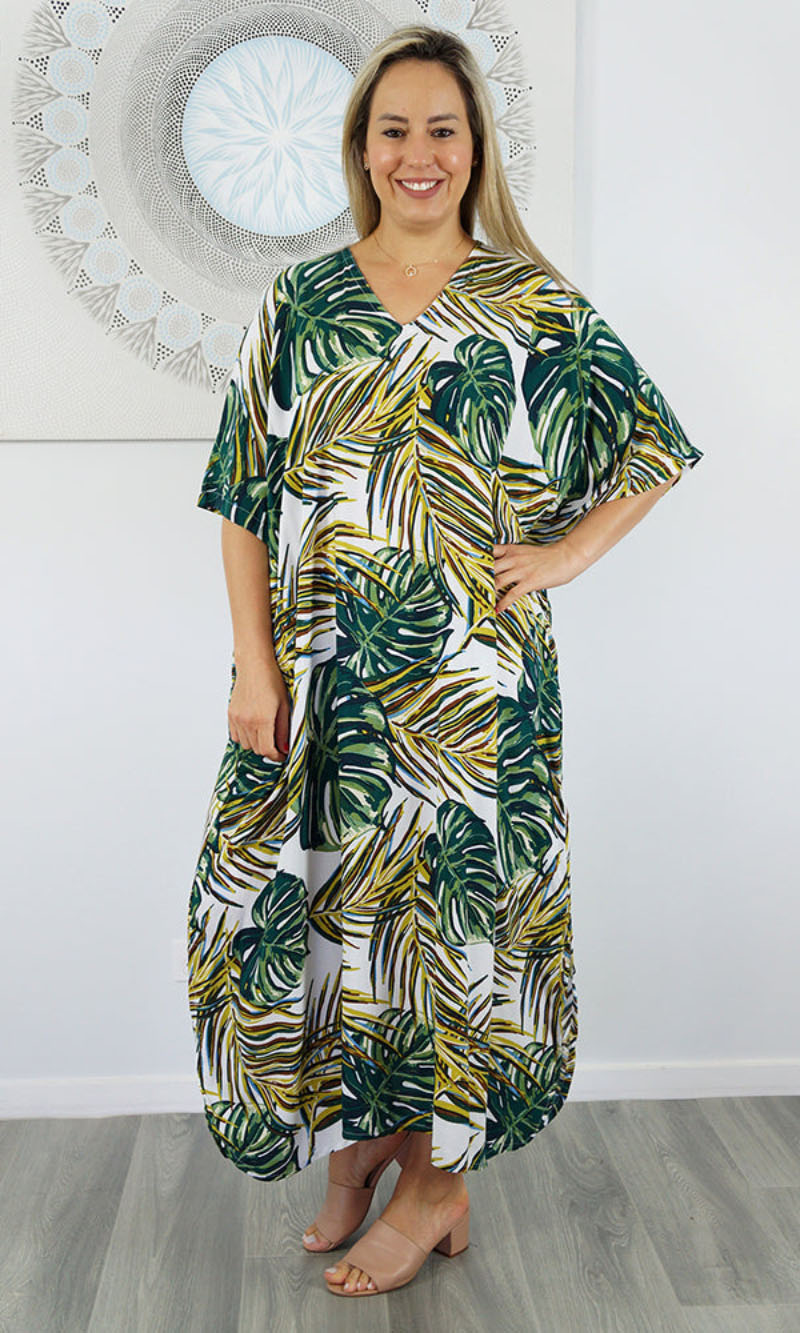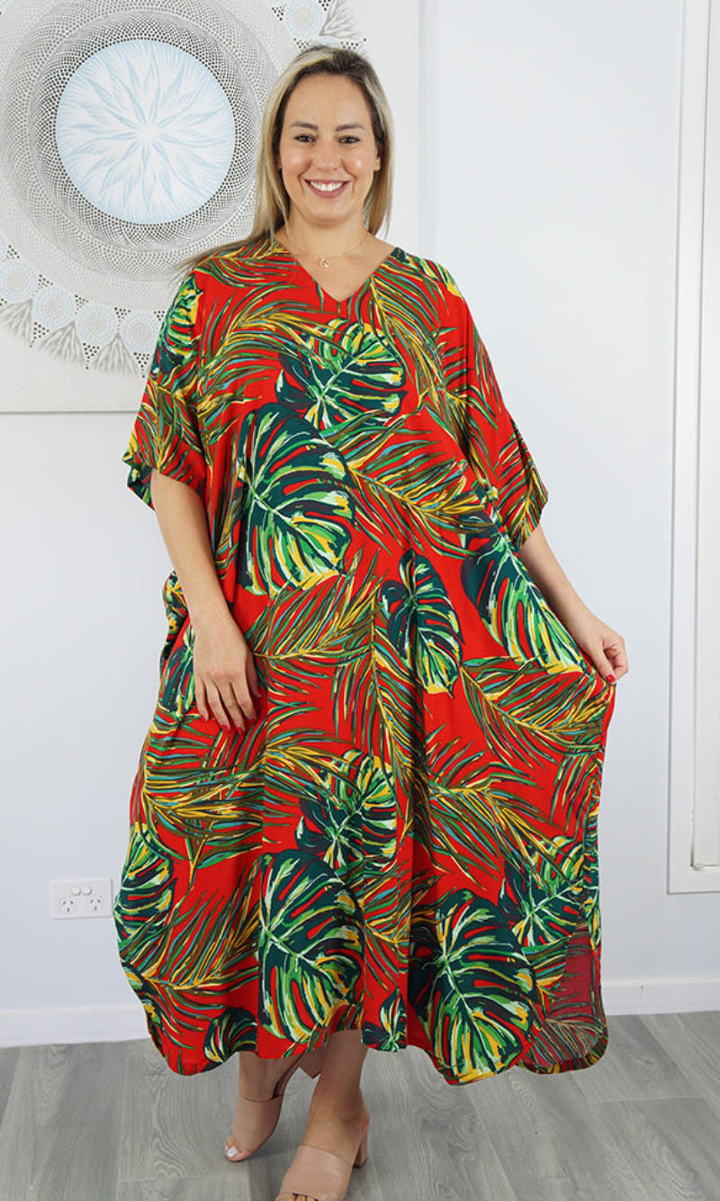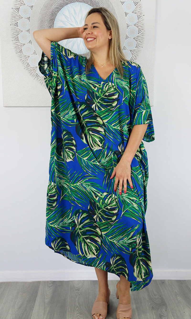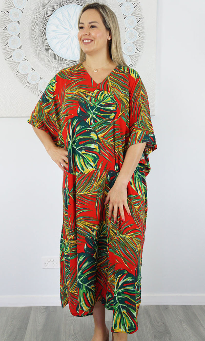Our kaftans range from rich solid colors to funky patterns. A simple v-neck in the front, side splits on the bottom and a free size from 10-26, this product fits everyone (seriously, these fit everyone).