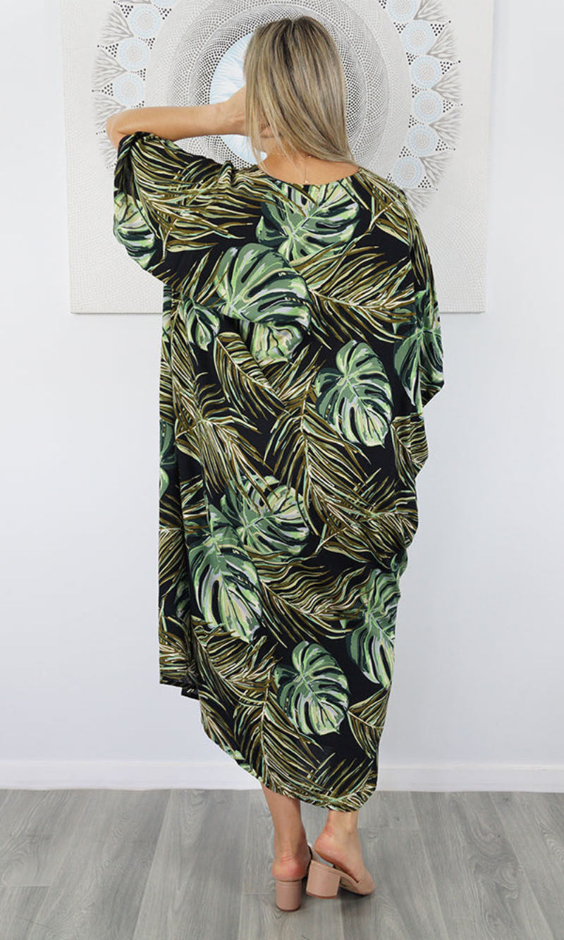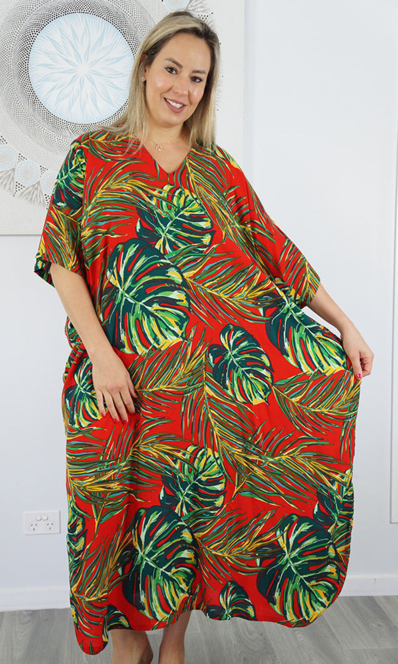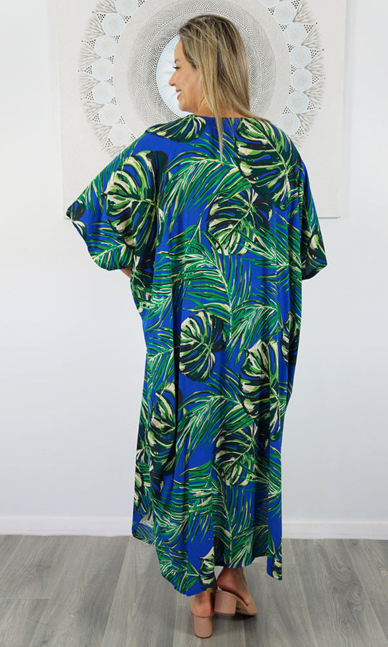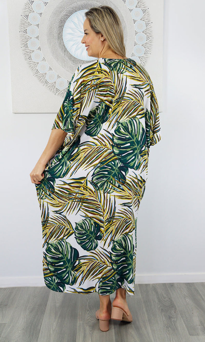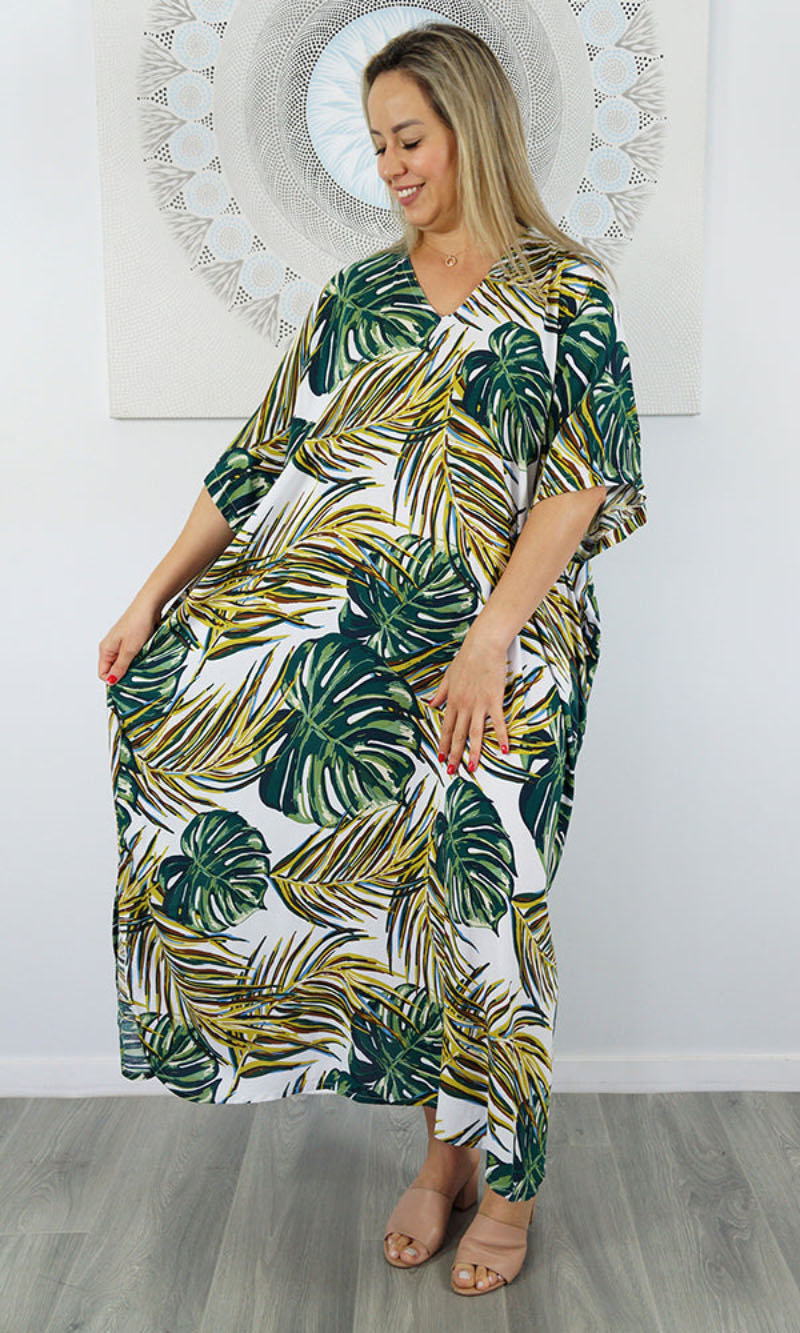Our kaftans range from rich solid colors to funky patterns. A simple v-neck in the front, side splits on the bottom and a free size from 10-26, this product fits everyone (seriously, these fit everyone).