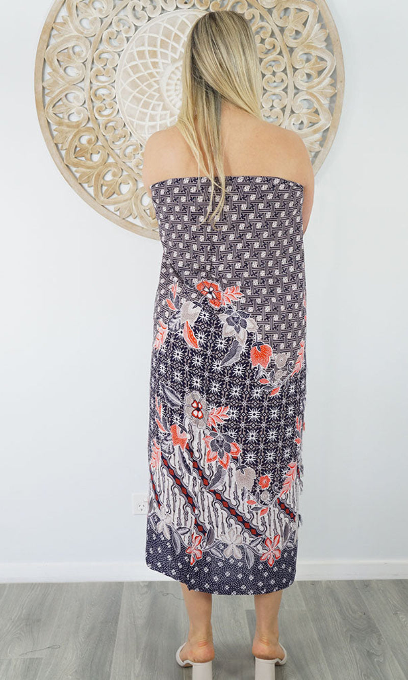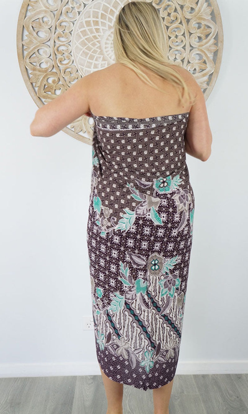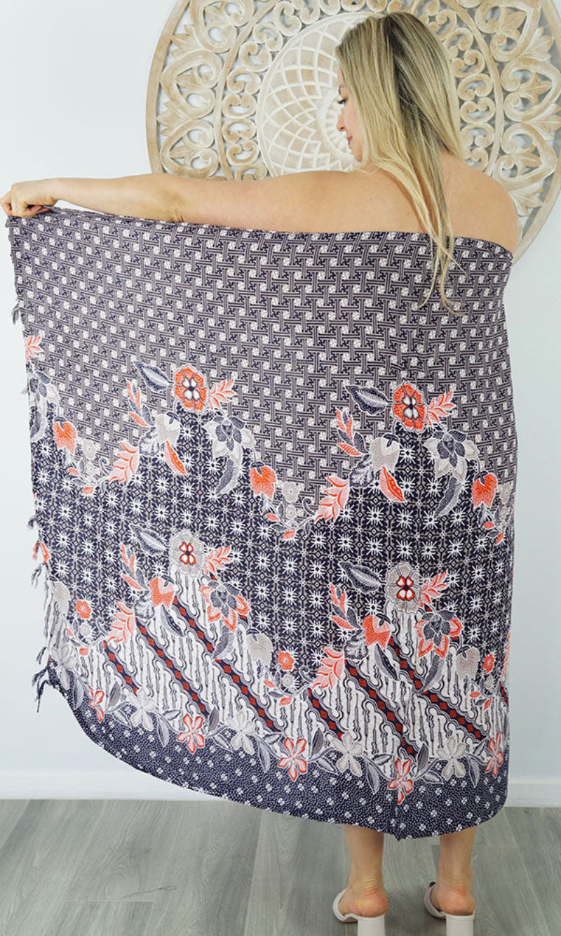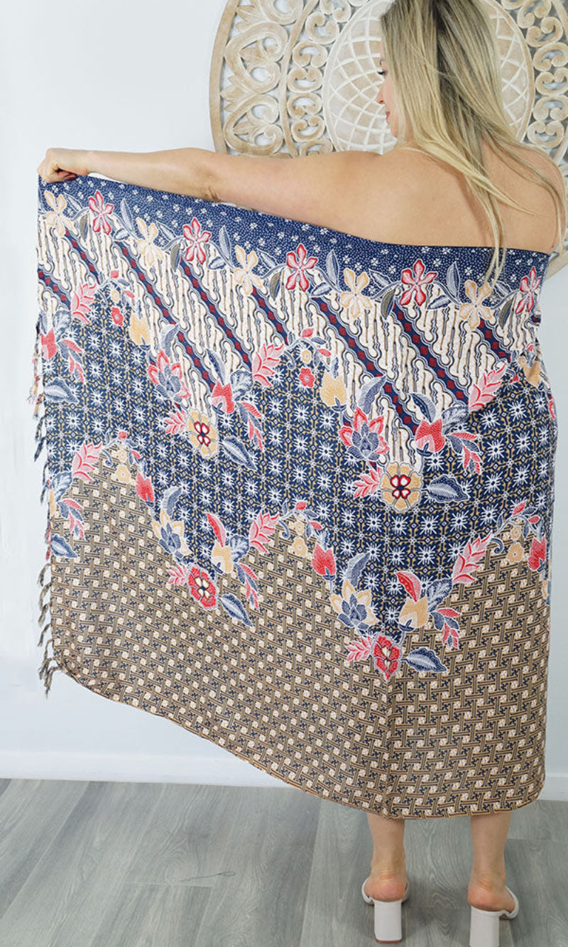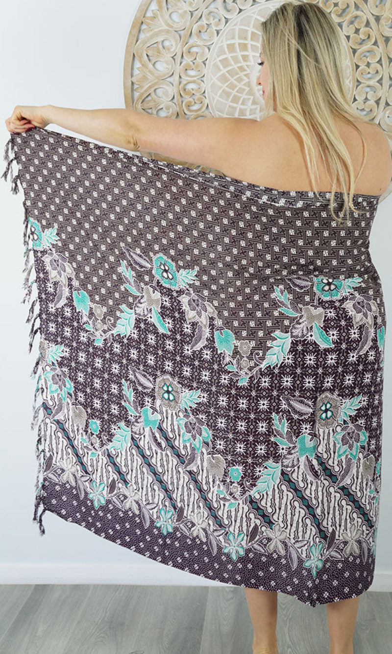 These Batik inspired "Kupang" printed sarongs are a great cover up for a day at the beach, pool, lake or wherever else your heart desires. Sarong measures approximately 1.8M x 1.15M on fringed lightweight rayon.