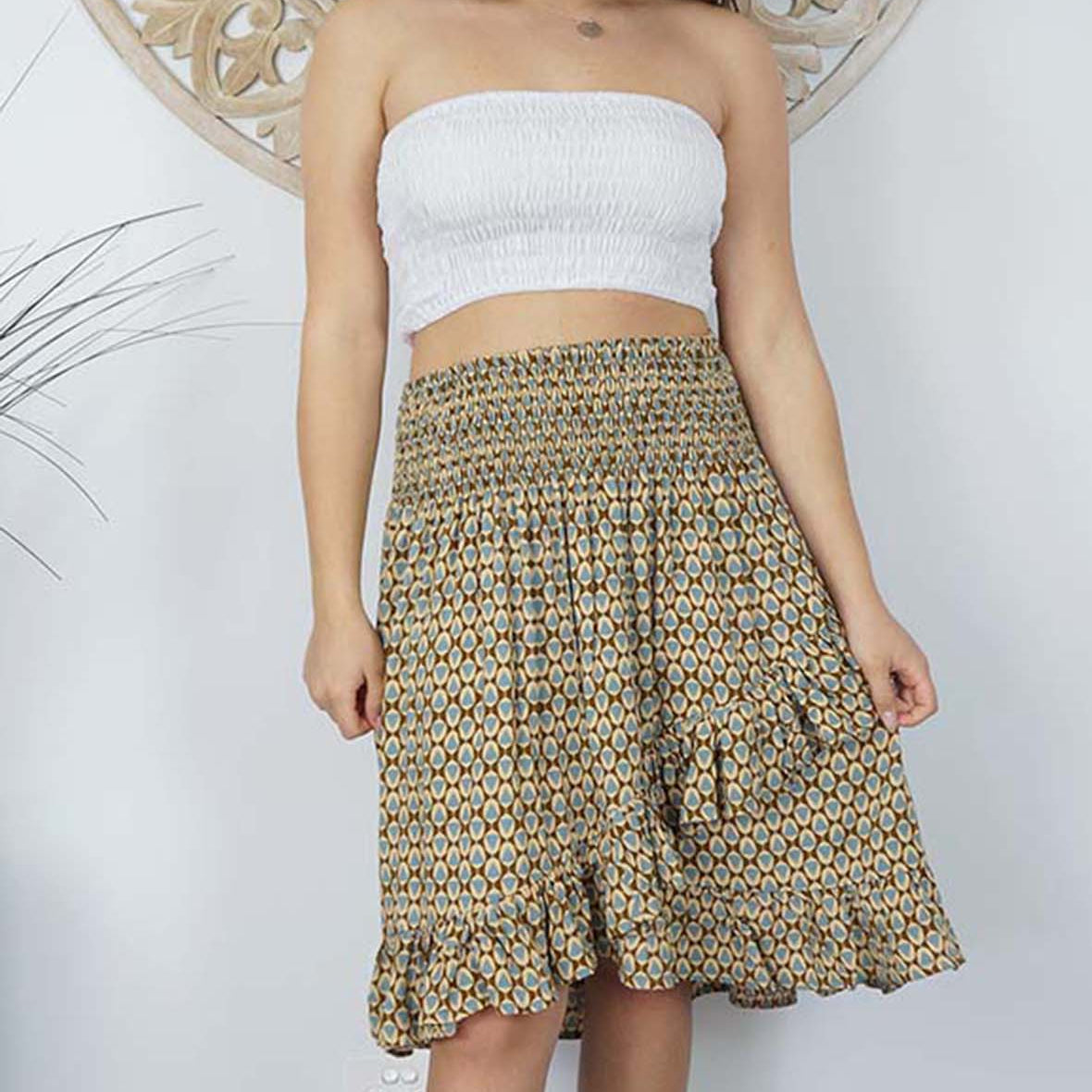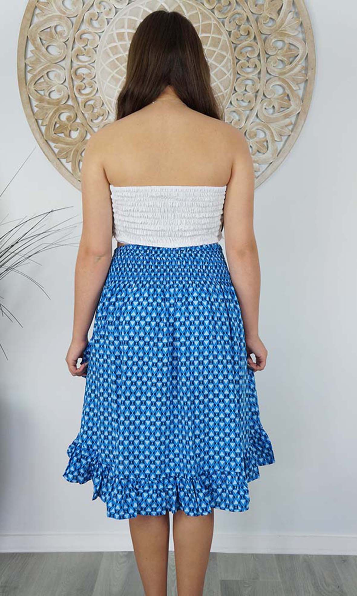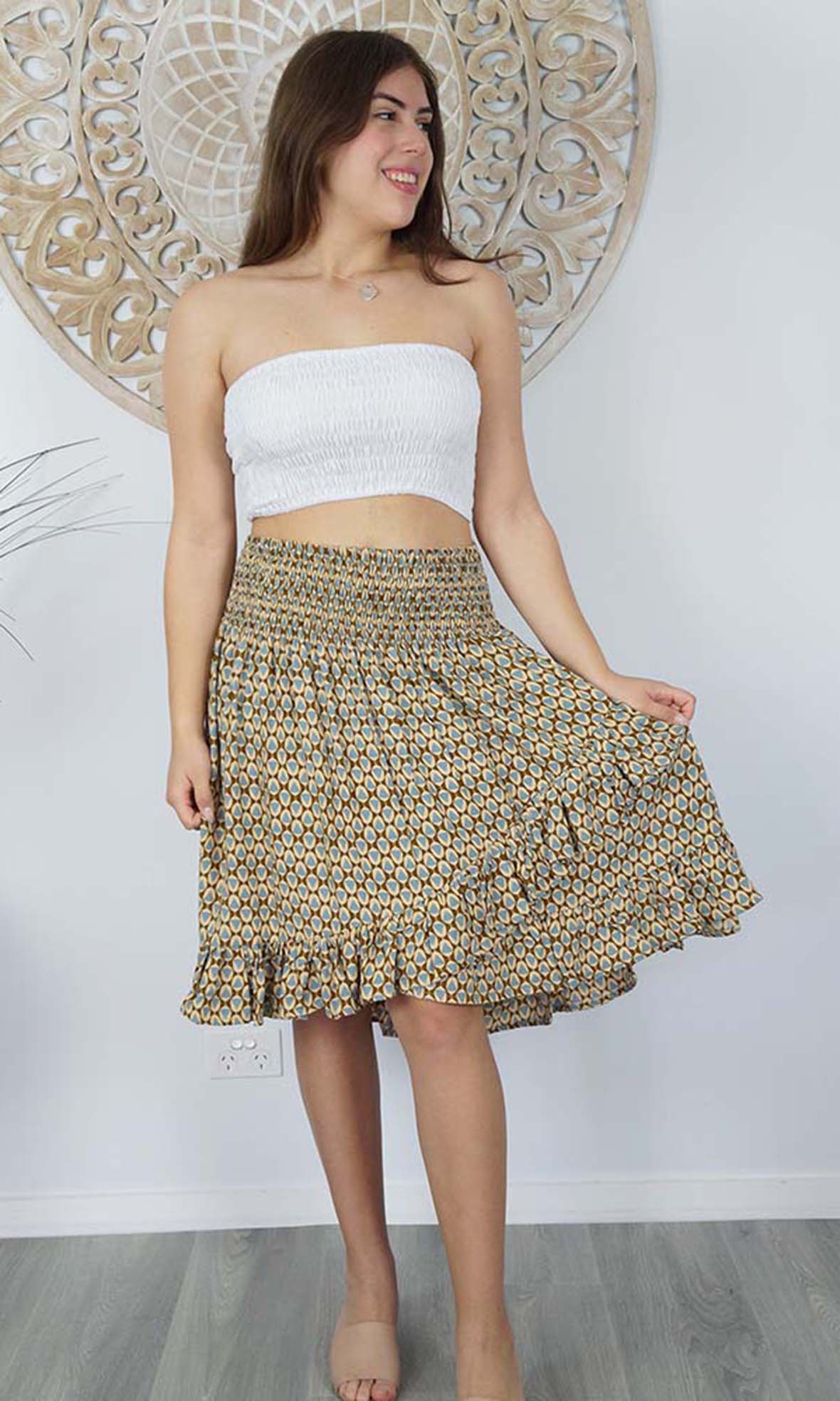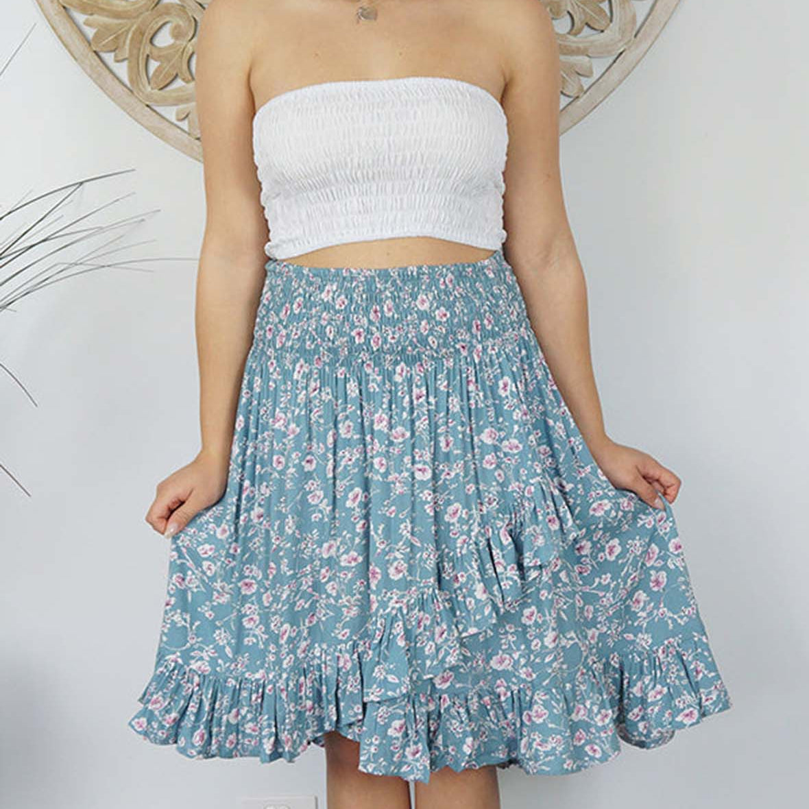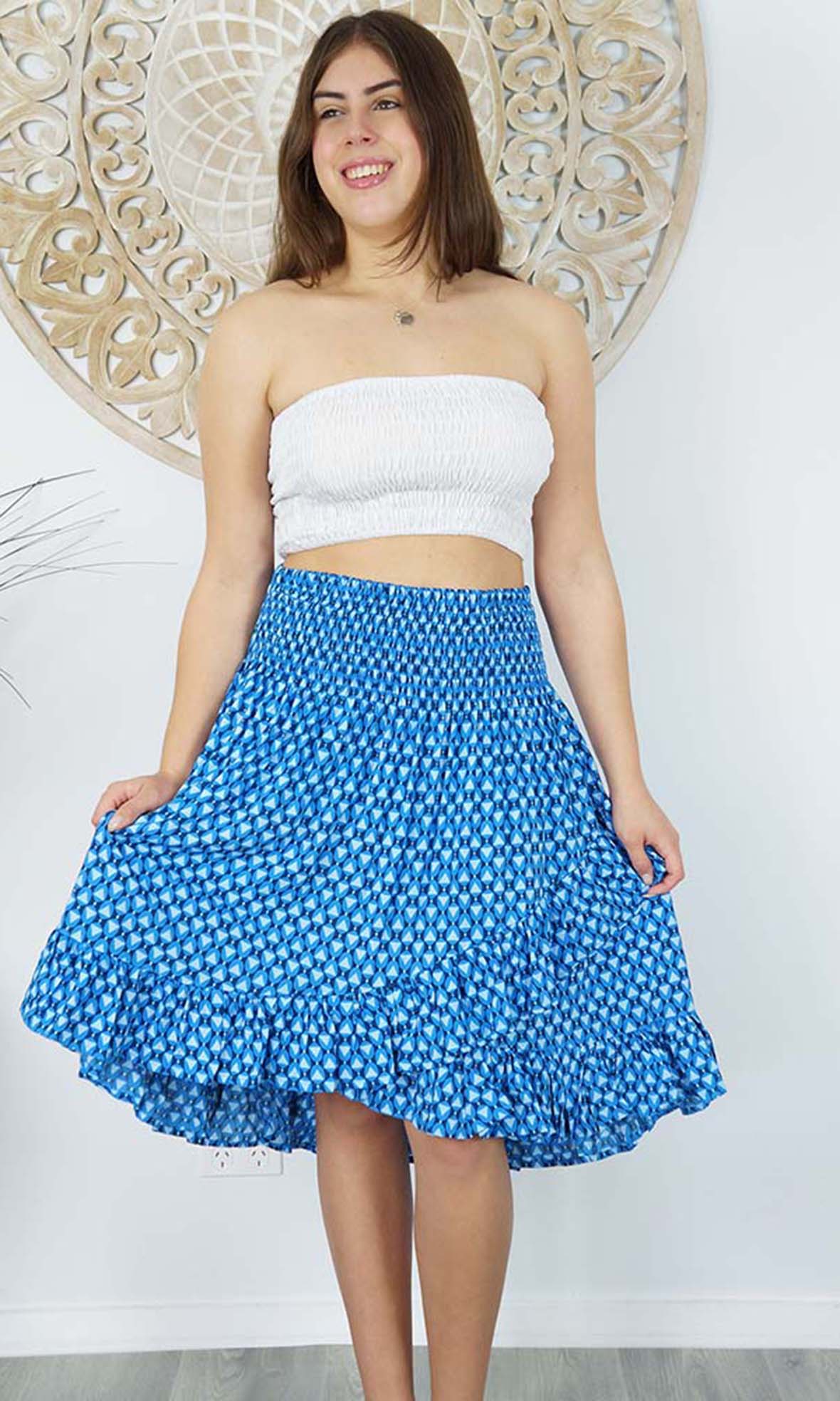 This rayon skirt features an elastic shirring waist, and curved frilled edging. ONE SIZE TO FIT 10-16