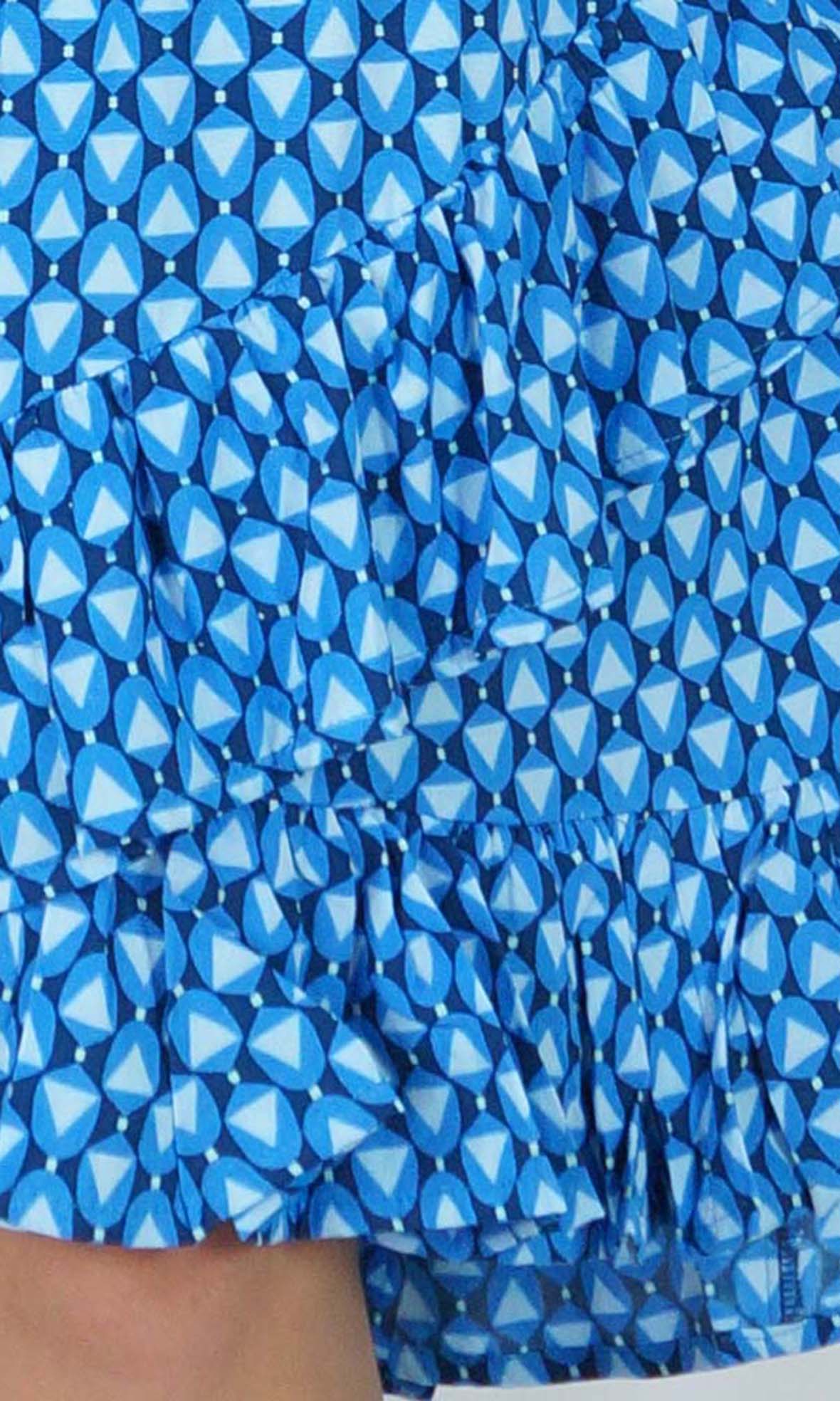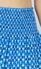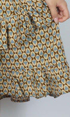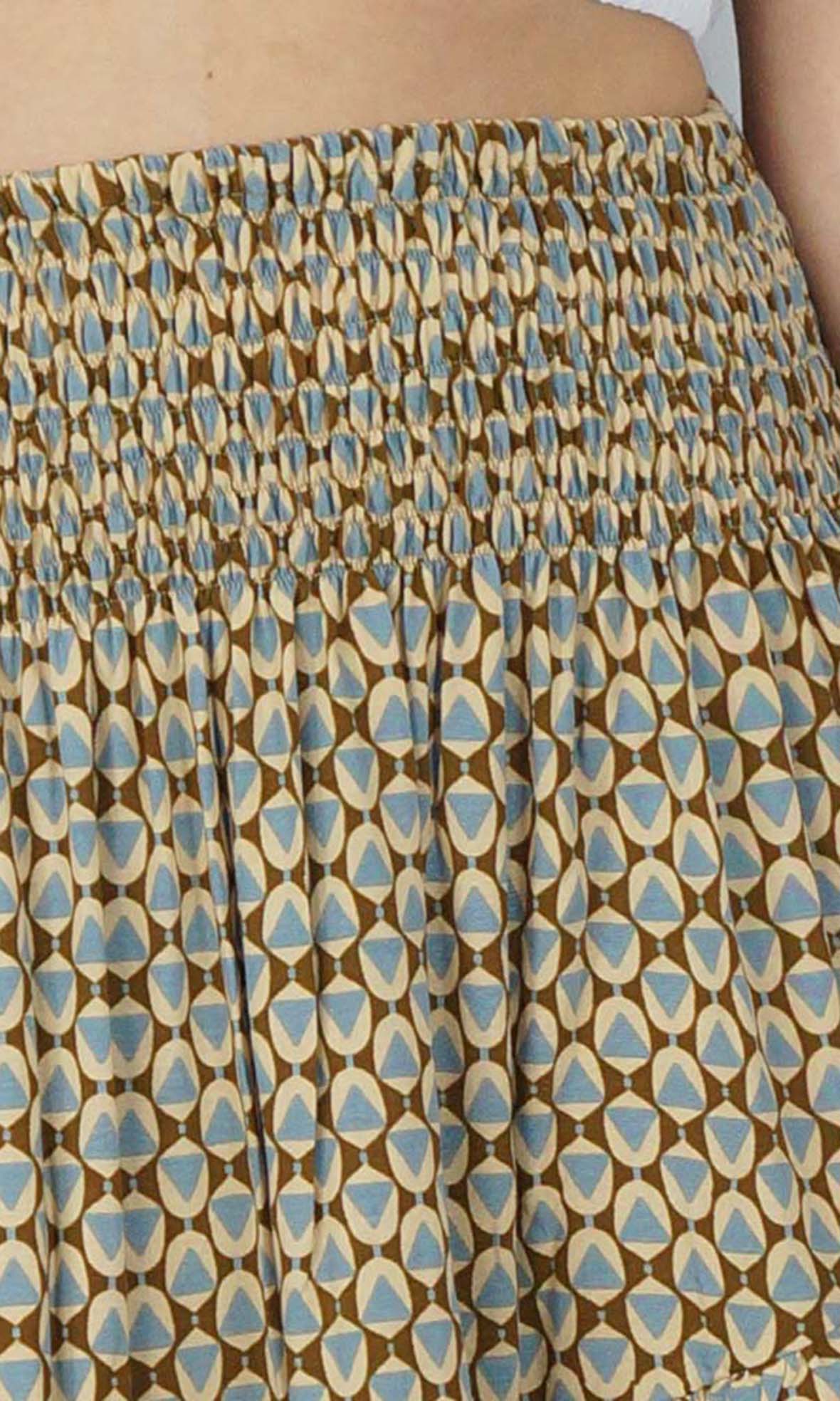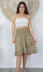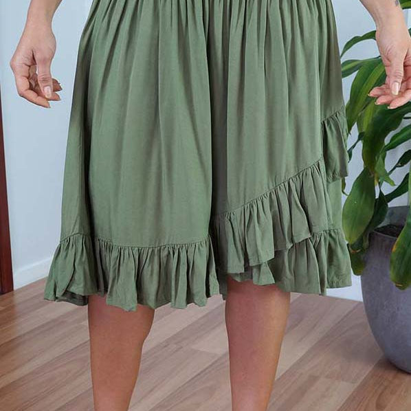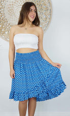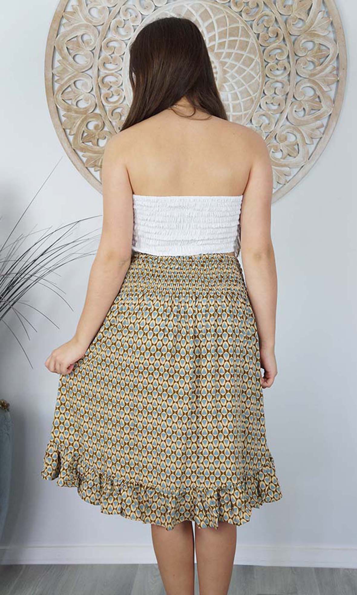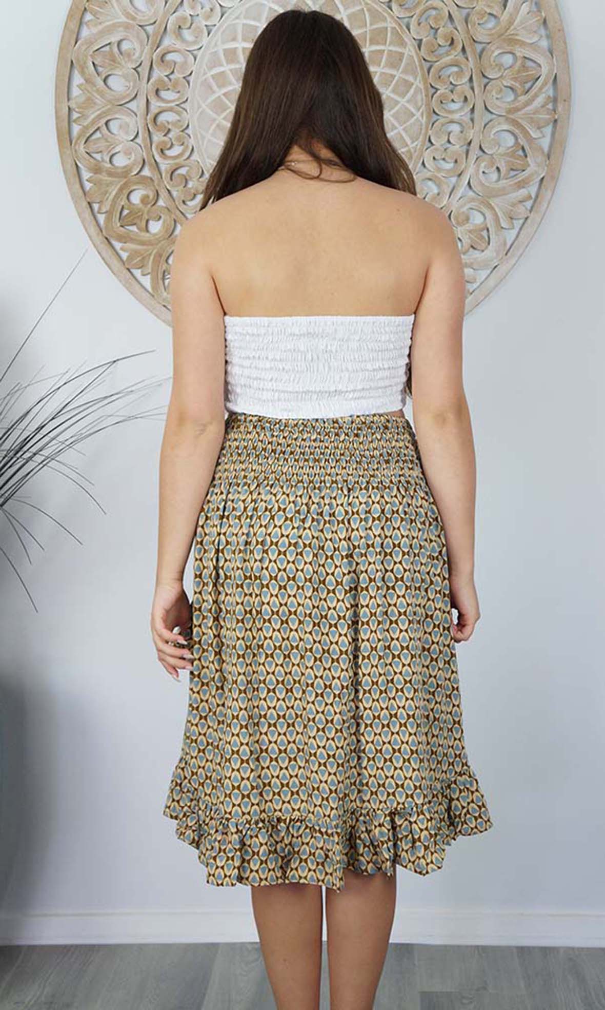 This rayon skirt features an elastic shirring waist, and curved frilled edging. ONE SIZE TO FIT 10-16