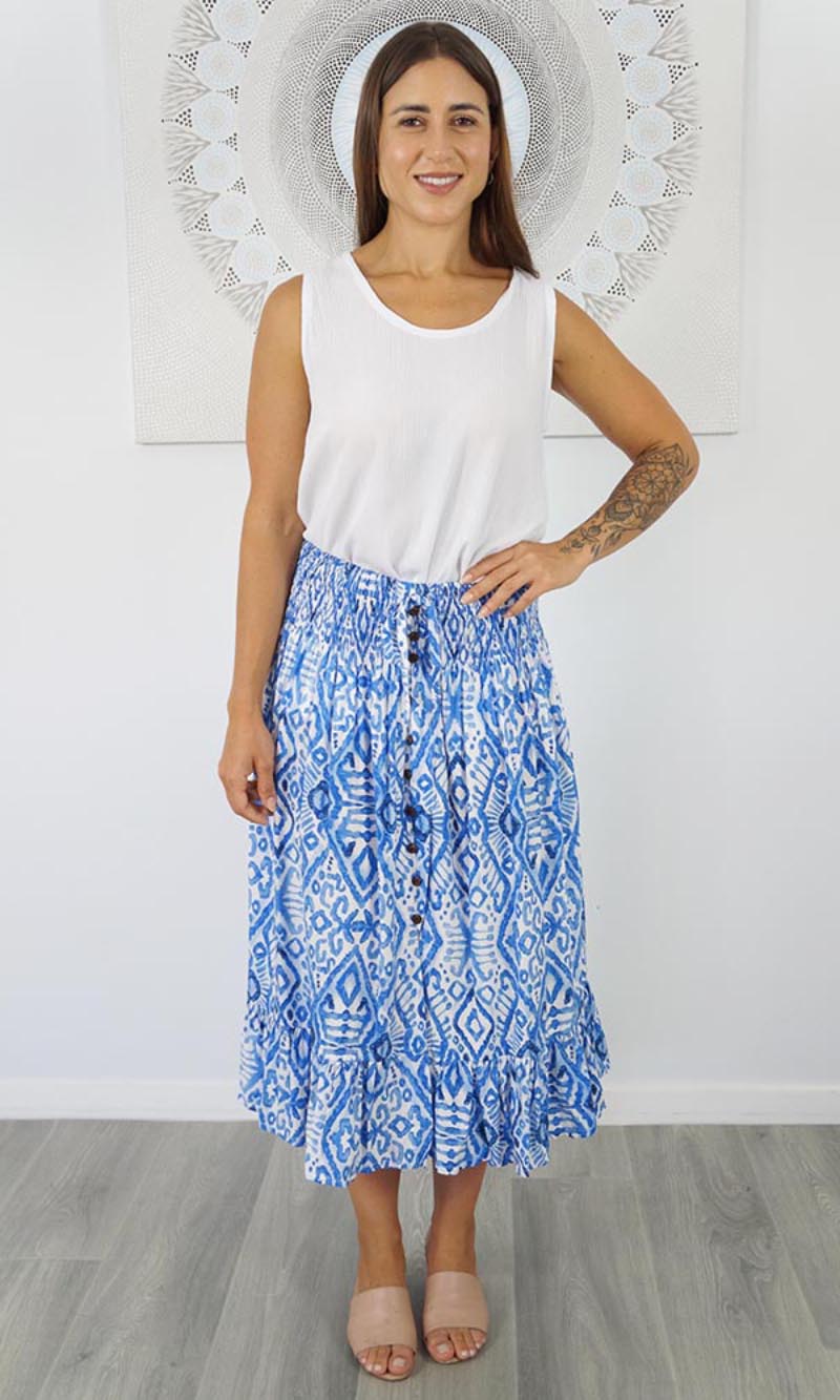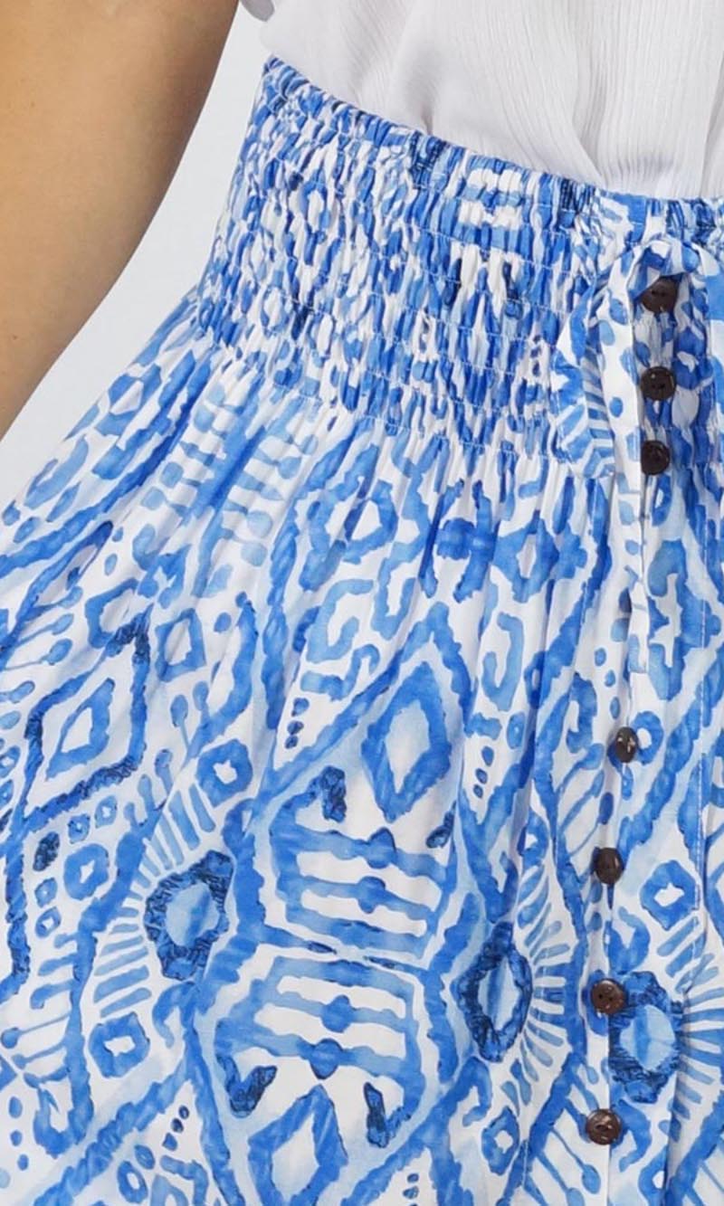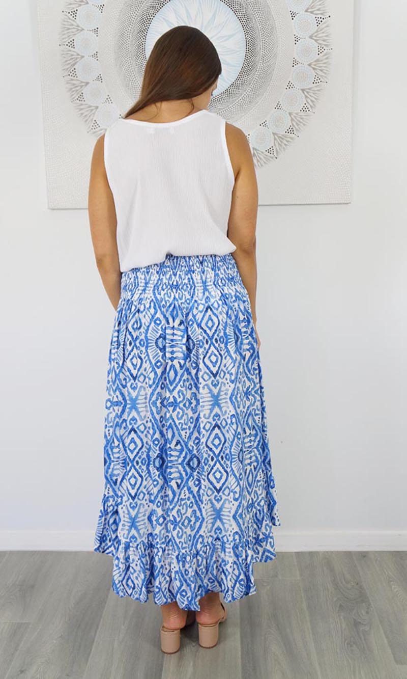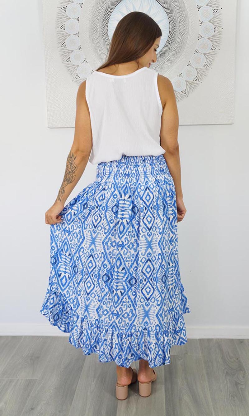 The Tangelo Skirt is fun and flirty. This "hi-low" skirt is the perfect length that can worn at as a casual or dressed up. The elastic smock waist ensures a comfortable fit for a wide range of sizes. Free size fits 8-16.
