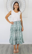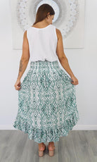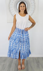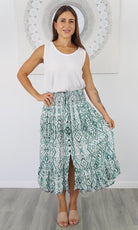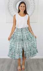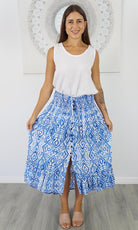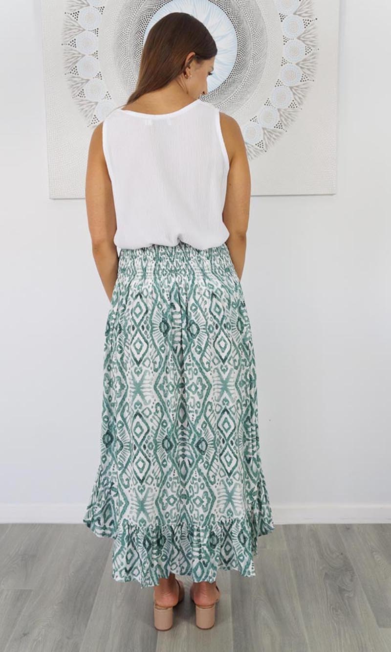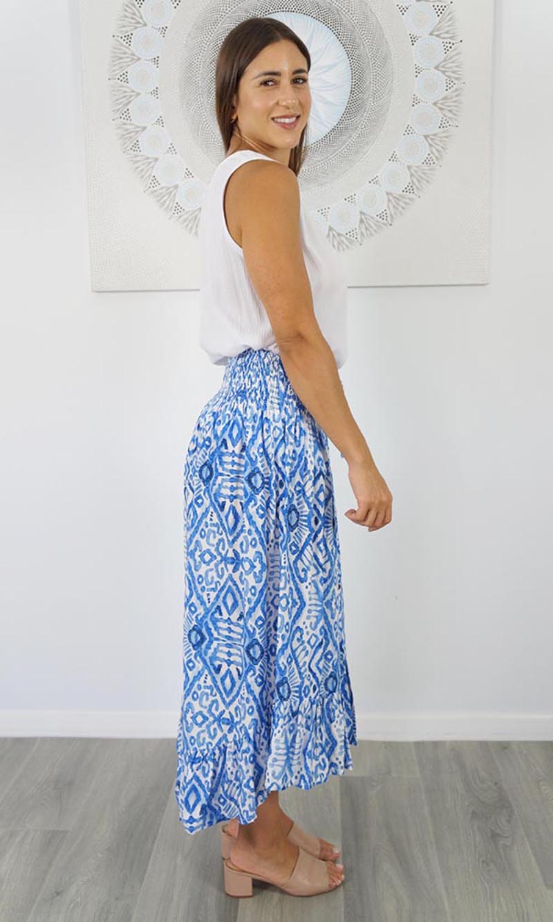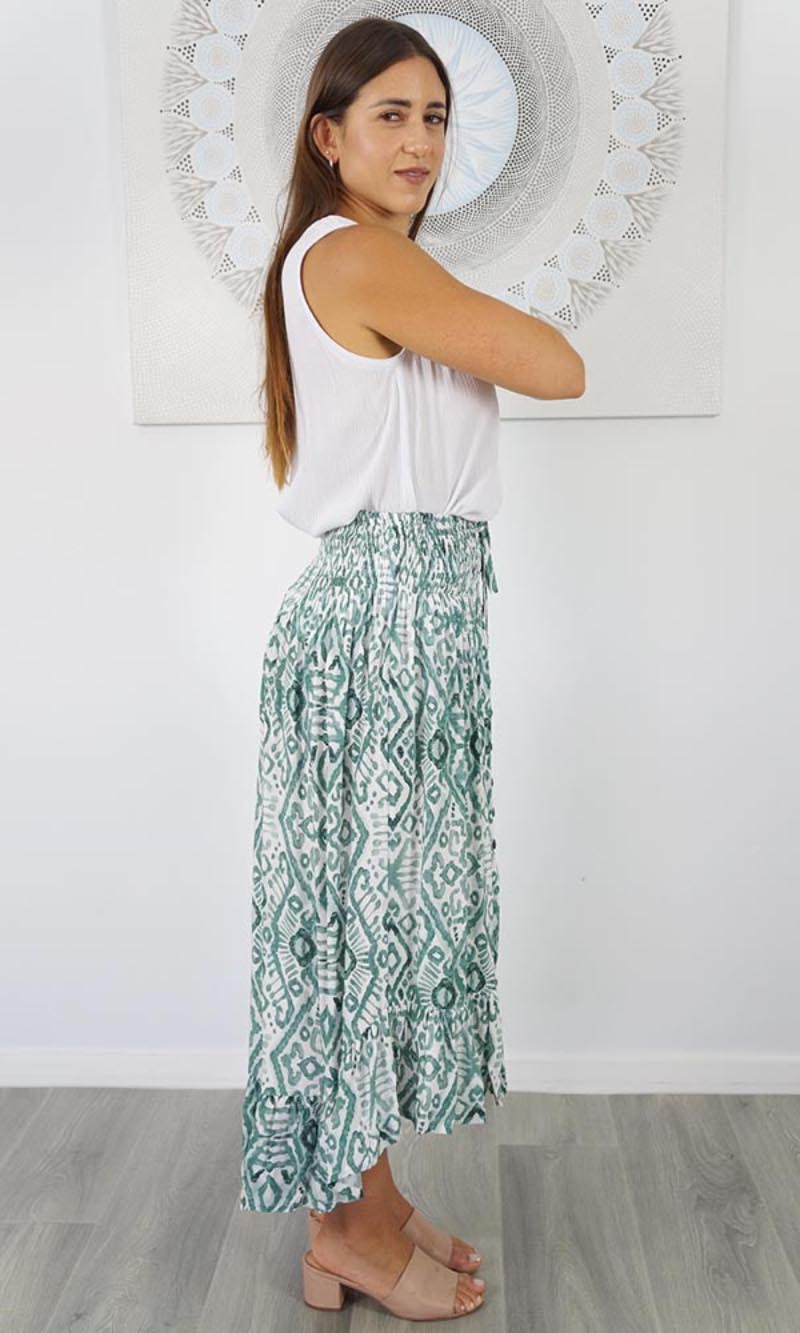 The Tangelo Skirt is fun and flirty. This "hi-low" skirt is the perfect length that can worn at as a casual or dressed up. The elastic smock waist ensures a comfortable fit for a wide range of sizes. Free size fits 8-16.