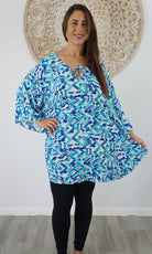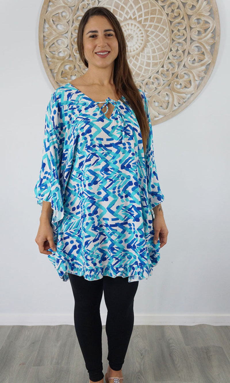 Wear it as a top, a dress, or a tunic over bathers, this product is a complete outfit. A cute tie on the neck line compliments the free flowing figure, while batwing style sleeves give your arms space to move freely.