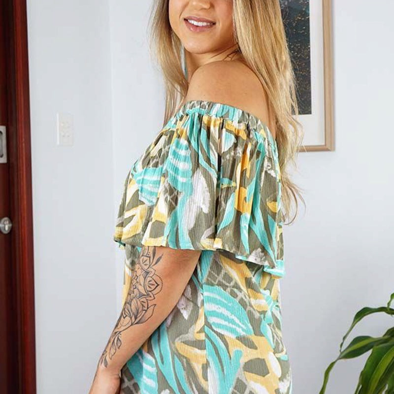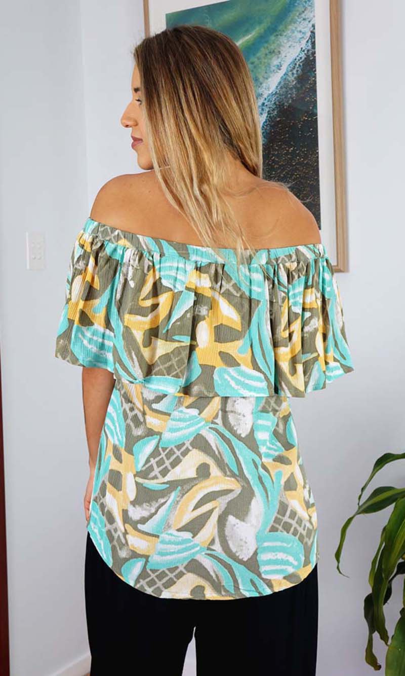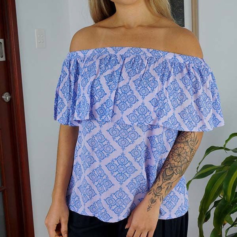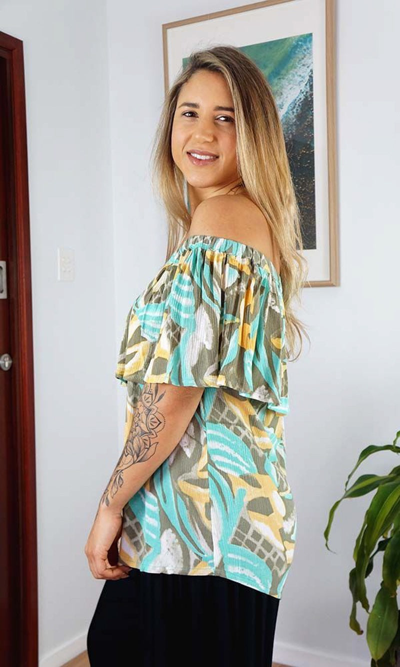 An off the shoulder flowy top with frill detail, made in a cool pre shrunk crinkle rayon. One size to fit 8-16