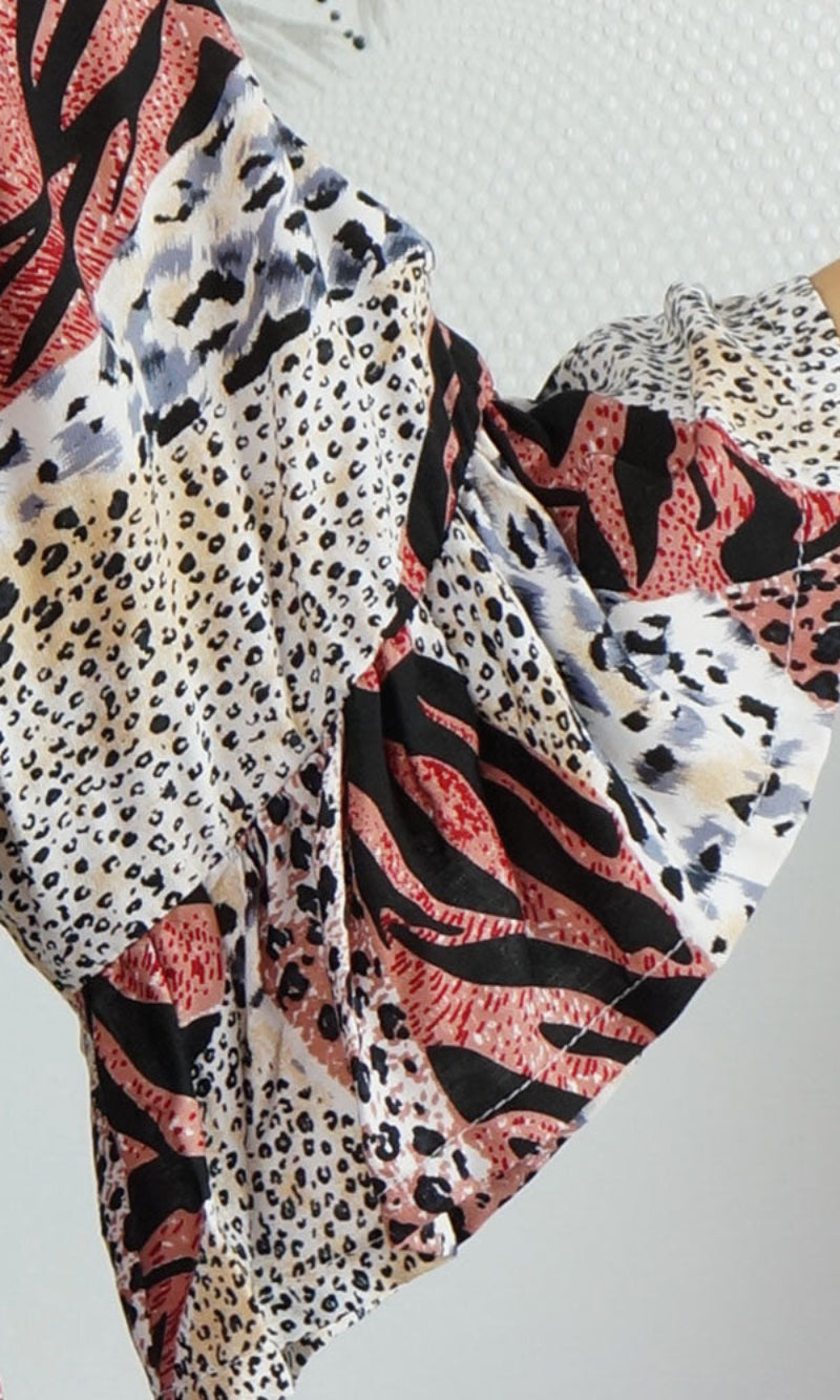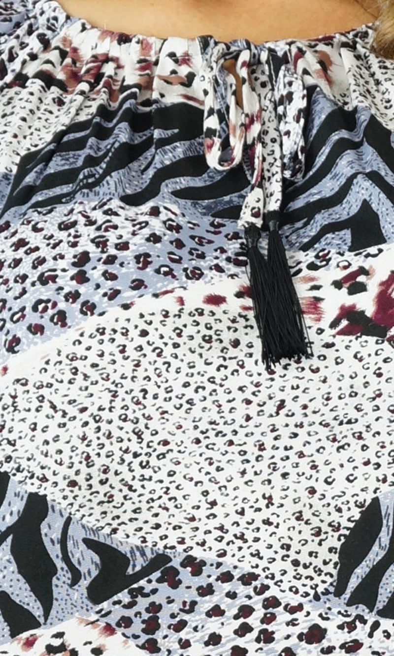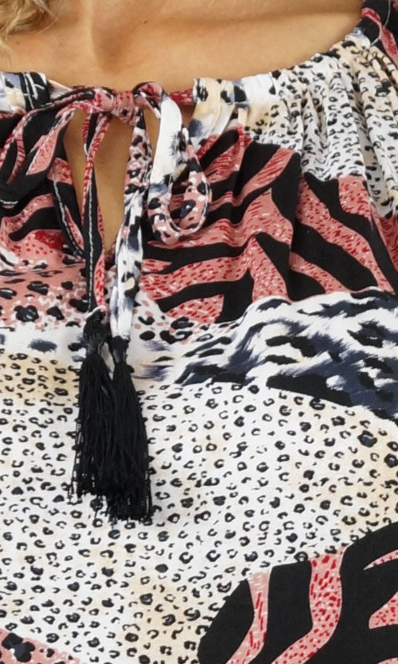 Classic flat rayon style Top in "Dreamland" print with small bell arms and round neckline with tassel trims and tie. Available in 2 sizes.