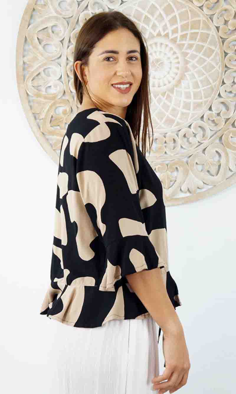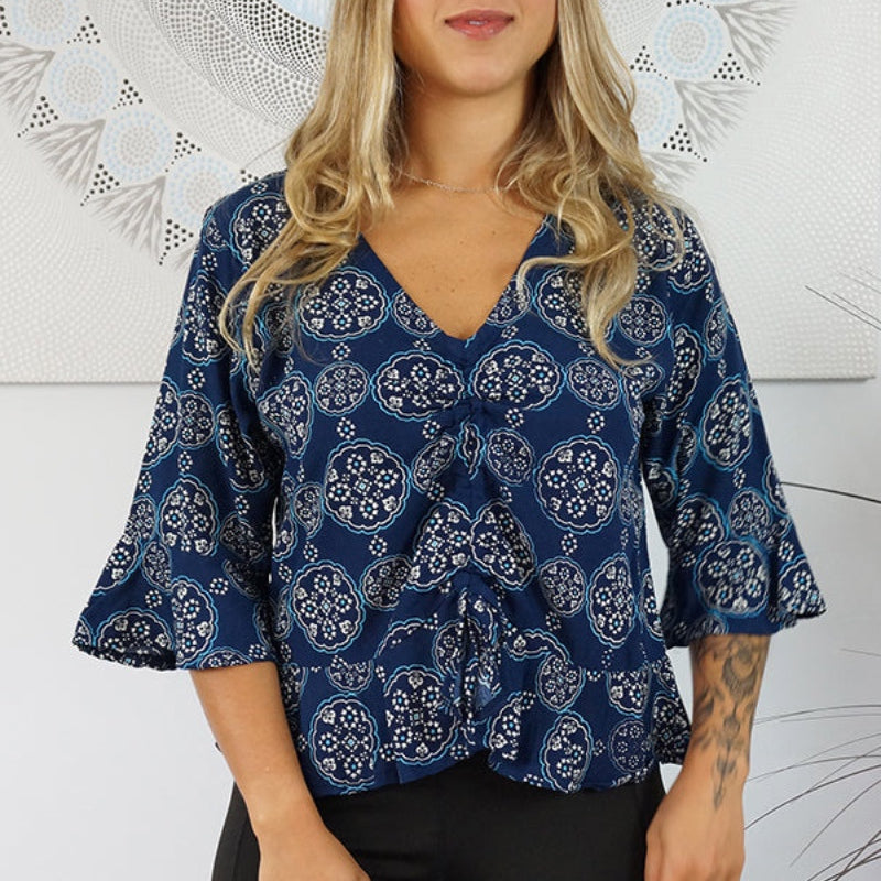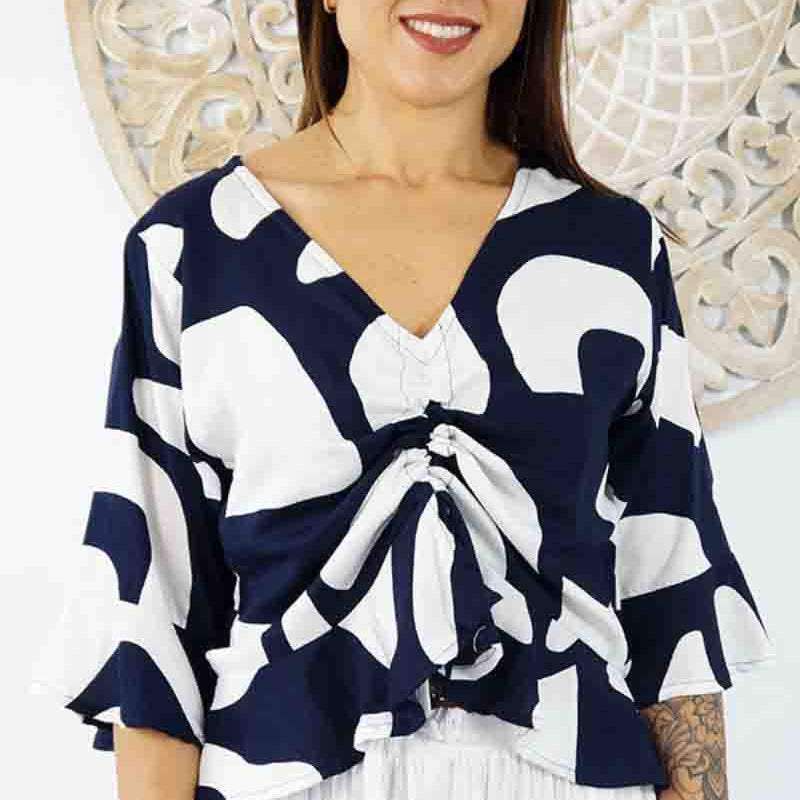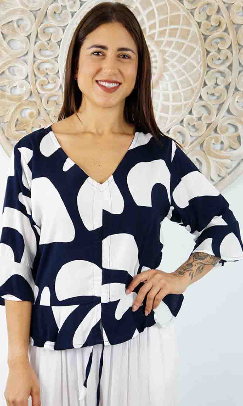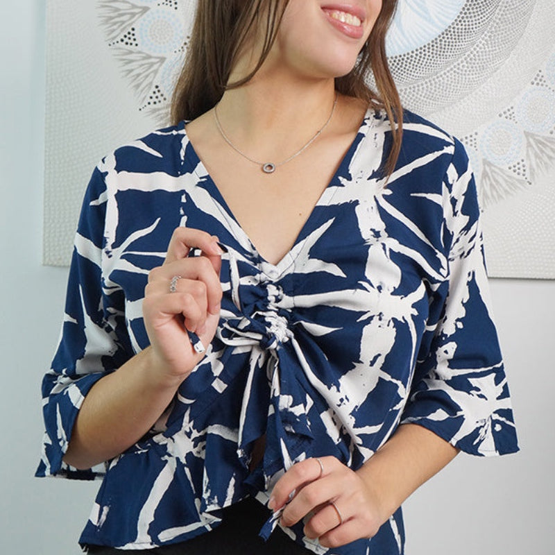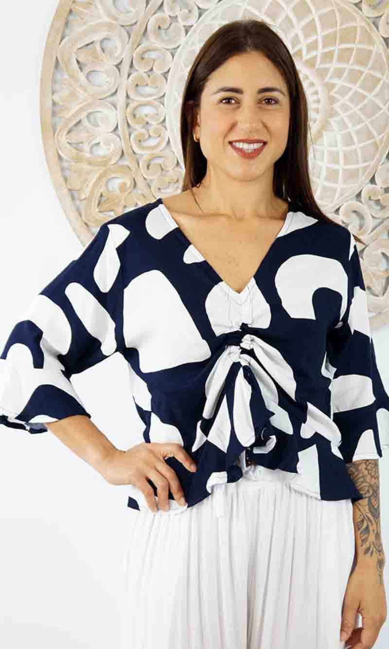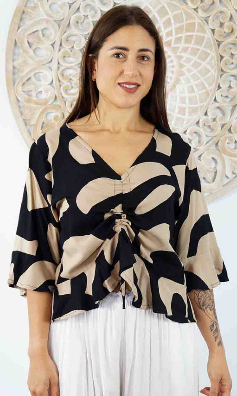 Mid sleeve Top with ruched front ties to wear up or down to suit your mood. Available in 3 sizes.