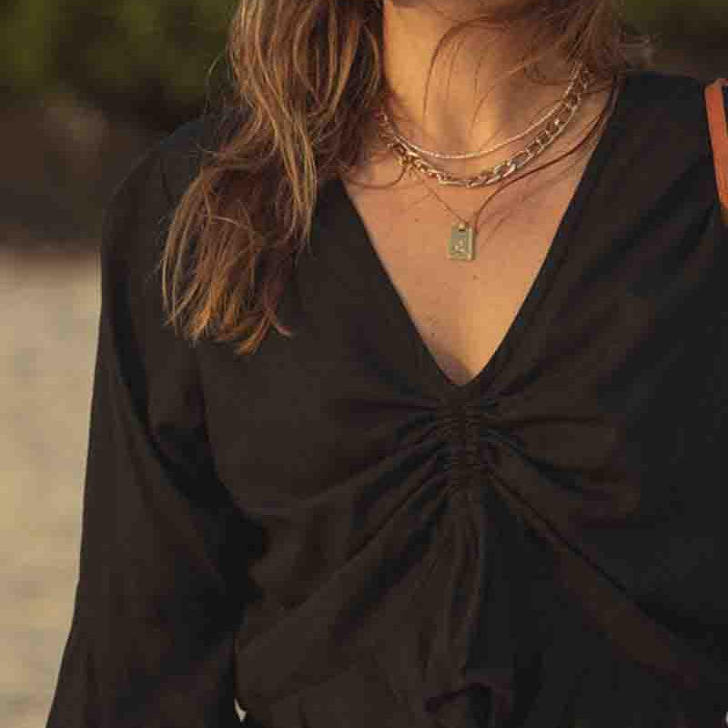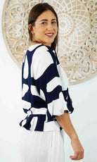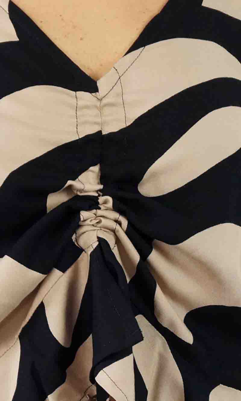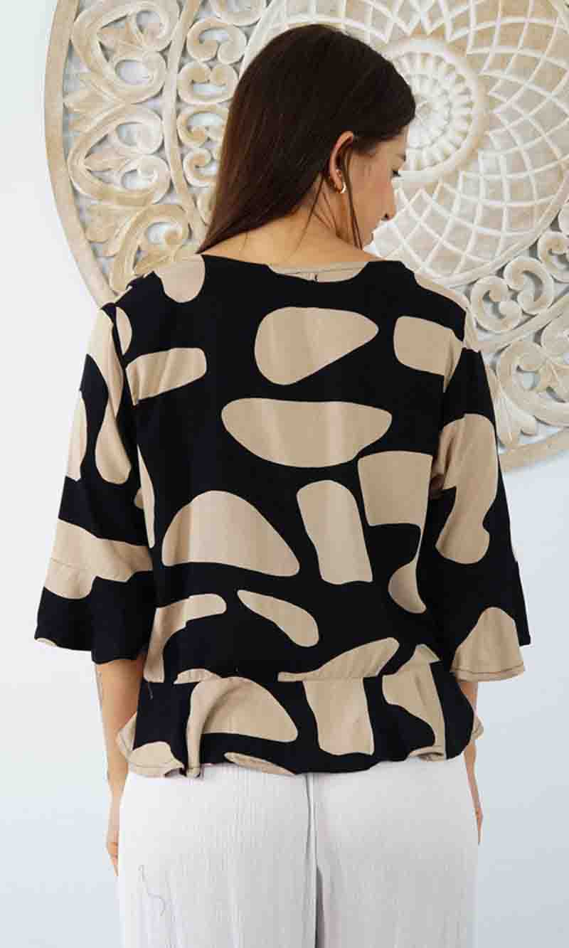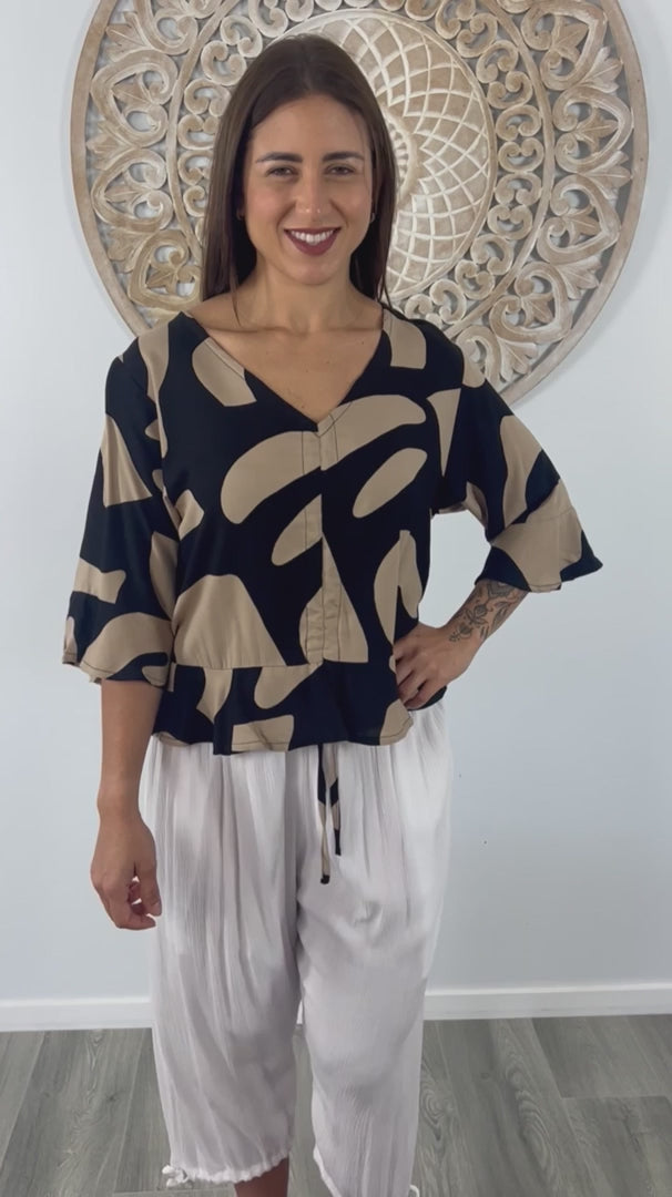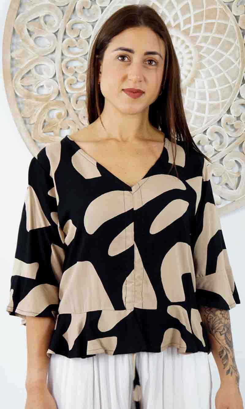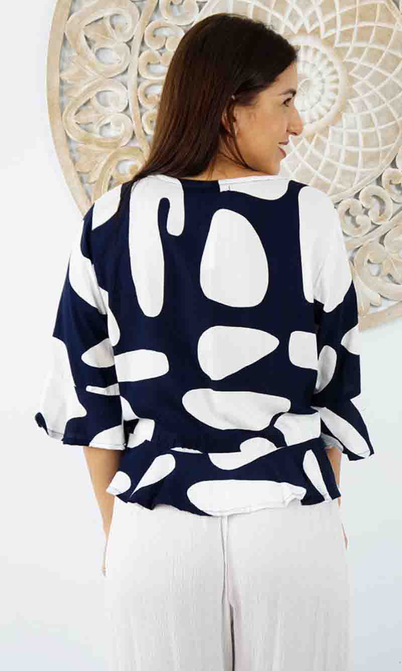 Mid sleeve Top with ruched front ties to wear up or down to suit your mood. Available in 3 sizes.