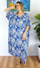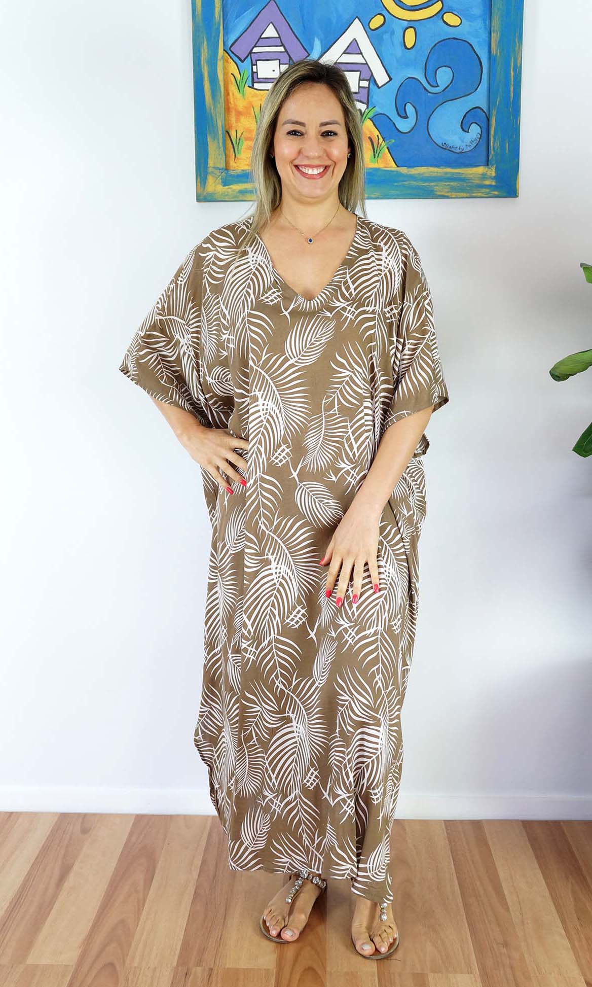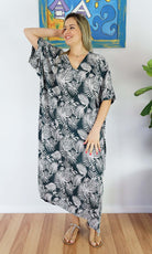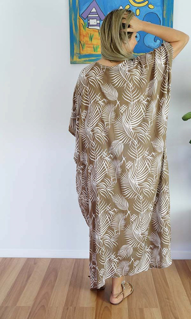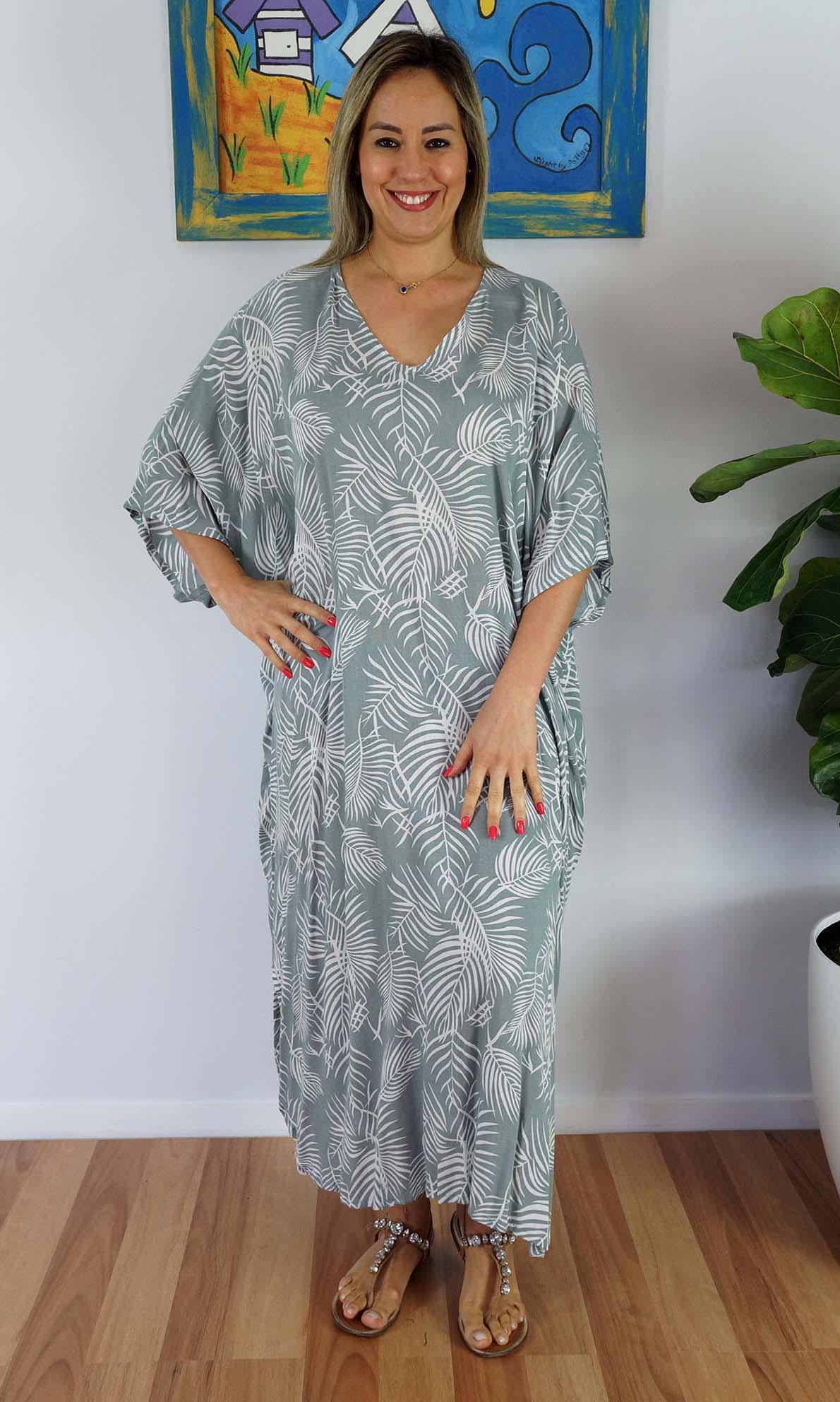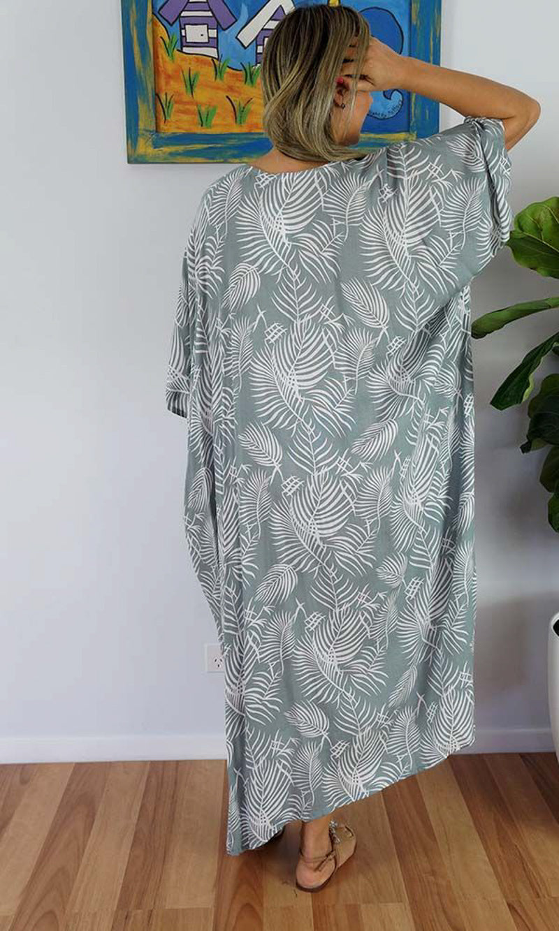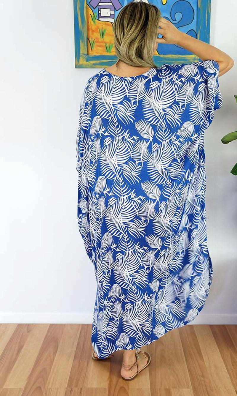 This light rayon kaftan makes a wonderful gift. One size fits size 10 to 26 comfortably. Has side splits at the bottom. Finished length is approximently 125cms.