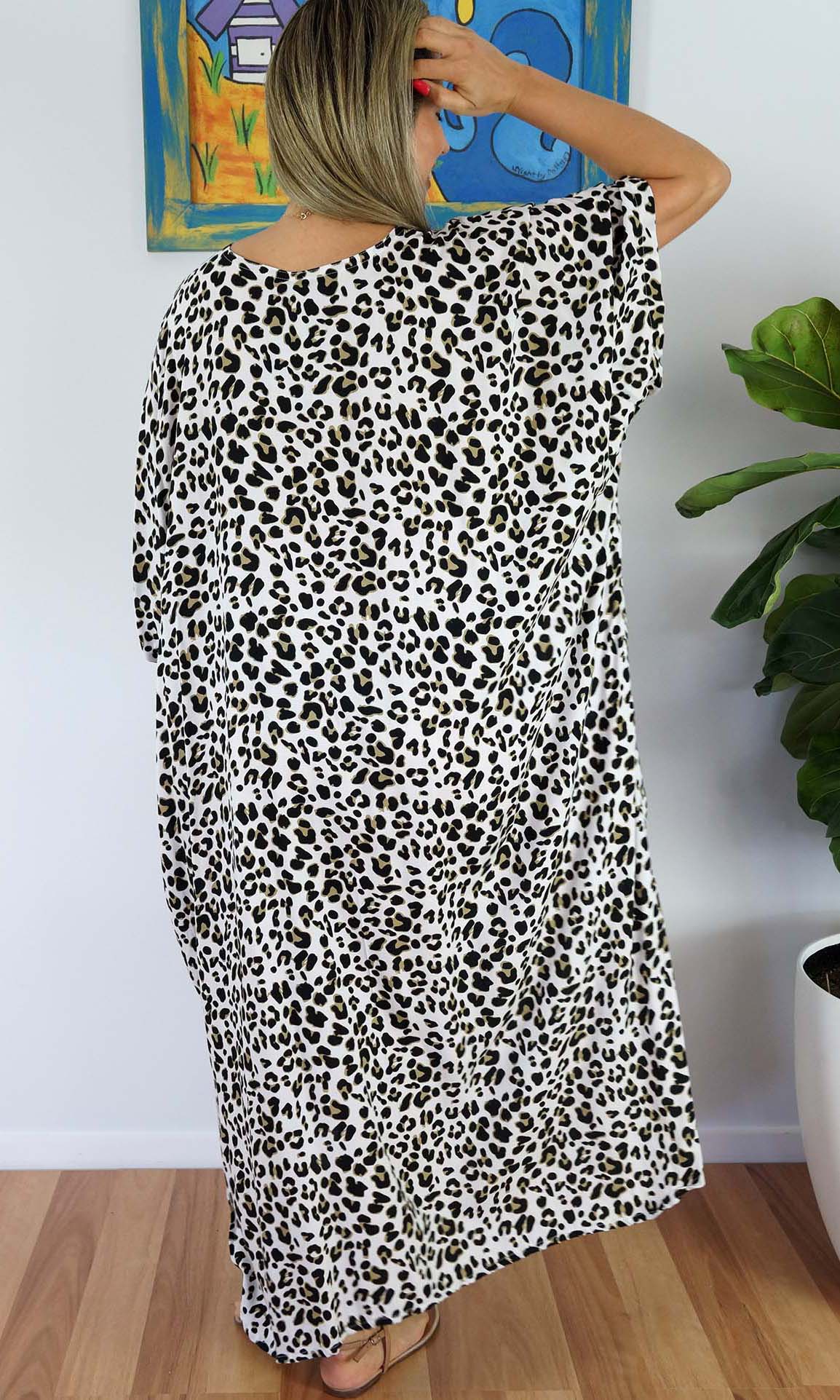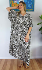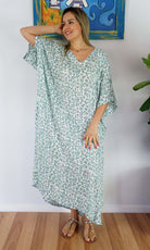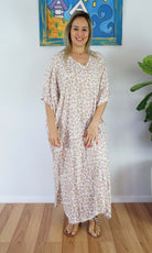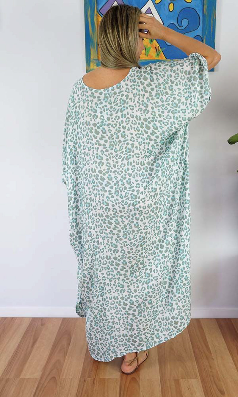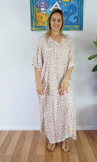 This light rayon kaftan makes a wonderful gift. One size fits size 10 to 26 comfortably. Has side splits at the bottom. Finished length is approximently 125cms.