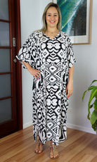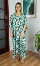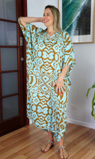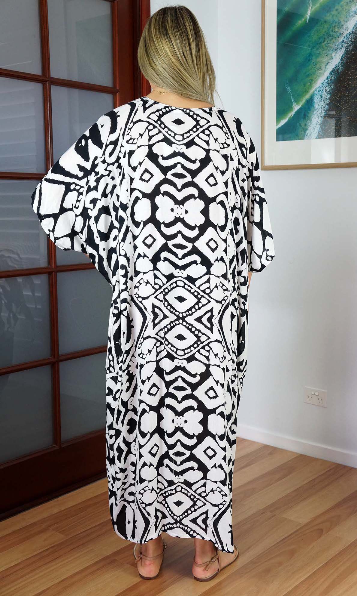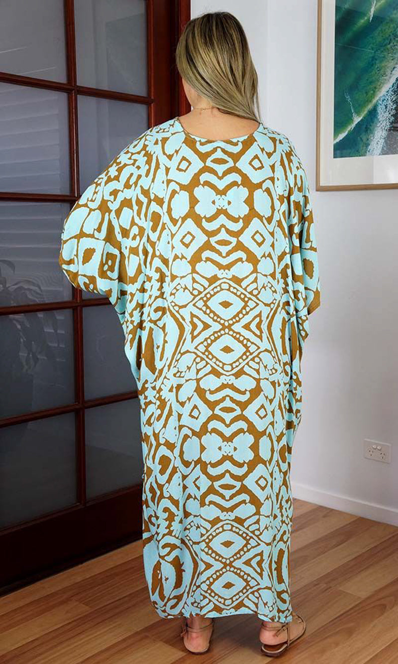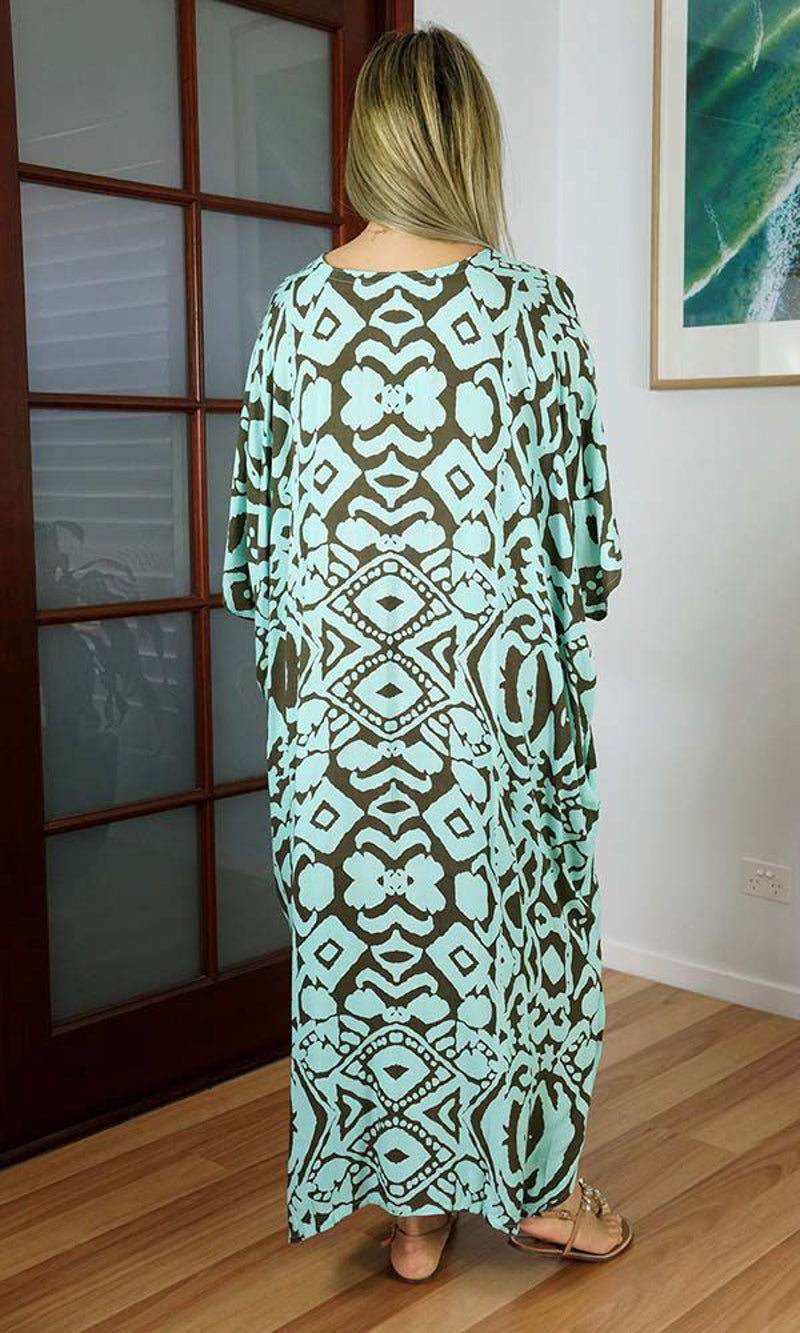 This light rayon kaftan makes a wonderful gift. One size fits size 10 to 26 comfortably. Has side splits at the bottom. Finished length is approximently 125cms.