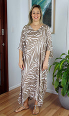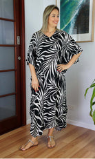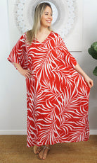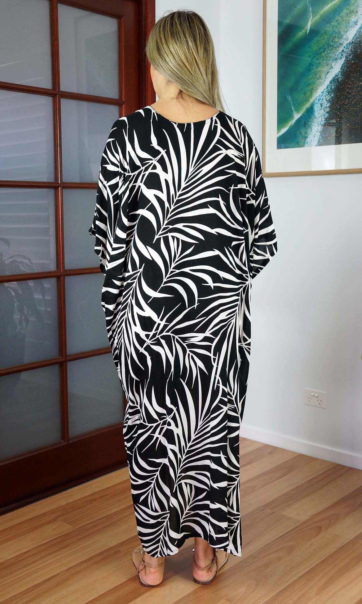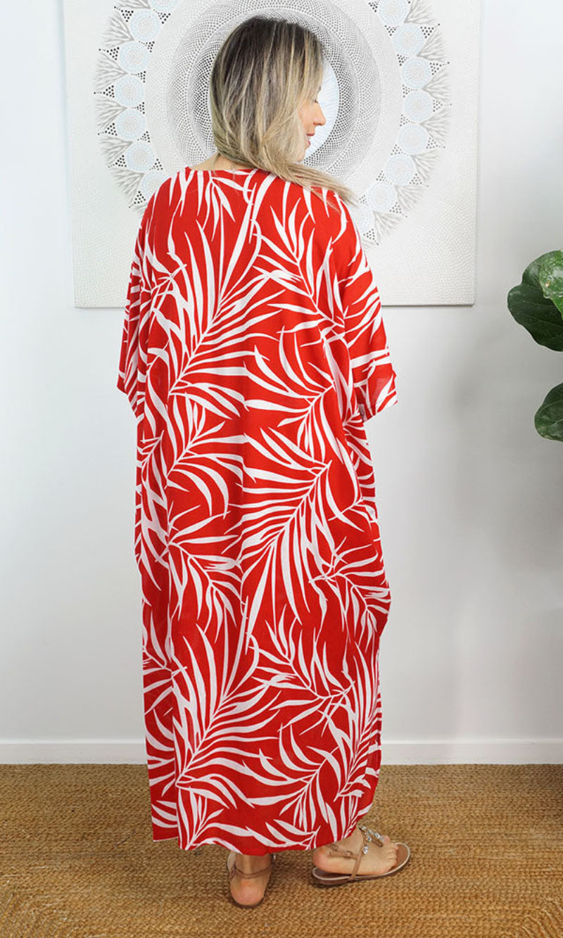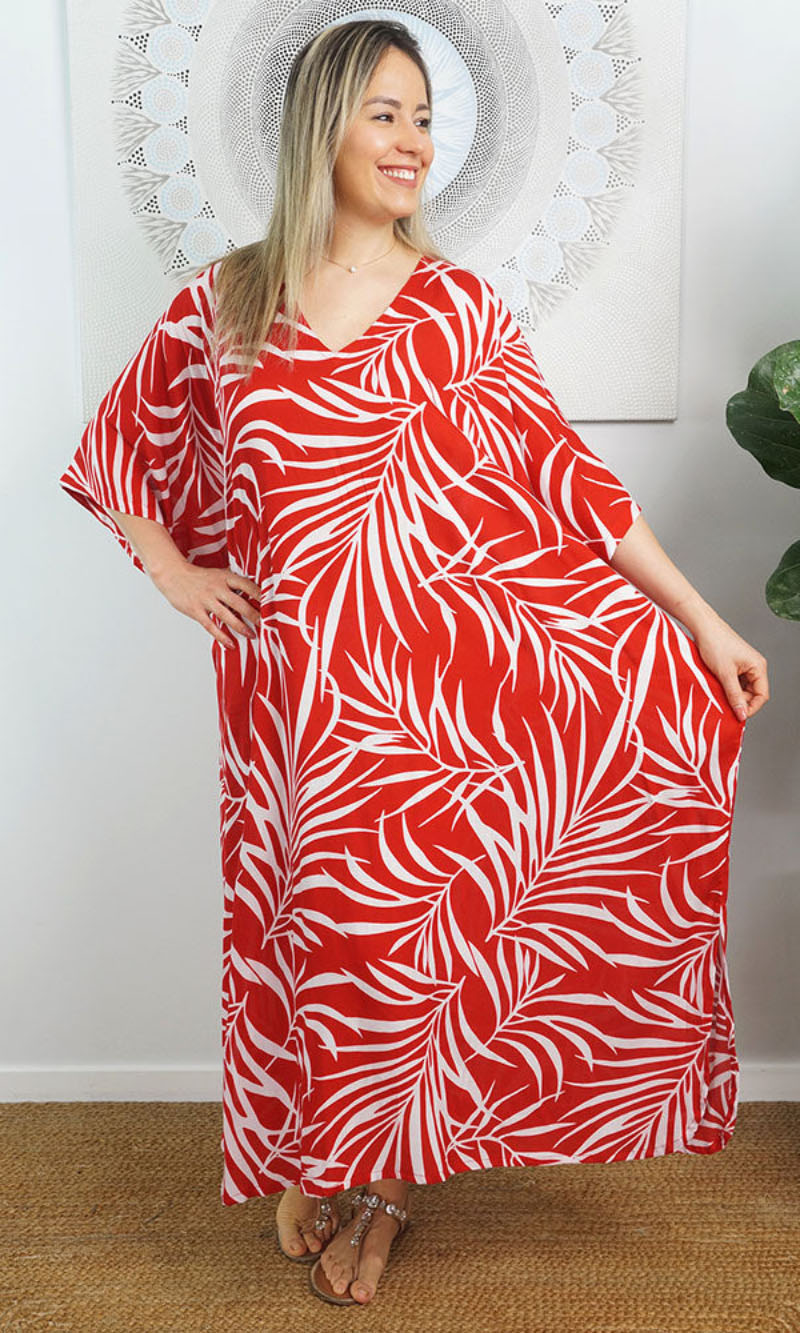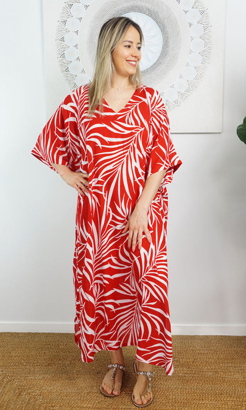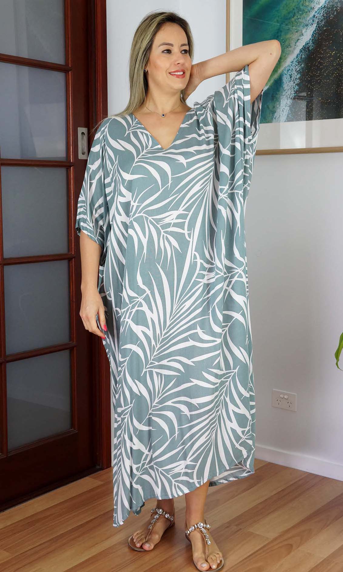 This light rayon kaftan makes a wonderful gift. One size fits size 10 to 26 comfortably. Has side splits at the bottom. Finished length is approximently 125cms.