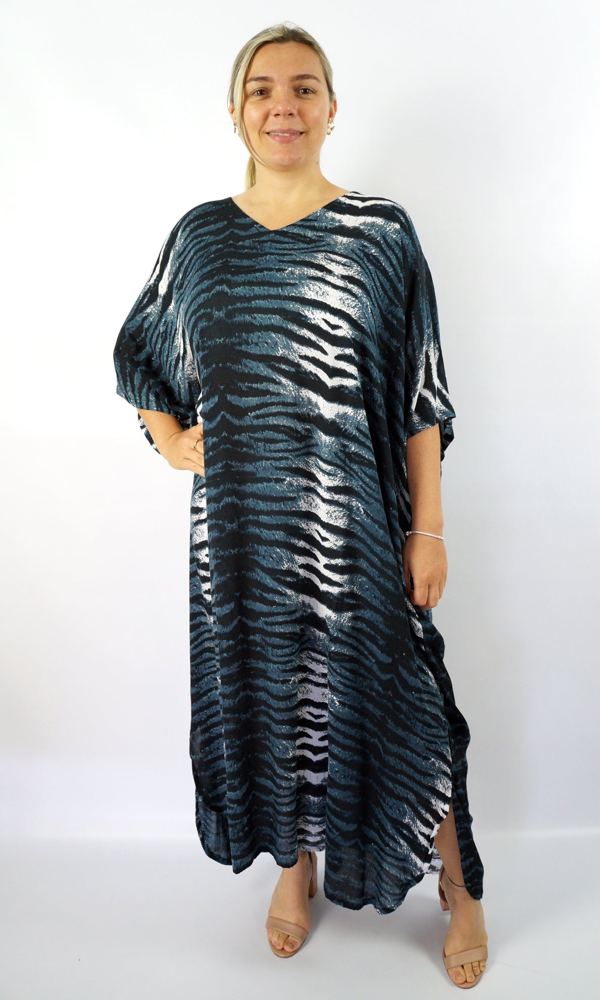 This light rayon kaftan makes a wonderful gift. One size fits size 10 to 26 comfortably. Has side splits at the bottom. Finished length is approximently 125cms.