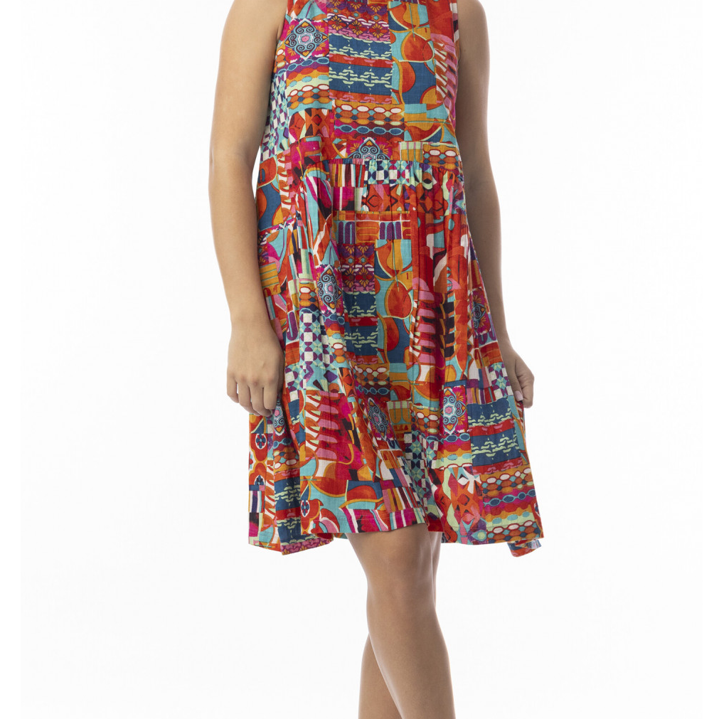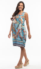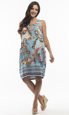 The Orientique Bubble Dress is a linen blend sleeveless dress with a scoop neck. It has rounded panels which drape at the sides, and pockets!