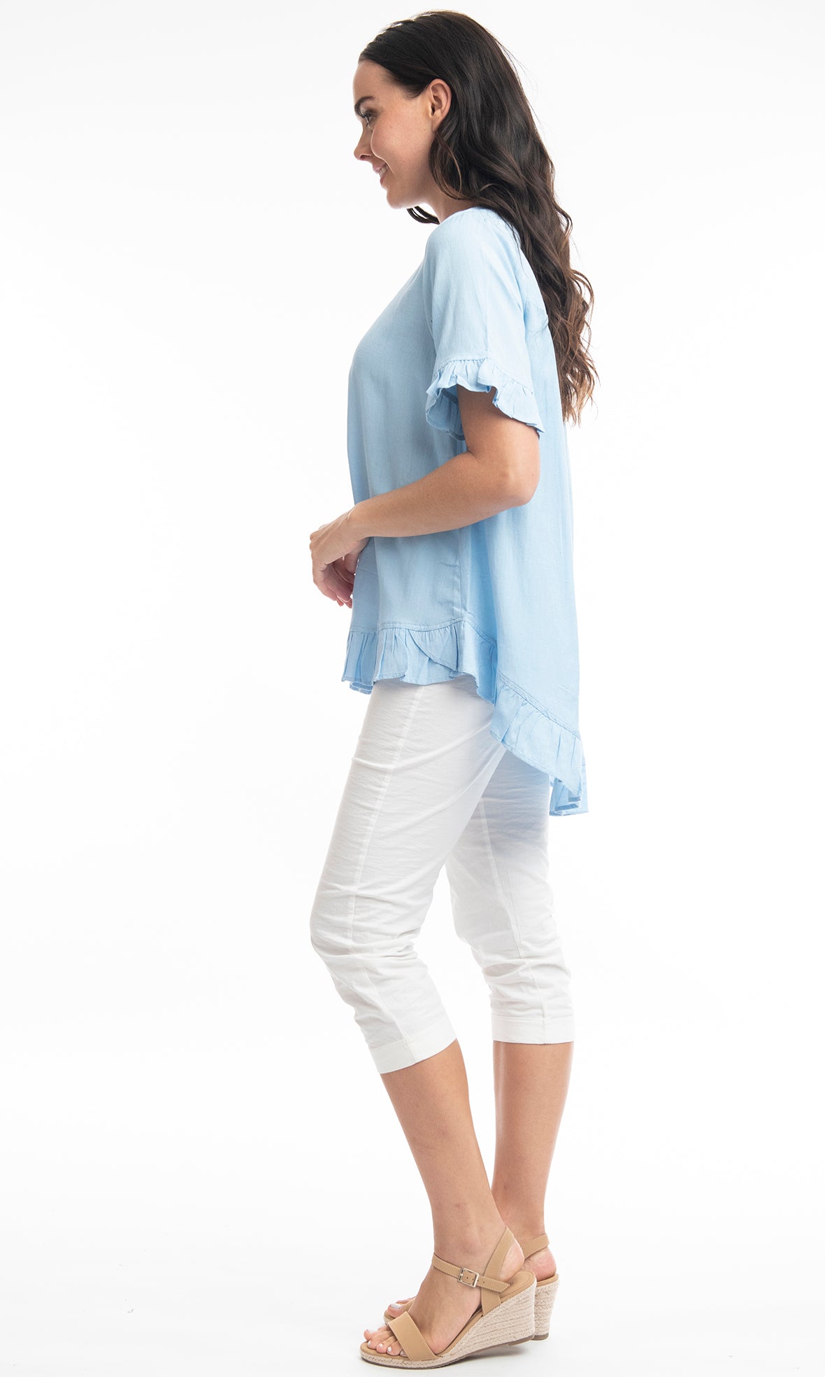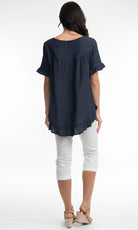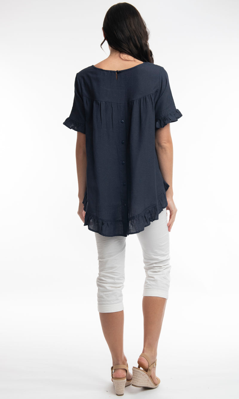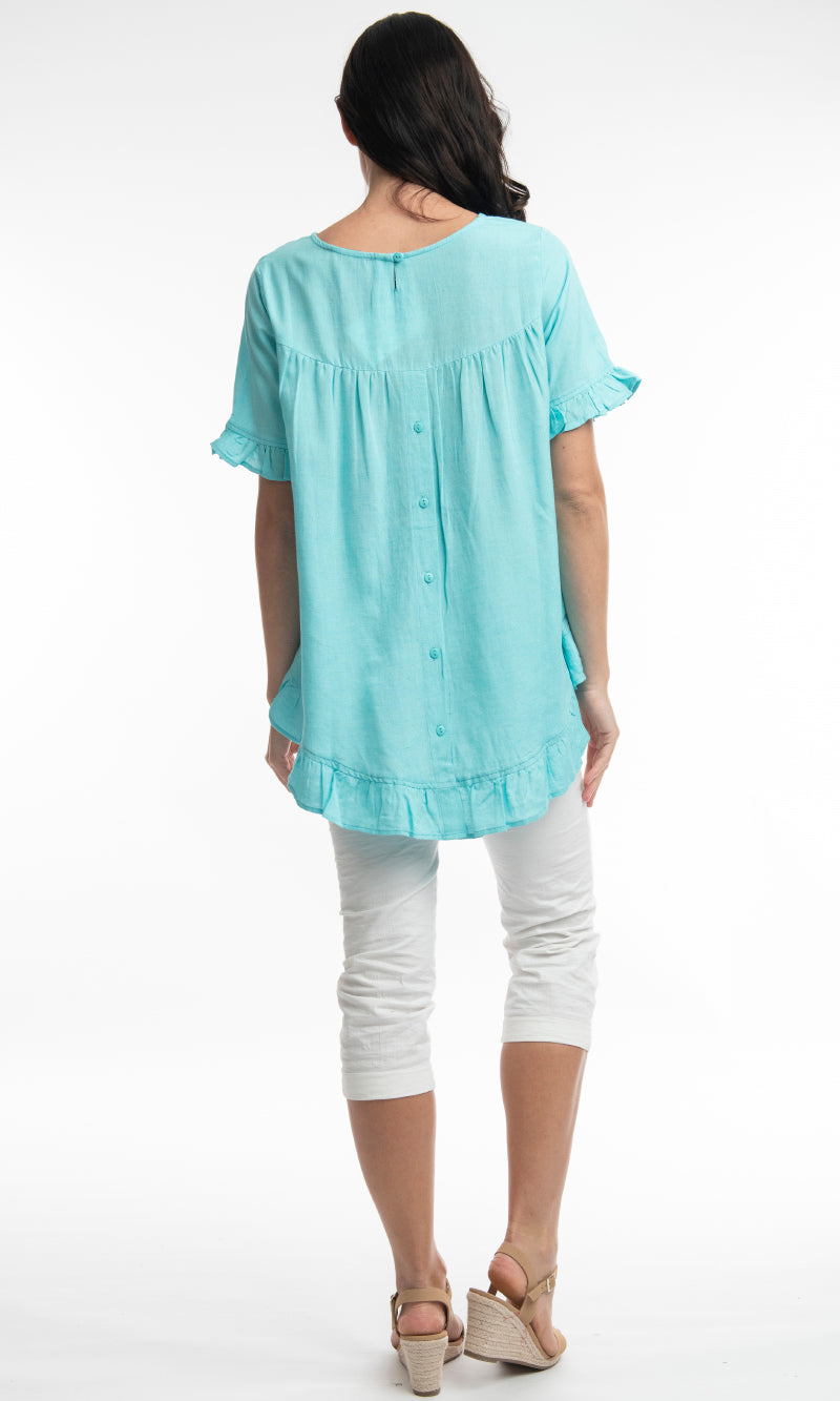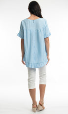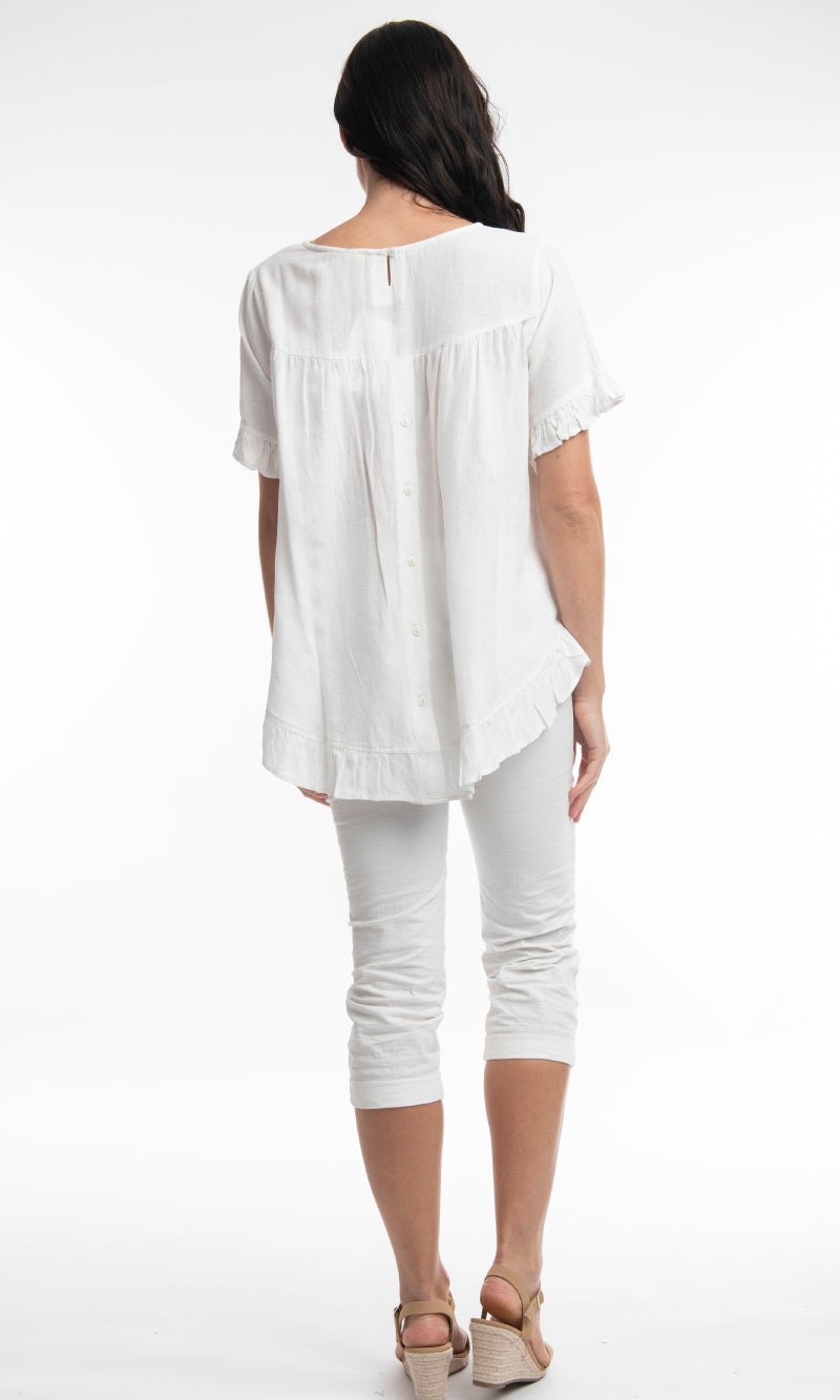 The Orientique frill sleeve top is a round neck top with a scalloped hemline and elbow length sleeve. It has placket and buttons bleow the yoke down the back.