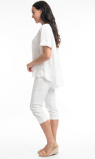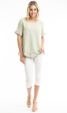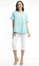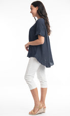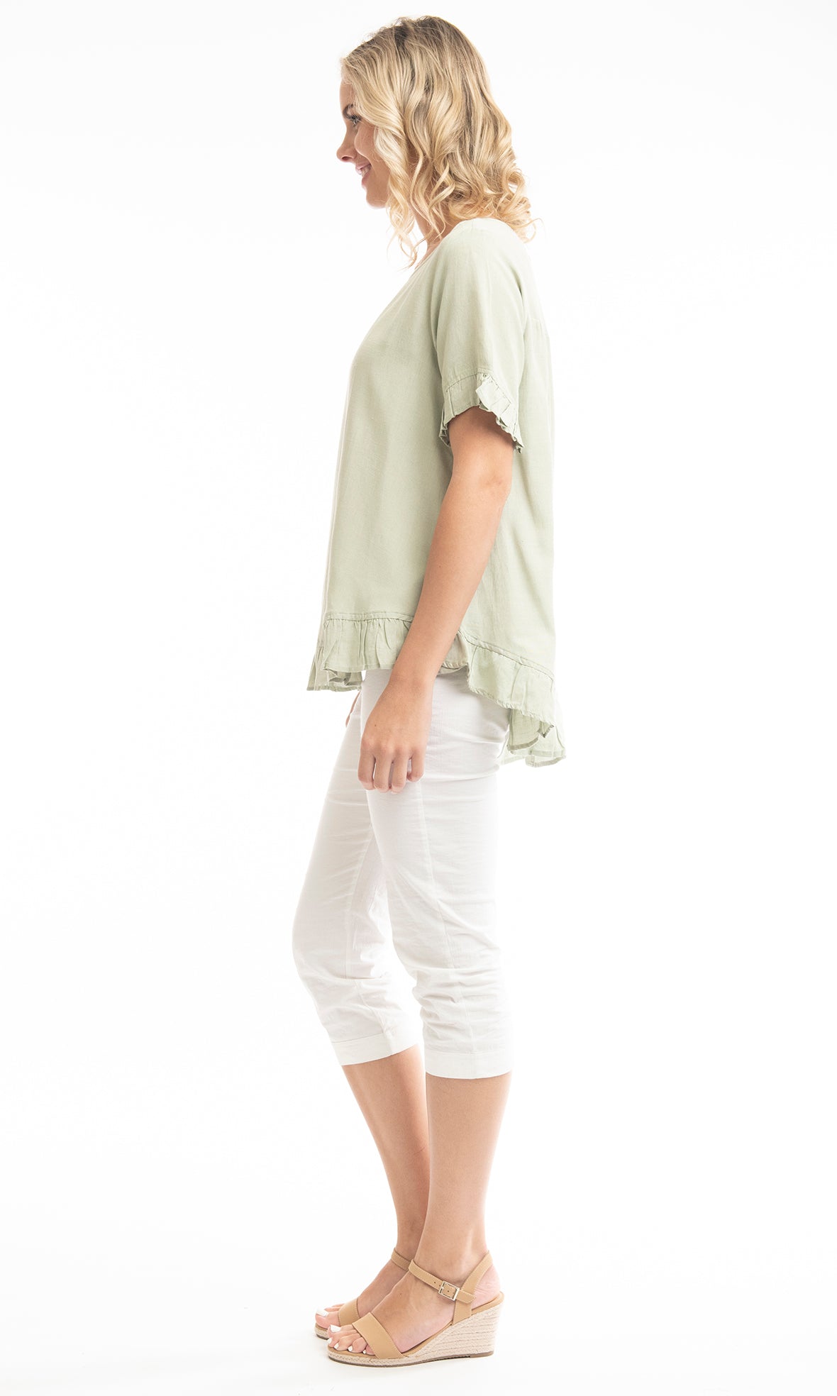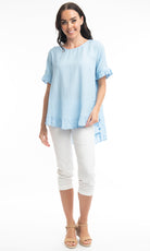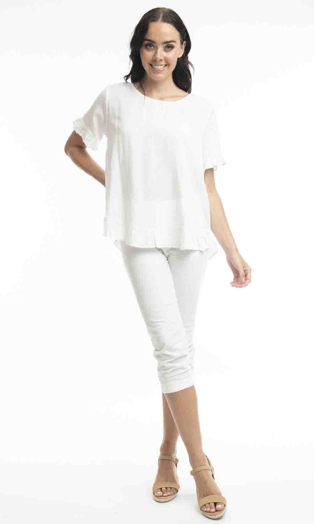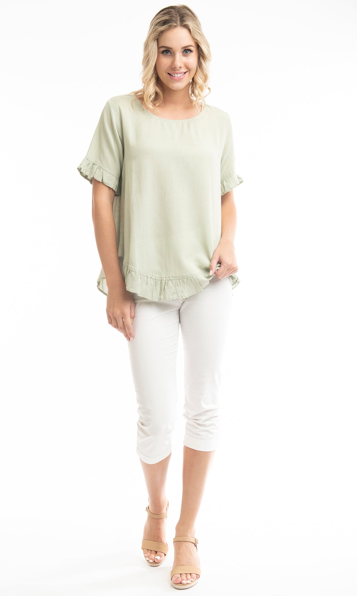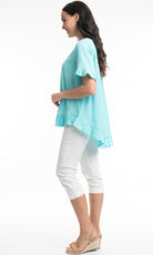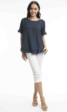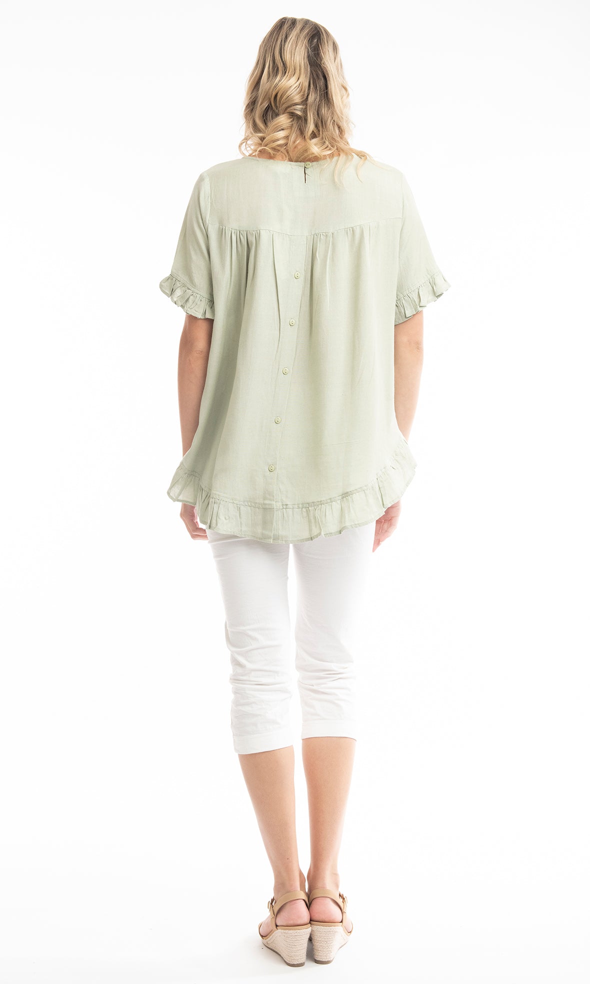 The Orientique frill sleeve top is a round neck top with a scalloped hemline and elbow length sleeve. It has placket and buttons bleow the yoke down the back.
