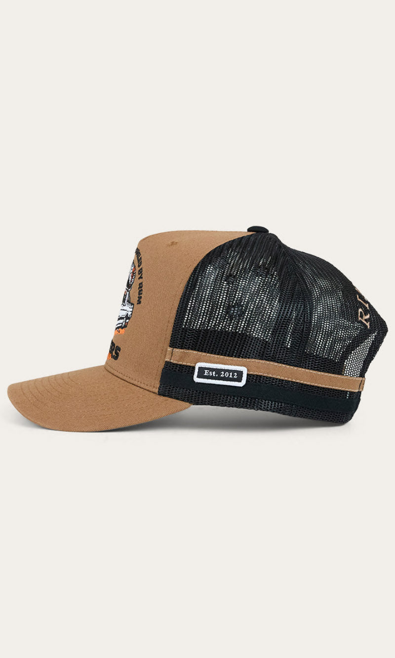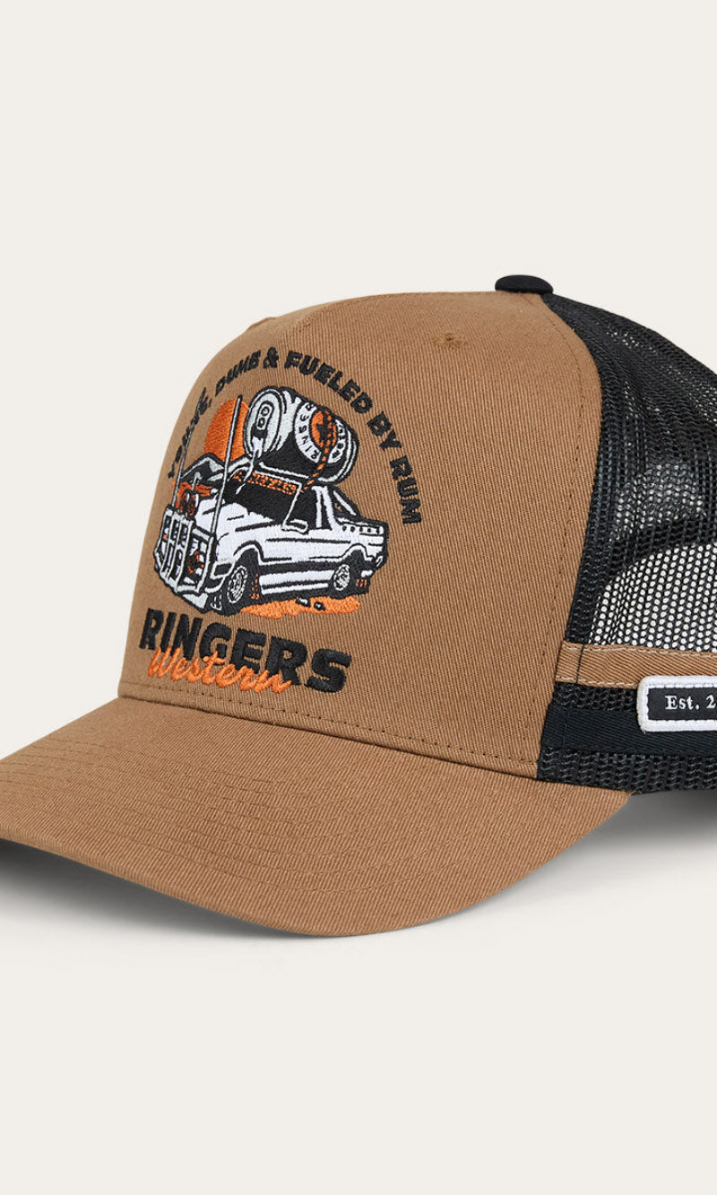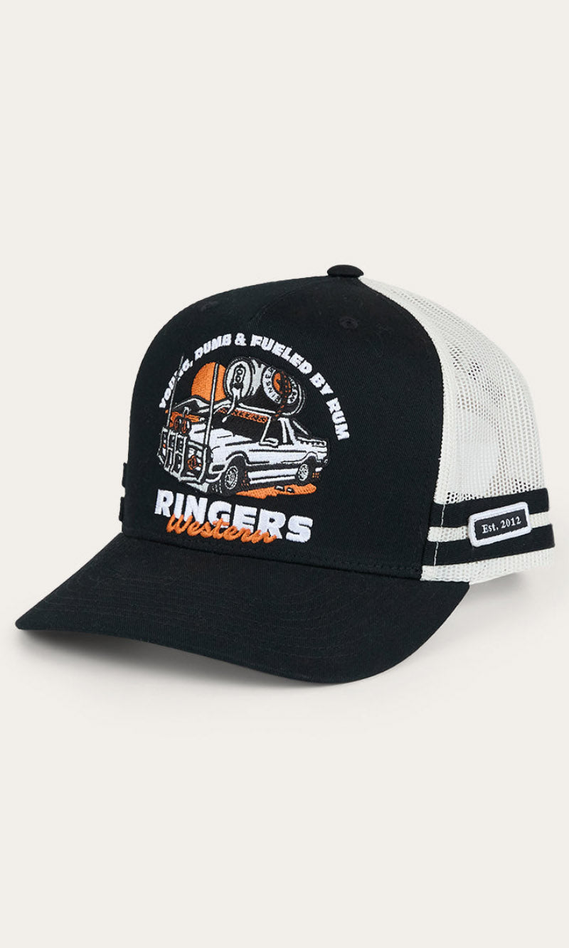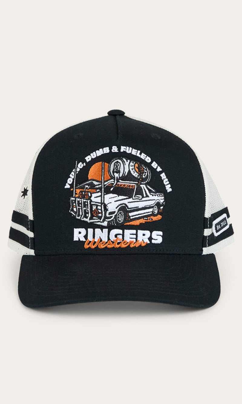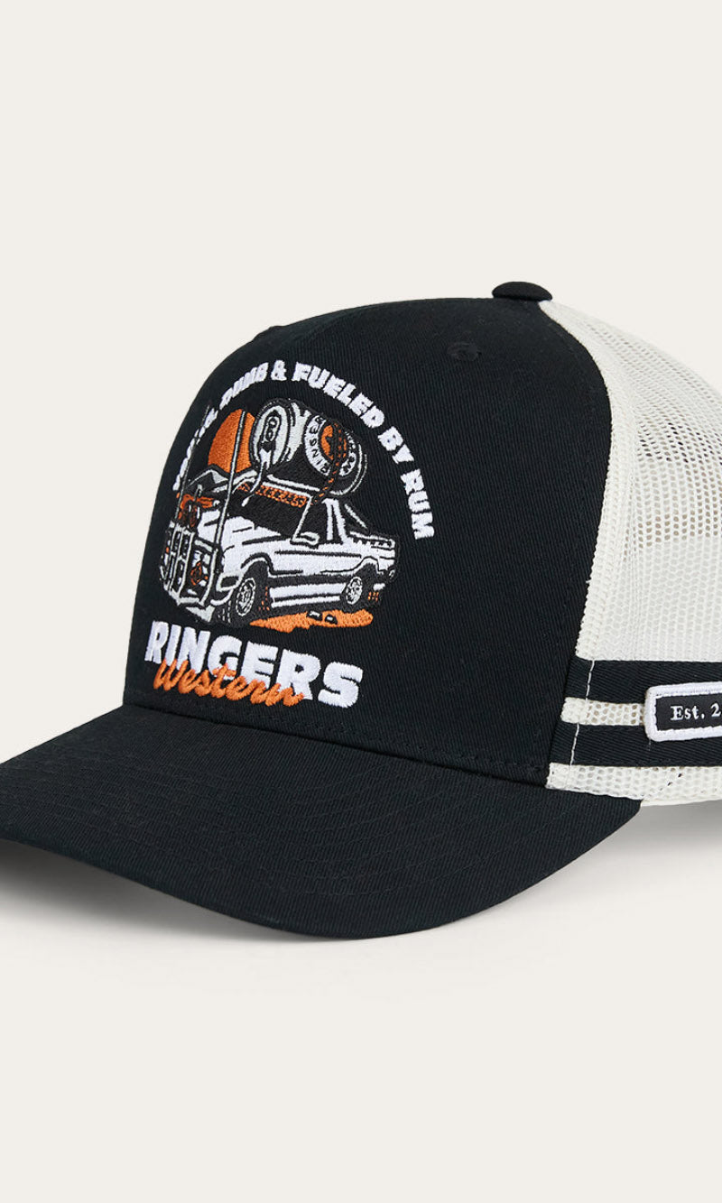 Our Ringers Western country trucker caps capture the heart and soul of everything we stand for. The Rum Runner Trucker Cap is a deep fit design and features a mesh back for optimal ventilation, perfect for hot summer days. A Rum Runner woven badge is complemented by twill side stripes whilst an adjustable snapback provides a customisable and comfortable fit.