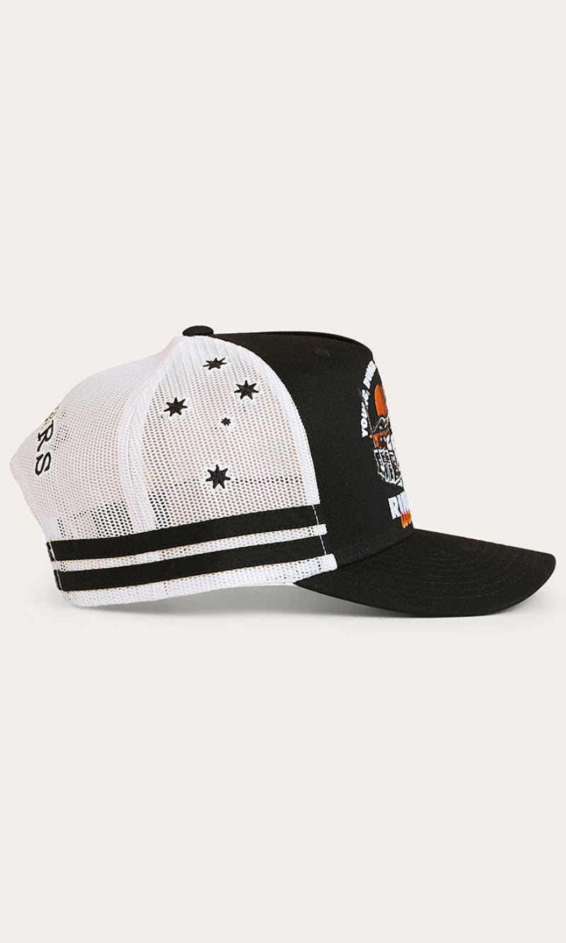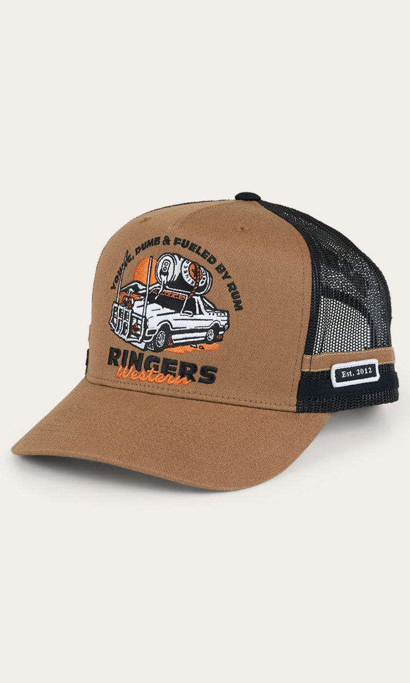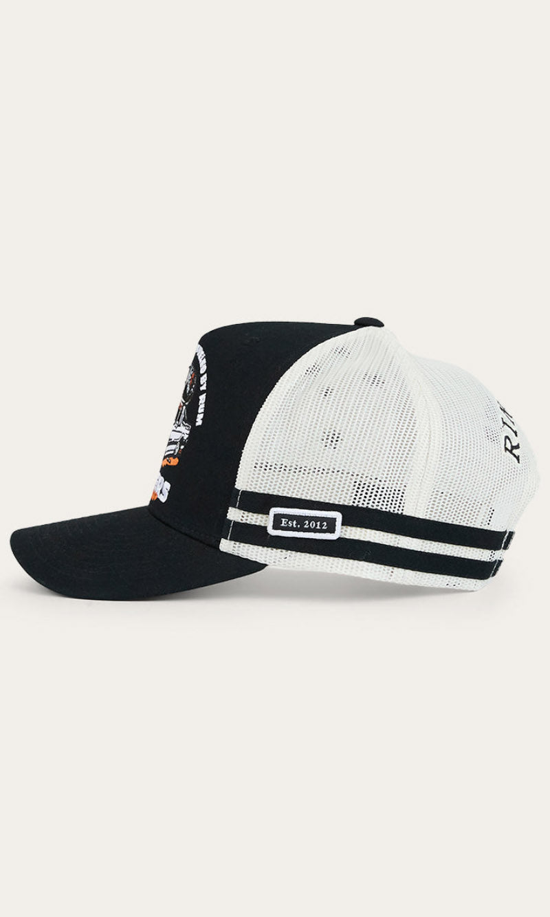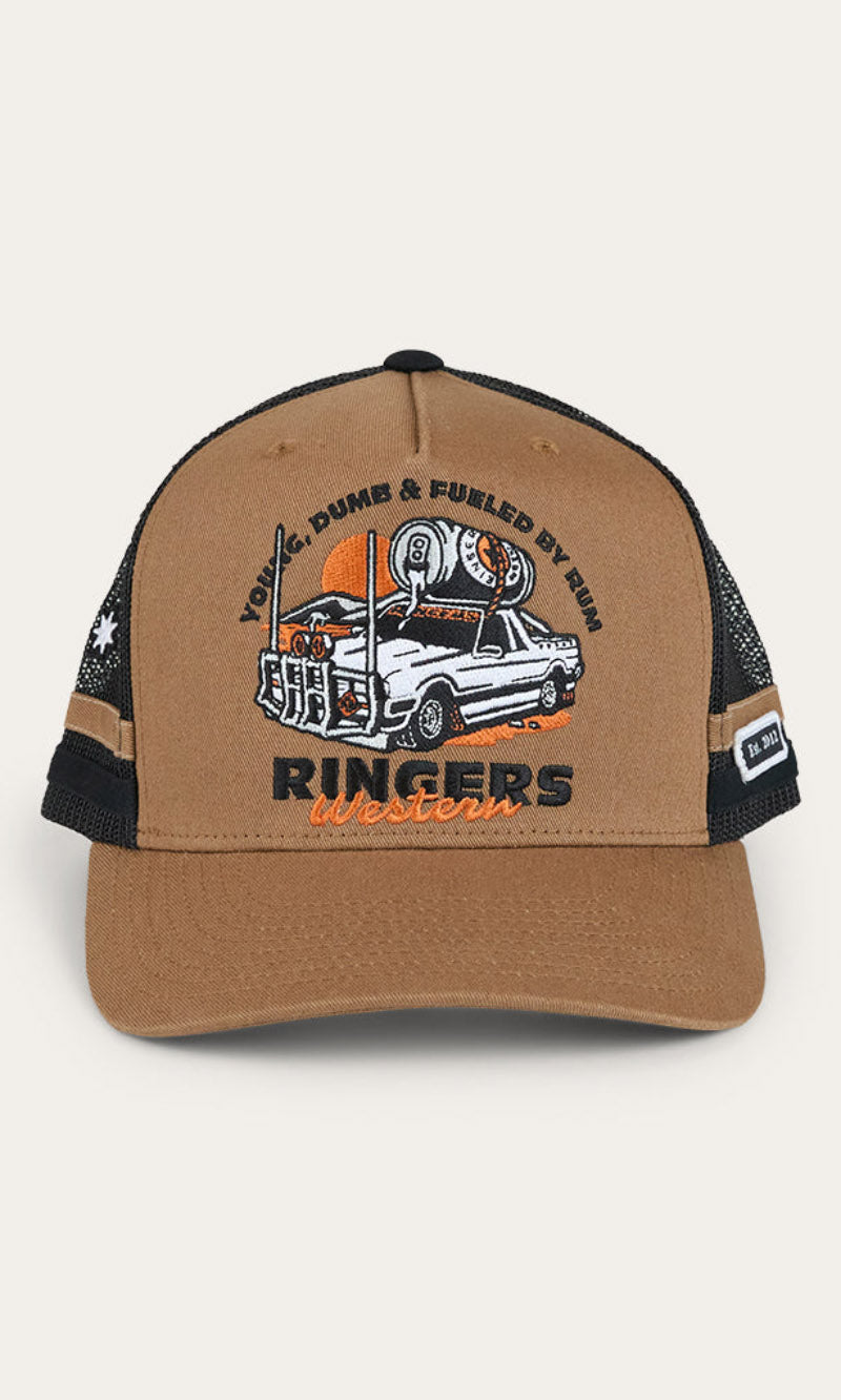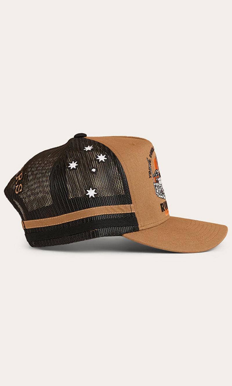 Our Ringers Western country trucker caps capture the heart and soul of everything we stand for. The Rum Runner Trucker Cap is a deep fit design and features a mesh back for optimal ventilation, perfect for hot summer days. A Rum Runner woven badge is complemented by twill side stripes whilst an adjustable snapback provides a customisable and comfortable fit.