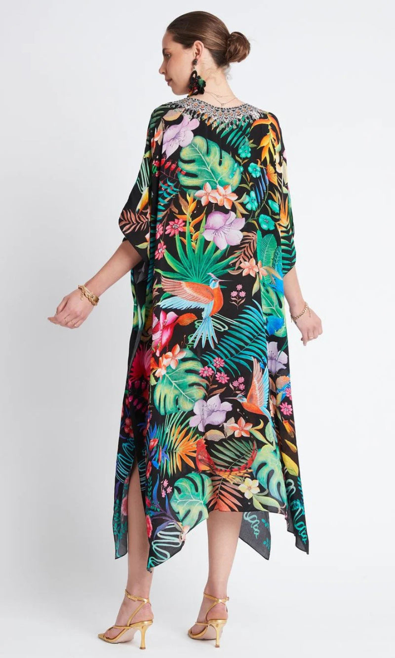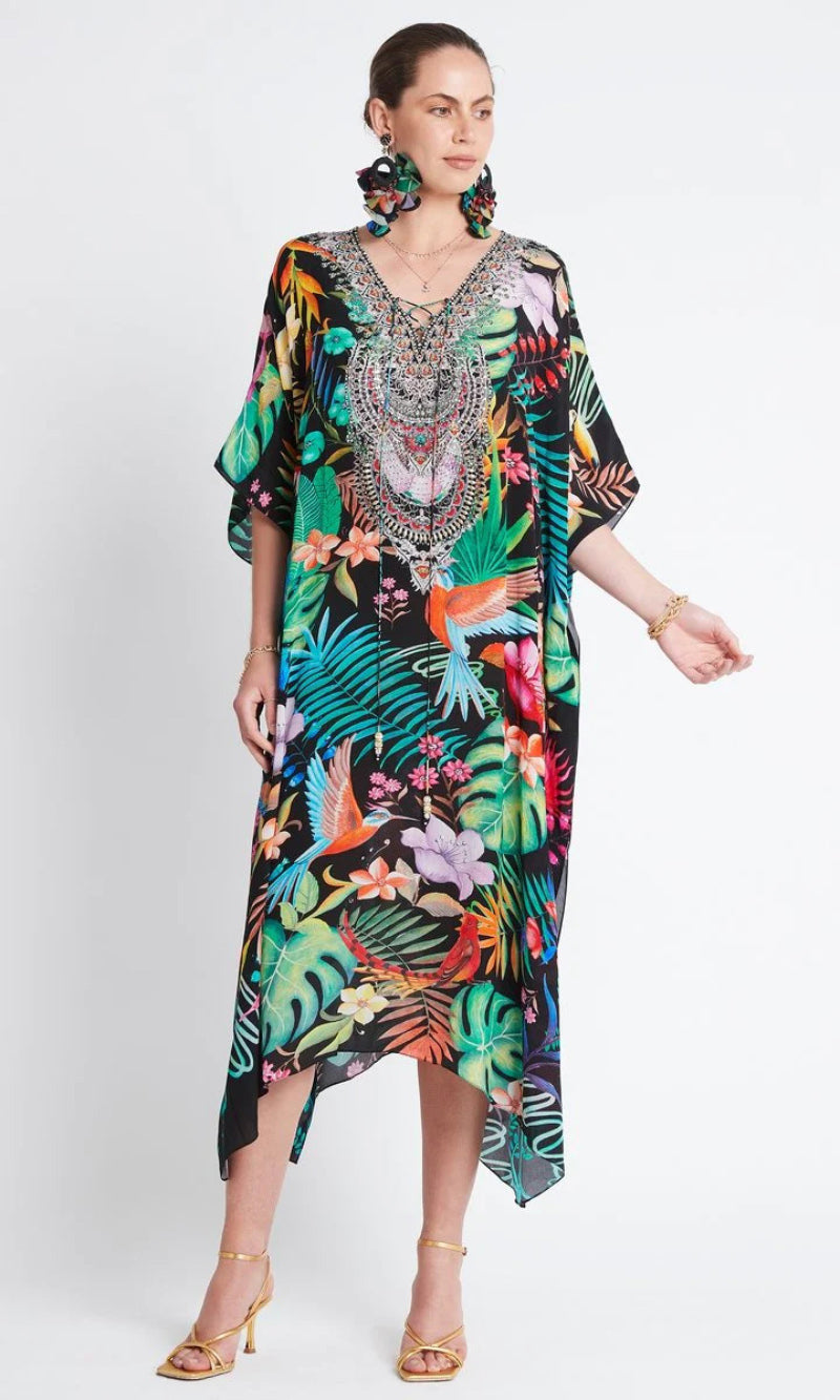 The A Night in Rio Medium Kaftan is a signature Czarina style that is eye-catching and opulent. Featuring a lace-up v-neckline with heavily embellished, hand-applied crystals, loose open sleeves, and a comfortable length that sits just below the knees. If you’re a fan of kaftans, you won’t want to miss this. Style belted at the waist or left open and loose, the kaftan looks effortless for day activities and dressed up for the night.